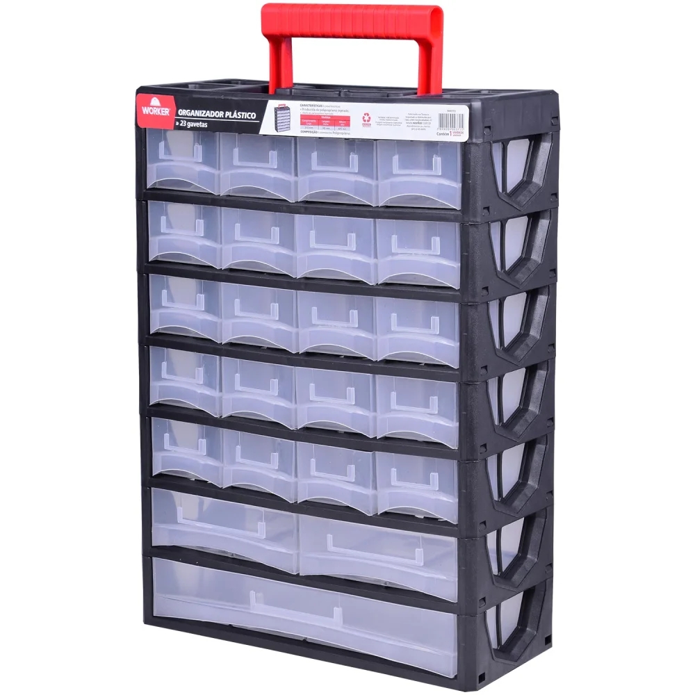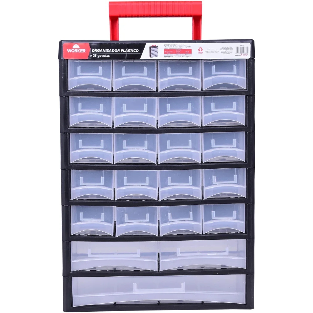Organizador Plástico Worker: Solução Completa para seus Objetos Mantenha seus itens organizados e sempre à mão com o Organizador Plástico Worker, modelo 940755. Projetado para otimizar o espaço e facilitar o acesso a pequenos objetos, este organizador é perfeito para oficinas, garagens, quartos, ou qualquer ambiente que necessite de organização. Com 23 gavetas transparentes, você visualiza rapidamente o conteúdo de cada compartimento, economizando tempo e evitando a bagunça. Fabricado em polipropileno injetado de alta qualidade, o organizador Worker garante durabilidade e resistência, protegendo seus pertences contra danos. Suas dimensões compactas (31.5 cm de largura, 44.5 cm de comprimento e 14 cm de profundidade) permitem que ele se adapte facilmente a diferentes espaços, sem ocupar muito espaço. Ideal para organizar parafusos, porcas, pregos, artigos de pesca, acessórios, ferramentas, materiais de escritório e muito mais. Invista em organização e tenha seus objetos sempre em ordem com o Organizador Plástico Worker. Especificações Marca: Worker Modelo: 940755 Cor: Preto Material: Plástico (Polipropileno injetado) Quantidade de compartimentos: 23 Largura: 31.5 cm Comprimento: 44.5 cm Profundidade: 14 cm Com rodas: Não Código universal de produto: 7899009003715 Itens Inclusos Organizador Plástico Worker 23 Gavetas Perguntas Frequentes (FAQ) Pergunta: Qual o material do organizador?Resposta: O organizador é fabricado em polipropileno injetado, um plástico resistente e durável. Pergunta: As gavetas são transparentes?Resposta: Sim, as 23 gavetas são transparentes, permitindo fácil visualização do conteúdo. Pergunta: O organizador possui rodas?Resposta: Não, este modelo não possui rodas. Pergunta: Qual a garantia do produto?Resposta: Garantia legal: 90 dias