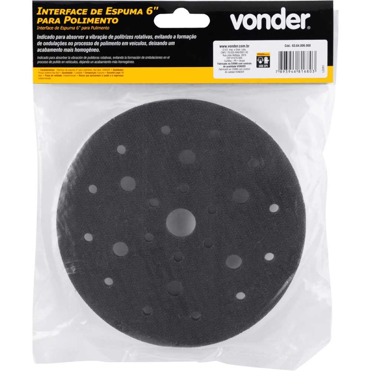 Código do Fornecedor: 6364006000Marca: VonderConteúdo da embalagem: 1 Interface.Destaques e diferenciais: Possui sistema fixa fácil.Aplicações e dicas de uso: Indicado para absorver a vibração de politrizes, evitando a formação de ondulações no processo de polimento em veículos, deixando um acabamento mais homogêneo, além de aumentar a vida útil da base da politriz.Garantia legal: 3 mesesQualificação TécnicaDiâmetro: 6" - 152,4 mm Altura: 13,5 mm Material (tipo/composição): Espuma Nº de furos: 25 Furos Massa aproximada (peso) (kg): 0,027 kg