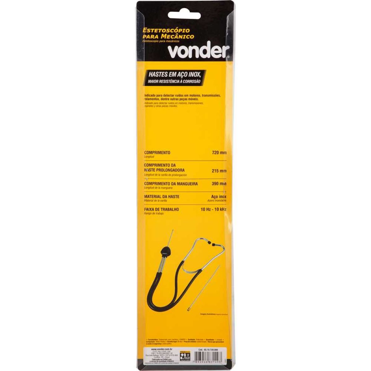 Cod. Fornecedor: 6510720000Marca: VonderConteúdo da embalagem: 1 Estetoscópio para mecânico.Destaques e diferenciais: Possui hastes em aço inox, proporcionando uma maior resistência à corrosão.Aplicações e dicas de uso: Indicado para detectar ruídos em motores, transmissões, rolamentos, dentre outras peças móveis. É um equipamento mecânico com uma haste em que as vibrações sonoras são transferidas diretamente ao aparelho auditivo do operador.Garantia legal: 90 diasQualificação TécnicaComprimento do estetoscópio para mecânico: 720 mm Comprimento da haste prolongadora: 215 mm Comprimento da mangueira: 390 mm Material da haste: Aço inox Material da mangueira: Polipropileno (PP) Faixa de trabalho: 10 Hz - 10 kHz Massa aproximada (peso) (kg): 0,160 kg