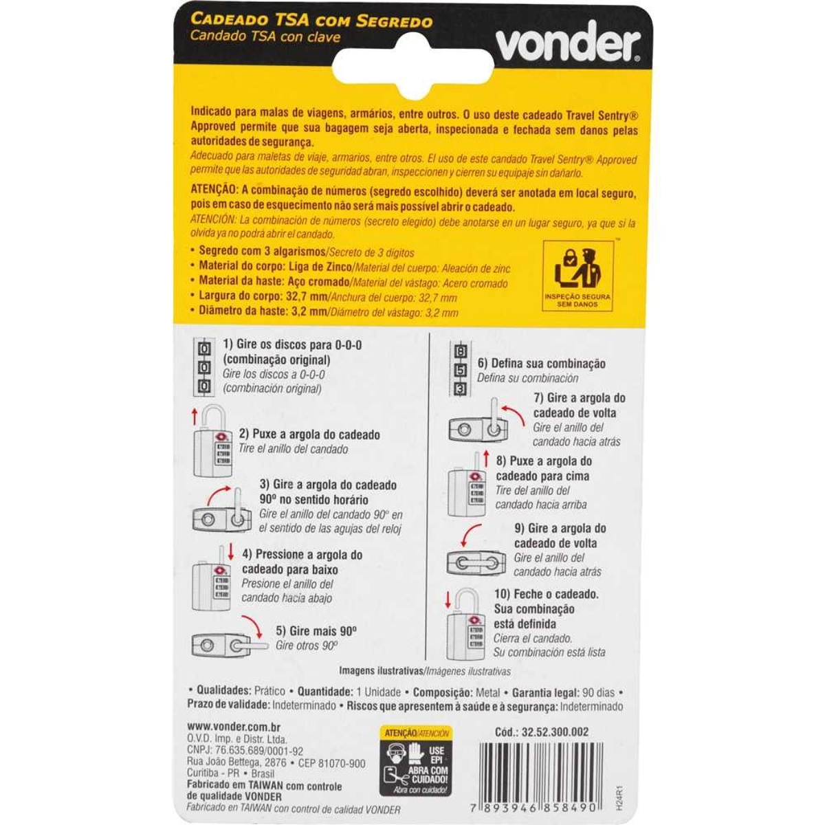 #html-body [data-pb-style=YTCO3YB]{justify-content:flex-start;display:flex;flex-direction:column;background-position:left top;background-size:cover;background-repeat:no-repeat;background-attachment:scroll}Cadeado Vonder com Segredo 3 Algarismos TSA Prata - Vonder Oficial Viajar com tranquilidade ou proteger seus pertences no dia a dia agora ficou muito mais fácil com o Cadeado Vonder com Segredo de 3 Algarismos TSA na cor Prata. Compacto, resistente e fácil de usar, esse cadeado é a escolha ideal para quem valoriza segurança, praticidade e conformidade com normas internacionais. Com certificação TSA (Travel Sentry® Approved), este cadeado permite que a sua bagagem seja inspecionada por autoridades aeroportuárias dos EUA e outros países sem ser danificada. Isso significa menos dores de cabeça em suas viagens e mais proteção para seus pertences. O sistema TSA garante que, em caso de vistoria, o cadeado seja aberto com uma chave mestra autorizada e, após a inspeção, fechado corretamente, mantendo o conteúdo da mala seguro e intacto. Fabricado com corpo em liga de zinco e haste em aço cromado, este cadeado reúne leveza e durabilidade, oferecendo alta resistência contra tentativas de violação. Seu segredo numérico de 3 algarismos permite até 1.000 combinações possíveis, proporcionando um bom nível de segurança com fácil memorização. A configuração inicial vem com o código padrão "000", que pode ser alterado de maneira simples para qualquer numeração de sua escolha. Com dimensões compactas (altura do corpo de 38,8 mm e largura de 32,7 mm), o Cadeado TSA Vonder é perfeito para malas de viagem, mochilas, armários de academia, armários corporativos, bolsas e estojos, sem adicionar peso ou volume desnecessário. Seu design prateado, discreto e elegante, combina bem com qualquer estilo de bagagem ou uso pessoal. Especificações- Tipo de trava: Segredo numérico- Segredo do cadeado: 3 Algarismos- Material do corpo do cadeado: Liga de Zinco- Material da haste do cadeado: Aço cromado- Altura do corpo: 38,8 mm- Largura do corpo: 32,7 mm- Espessura do corpo: 14,2 mm- Altura útil do cadeado: 18,5 mm- Altura útil do cadeado: 18,5 mm- Diâmetro da haste: 3,2 mm- Cor: Cinza- Massa aproximada (peso) (kg): 0,057 kg Itens inclusos- 1 Cadeado com Segredo 3 Algarismo TSA Prata Vonder Garantia- 03 meses com o fabricante