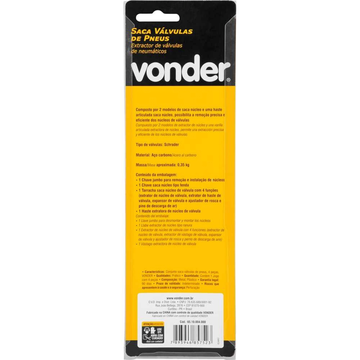 #html-body [data-pb-style=AFQYJOD]{justify-content:flex-start;display:flex;flex-direction:column;background-position:left top;background-size:cover;background-repeat:no-repeat;background-attachment:scroll}Conjunto Saca Válvula de Pneus Vonder com 4 Peças - Vonder Oficial Se você realiza manutenções em pneus, seja em automóveis, motos ou bicicletas, sabe que contar com as ferramentas certas faz toda a diferença em agilidade e segurança. O Conjunto Saca Válvula de Pneus Vonder com 4 Peças é a solução ideal para quem busca eficiência, praticidade e durabilidade em um kit compacto e versátil. Desenvolvido especialmente para a remoção precisa de núcleos de válvulas do tipo Schrader, este conjunto profissional é composto por duas versões de saca núcleo, uma haste articulada que facilita o acesso em locais mais difíceis e uma chave jumbo robusta, projetada especificamente para a instalação segura dos núcleos. Ou seja, você tem em mãos tudo o que precisa para realizar o trabalho com rapidez e precisão, reduzindo o tempo de serviço e evitando danos às válvulas. Fabricadas em aço carbono de alta qualidade, as peças do kit garantem resistência e durabilidade superior, mesmo em usos intensos ou ambientes de oficina. O acabamento cuidadoso proporciona um manuseio confortável, evitando escorregamentos e aumentando a segurança durante o uso. Com apenas 350 gramas de peso, este conjunto é leve, fácil de transportar e ocupa pouco espaço na maleta de ferramentas, o que o torna perfeito tanto para profissionais quanto para usuários domésticos que valorizam um trabalho bem feito. Compatível com a maioria das válvulas encontradas em pneus de carros, motos e bicicletas, o Conjunto Saca Válvula Vonder é ideal para borracharias, mecânicas, bicicletarias e até mesmo para o ciclista ou motorista que gosta de cuidar do próprio veículo com responsabilidade e eficiência. Especificações- Material (tipo/composição): Aço carbono- Tipo de válvulas: Schrader- Quantidade de peças: 4 peças- Massa aproximada (peso) (kg): 0,350 kg Itens inclusos- 1 Conjunto Saca Válvula de Pneus com 4 Peças Vonder Garantia- 03 meses com o fabricante
