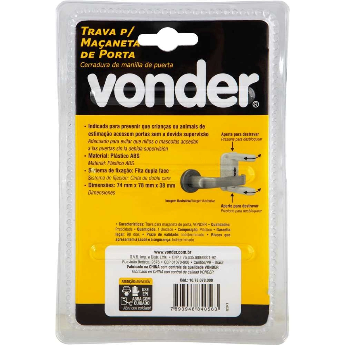 Trava para Maçaneta de Porta VonderDesenvolvida com foco na proteção e no conforto do dia a dia, essa trava é a combinação perfeita entre funcionalidade, facilidade de uso e durabilidade — atributos que fazem dela um item indispensável em lares, escolas, consultórios e escritórios.Produzida com plástico resistente de alta qualidade, a Trava Vonder se destaca pelo seu excelente desempenho em manter portas travadas de forma confiável. Seu sistema de fixação conta com um adesivo de forte aderência, garantindo que a trava permaneça firmemente no lugar mesmo com o uso constante. Isso elimina a necessidade de ferramentas ou conhecimentos técnicos para instalação: em poucos segundos, qualquer pessoa consegue aplicar a trava com segurança.Um dos principais diferenciais está no seu design universal, projetado para se adaptar facilmente à maioria dos modelos de maçanetas do mercado. Essa versatilidade torna o produto extremamente prático, permitindo seu uso em diferentes cômodos e portas, sem a necessidade de personalizações ou ajustes complicados.Do ponto de vista da segurança, a Trava para Maçaneta de Porta Vonder cumpre um papel fundamental. Evita que crianças pequenas abram portas indevidamente, reduzindo os riscos de acidentes domésticos, como o acesso a escadas, banheiros, cozinhas ou áreas externas. Da mesma forma, impede que animais de estimação entrem em locais indevidos, preservando tanto os espaços quanto a segurança dos bichinhos.A instalação é intuitiva e não danifica a porta nem a maçaneta. Basta remover o protetor do adesivo e pressionar a trava no local desejado. Em poucos segundos, sua casa estará mais protegida, e você mais tranquilo.Especificações- Material: Plástico ABS- Dimensões: 74 mm x 78 mm x 38 mm- Sistema de fixação: Fita dupla face- Massa aproximada (peso): 0,048 kgItens inclusos- 01 Trava para Maçaneta de Porta VonderGarantia- 03 meses com o fabricante