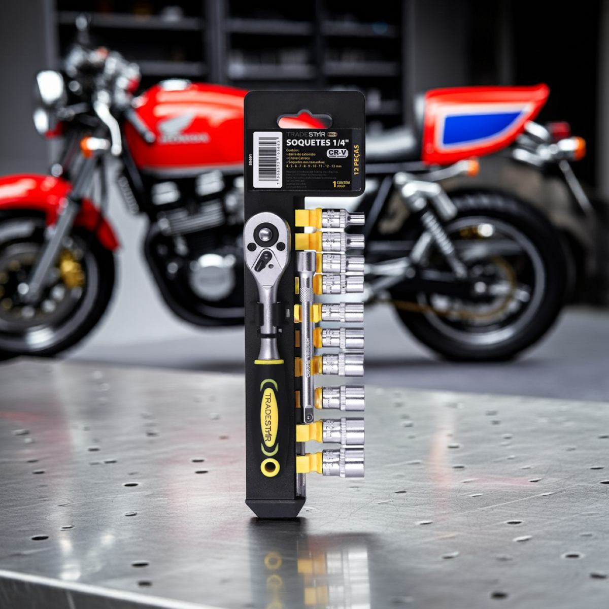 Kit Chave Catraca e Soquetes Tradestar Pro 1/4" 4 até 13 mm Cromo VanádioO Kit Chave Catraca e Soquetes Tradestar Pro 1/4" é a escolha ideal para profissionais e entusiastas que buscam praticidade, precisão e durabilidade em trabalhos de aperto e desaperto de porcas e parafusos. Fabricado em aço cromo vanádio, este kit oferece resistência a desgaste e longa vida útil, garantindo desempenho confiável em cada utilização.Composto por uma chave catraca, barra de extensão e 10 soquetes nos tamanhos de 4 a 13 mm, o kit é versátil e atende a diferentes necessidades, proporcionando agilidade e eficiência em oficinas, serviços de manutenção, montagens e projetos DIY. A combinação de catraca com soquetes facilita o trabalho em locais de difícil acesso, permitindo aperto rápido e seguro sem esforço excessivo. Perfeito para mecânicos, técnicos, montadores e qualquer profissional que precise de uma ferramenta confiável e durável para trabalhos diários.Especificações- Material: Aço cromo vanádio (CRV)- Tamanho do encaixe: 1/4"- Composição do kit: 1 chave catraca, 1 barra de extensão, 10 soquetes 1/4" (4 mm, 5 mm, 6 mm, 7 mm, 8 mm, 9 mm, 10 mm, 11 mm, 12 mm e 13 mm)- Indicado para: apertar e soltar porcas e parafusosItens inclusos- 1 Jogo Soquete 1/4" 4-13 mm 12 Peças Crv ProGarantia- 03 meses com o Fabricante