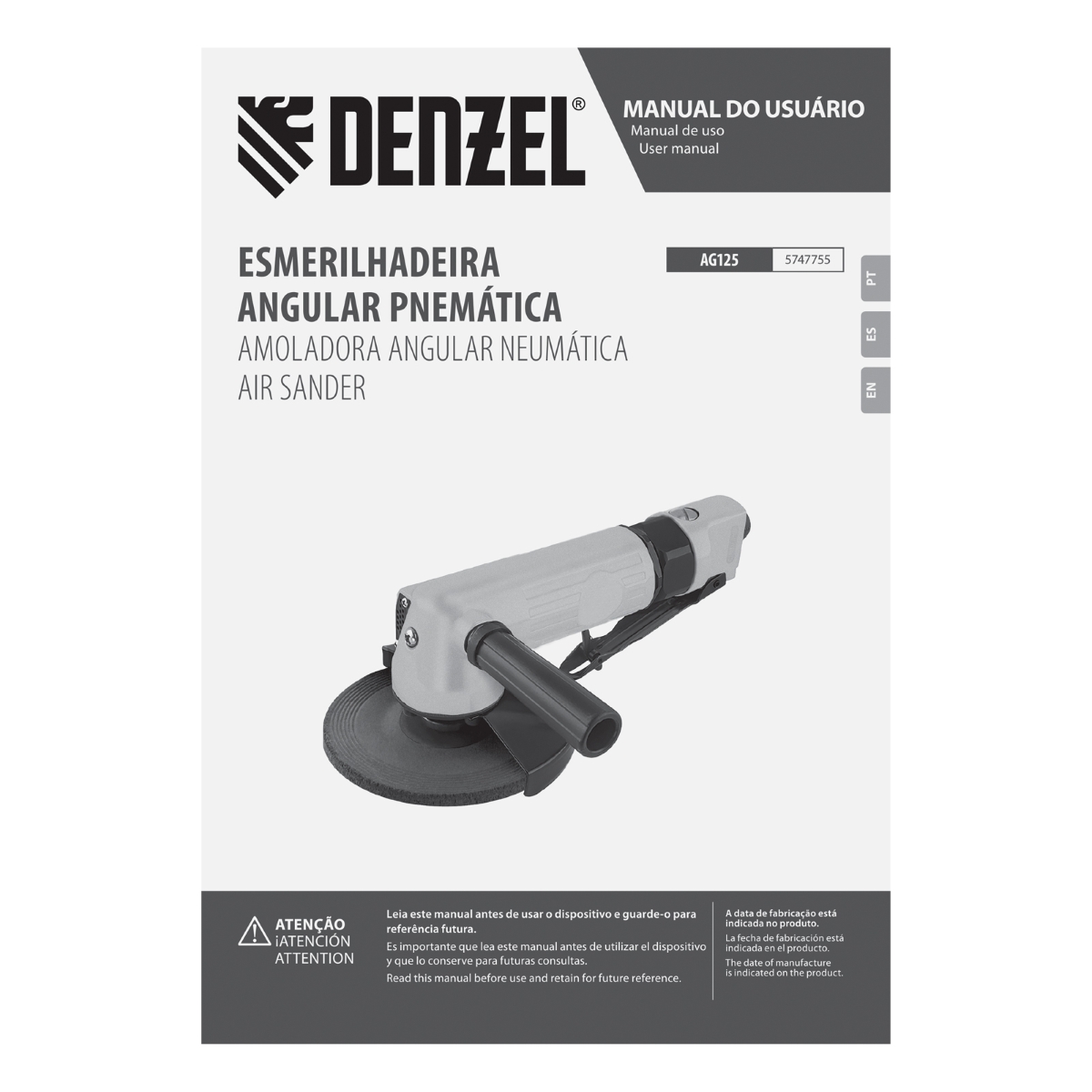 Esmerilhadeira Pneumática Denzel AG125: Corte e Acabamento com Alta Performance A Esmerilhadeira Pneumática Denzel AG125 5747755 é a solução ideal para profissionais e entusiastas que buscam potência, precisão e durabilidade em uma ferramenta pneumática. Projetada para esmerilar, limpar e cortar diversos materiais como madeira, metal e plástico, esta esmerilhadeira oferece 11000 rpm de alta velocidade, garantindo eficiência em cada aplicação. Seu corpo em alumínio resistente assegura longa vida útil, mesmo em condições de trabalho exigentes. A alça lateral removível proporciona maior conforto e versatilidade, permitindo alcançar áreas de difícil acesso. Com consumo de ar de 186 L/min e pressão máxima de 6,3 bar, a AG125 oferece desempenho consistente e otimizado. Invista em uma ferramenta que combina segurança, ergonomia e alta eficiência para seus projetos. Especificações Diâmetro do disco: 125 mm Velocidade de rotação: 11000 rpm Consumo de ar: 186 L/min Pressão máxima: 6.3 bar Material do corpo: Alumínio Conector de ar: 1/4\" Itens Inclusos Esmerilhadeira Pneumática Denzel AG125 Chaves para instalação do disco Encaixe para mangueira Perguntas Frequentes (FAQ) Pergunta: Qual o tipo de conexão de ar da esmerilhadeira?Resposta: A esmerilhadeira possui conexão de ar de 1/4\". Pergunta: Qual o material do corpo da esmerilhadeira?Resposta: O corpo da esmerilhadeira é fabricado em alumínio, garantindo durabilidade e resistência. Pergunta: A esmerilhadeira vem com disco?Resposta: Não, a esmerilhadeira não acompanha disco. O disco deve ser adquirido separadamente.