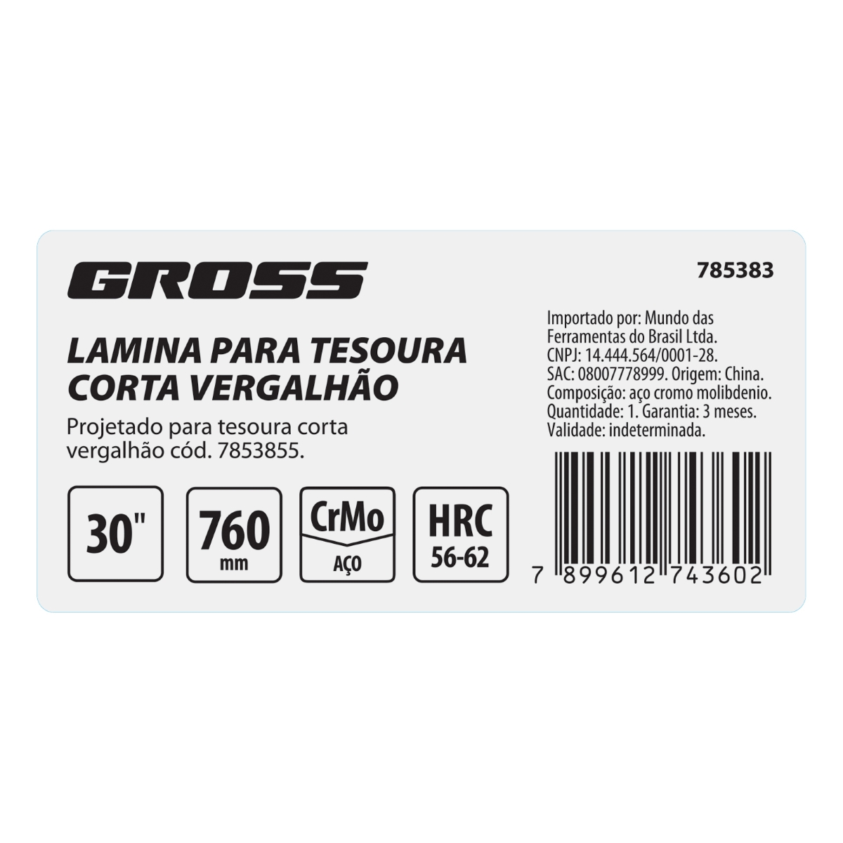 Lâmina Para Tesoura Corta Vergalhão 760mm 30pol Aço Cr-Mo Gross 7853855