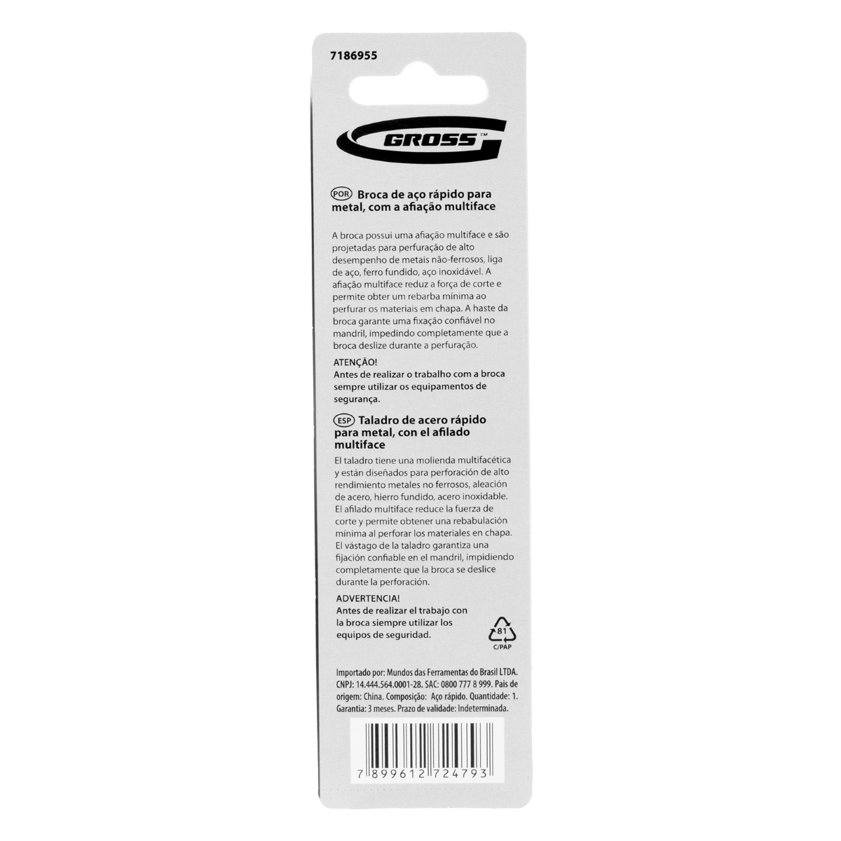 Broca Aço Rápido Profissional para Metal 3/16" x 86mm - Precisão e Durabilidade A Broca Aço Rápido Gross 7186955 é a ferramenta ideal para quem busca precisão e eficiência na hora de perfurar metais. Fabricada com aço rápido de alta qualidade, esta broca garante cortes limpos e precisos em uma variedade de materiais, como metais coloridos, aço inoxidável e ferro fundido. Com um comprimento de 86 mm e diâmetro de 3/16" (4,763 mm), ela atende a diversas necessidades, tanto em aplicações profissionais de mecânica quanto em projetos de bricolagem em casa. O ângulo de afiação de 135° otimiza a perfuração, reduzindo o esforço e garantindo um trabalho mais rápido e produtivo. Sua classificação de precisão A assegura resultados consistentes e de alta qualidade, enquanto a superfície polida e o design espiral facilitam a remoção dos cavacos, aumentando a eficiência da perfuração. A resistência ao desgaste, com dureza de 59-63 HRC, garante a durabilidade da broca, minimizando a necessidade de substituições frequentes. Além disso, o design do caule impede que a broca gire no mandril, proporcionando uma operação segura e estável. A embalagem blister com gancho para pendurar facilita o armazenamento e a organização da ferramenta, tornando-a prática e acessível sempre que você precisar. Especificações Material: Aço Rápido Comprimento: 86 mm Diâmetro de Perfuração: 3/16" (4,763 mm) Ângulo de Afiação: 135° Classe de Precisão: A Dureza: 59-63 HRC Itens Inclusos Broca Aço Rápido Gross 7186955 Perguntas Frequentes (FAQ) Pergunta: Em quais materiais posso usar esta broca?Resposta: Esta broca é ideal para perfurar metais coloridos, aço inoxidável e ferro fundido. Pergunta: Qual a durabilidade desta broca?Resposta: Fabricada em aço rápido com dureza de 59-63 HRC, a broca oferece alta resistência ao desgaste e longa durabilidade. Pergunta: A broca é adequada para uso profissional?Resposta: Sim, a broca possui classificação de precisão A e é adequada tanto para aplicações profissionais de mecânica quanto para uso doméstico. Pergunta: Qual a garantia do produto?Resposta: Garantia legal: 90 dias.