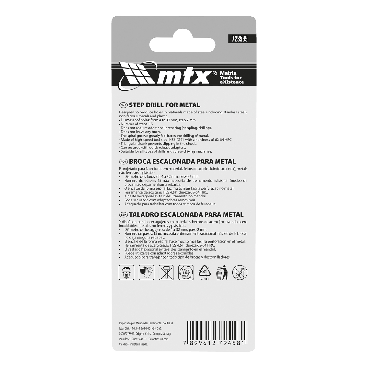 Broca Escalonada 4-32mm Aço Rápido HSS Triangular Nitreto de Titânio 1PC MTX 723599