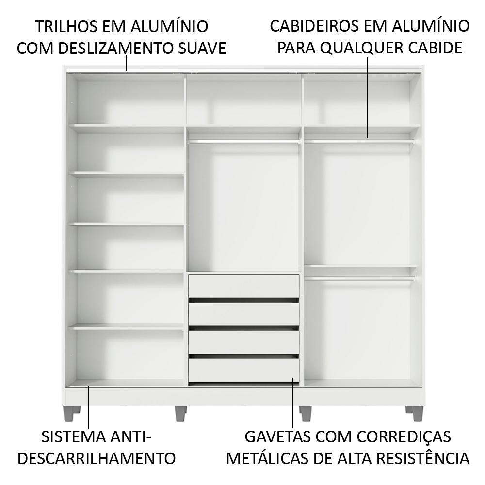 O Guarda-Roupa Eros da Madesa é feito em 100% MDF e com ferragens de alta qualidade. O destaque fica para a ótima distribuição interna, uma das mais maiores da categoria.Internamente, conta com quatro gavetas espaçosas e resistentes, com corrediças metálicas. Os três tubos cabideiros em alumínio comportam qualquer tamanho de cabide. Ou seja, o espaço é perfeito para uma melhor organização de roupas, sapatos, acessórios, edredons e travesseiros.As portas de correr com puxadores em alumínio possuem deslizamento suave e são muito práticas no dia a dia. Sem comprometer a circulação, oferecem um ganho de espaço enorme. Além disso, a porta espelhada amplia o ambiente e traz muita sofisticação ao móvel.Neste modelo, possui pés reguláveis em PVC que conferem beleza e uma melhor sustentação.O acabamento interno e externo é branco e todas as portas possuem pintura branca em um lado e pintura em amadeirado Rustic no outro. Assim, você pode fazer a escolha no momento da montagem. O processo é feito em Pintura Poliéster de alta resistência que aumenta a durabilidade do móvel. Além disso, é ecológico, livre de vapores que prejudicam a atmosfera.Medidas totais do armário: 228 cm de altura x 231 cm de largura x 55 cm de profundidade.Imagem meramente ilustrativa.Itens inclusos:- Três (3) cabideiros- Quatro (4) gavetas internas- Oito (8) prateleiras- Três (3) portas de correr, sendo duas (2) de madeira e uma (1) de espelho, apresentando sistema anti-descarrilhamento e puxadores em alumínio em toda a extensão das portas- Um (1) kit com oito (8) pés em PVCCódigo do produto: 11639B1E1BCPObs.: A Madesa não disponibiliza serviço de montagem. O produto segue com manual de instalação e todas as ferragens necessárias para sua montagem.1-O produto é novo ou usado?R.: Todos os produtos da Madesa são novos, enviados da nossa fábrica diretamente para as casas de nossos clientes.2-O produto vem montado? Se não, vocês realizam a montagem?R.: A Madesa não disponibiliza serviço de montagem. Todos os produtos seguem com manual de instalação e as ferragens necessárias. Alguns produtos possuem vídeo explicando o passo a passo da montagem.3-Vocês possuem loja física? Posso retirar meu produto em mãos?R.: Não possuímos loja física, apenas loja virtual. Confira as opções de envio ao colocar o seu CEP.4-Qual é o valor do envio? Posso pagar separadamente?R.: O valor do envio é calculado com base no peso e volume do produto, e no CEP de destino. Você pode calcular o valor e prazo de entrega no simulador.5-A Madesa entrega em todo Brasil? Como é feita a entrega?R.: Sim, entregamos no Brasil inteiro através de transportadoras parceiras.6-O produto acompanha Nota Fiscal?R.: Sim, todos os produtos são entregues com suas respectivas notas fiscais.7-Os produtos possuem garantia?R.: Sim. A Madesa oferece 3 meses de garantia para defeitos de fabricação.A Madesa se dedica à sustentabilidade com várias iniciativas: temos uma usina própria para gerar energia que abastece uma de nossas fábricas. Selecionamos nossos fornecedores, priorizando aqueles que possuem um compromisso com a sustentabilidade e proteção do meio ambiente. Todo o plástico utilizado no setor produtivo é proveniente de reciclagem e as suas sobras são encaminhadas ao fornecedor que os recicla. Também investimos no desenvolvimento contínuo de nossos colaboradores e em ações educacionais que beneficiem a comunidade.