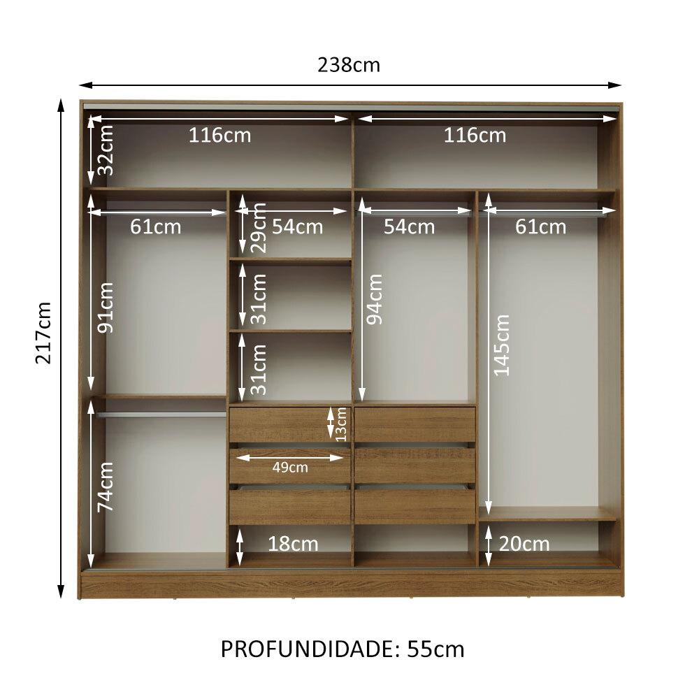 O Guarda-Roupa Apolo da Madesa é a opção perfeita para quem procura um móvel com muito espaço, design moderno e materiais de qualidade. São seis gavetas centrais com corrediças metálicas, quatro cabideiros metálicos muito resistentes e várias prateleiras.As portas de correr vêm com sistema de fácil ajuste para melhor funcionamento e os puxadores em alumínio enobrecem o armário. Seu espaço interno é perfeito para um casal, com vãos livres e amplos para total aproveitamento do espaço e ótimo tamanho.O acabamento interno e externo é no padrão amadeirado Rustic e as costas são brancas.Medidas totais: 217 cm de altura x 238 cm de largura x 55 cm de profundidade.Itens inclusos no armário:- Quatro (4) cabideiros metálicos- Seis (6) gavetas com corrediças metálicas- Oito (8) prateleiras- Quatro (4) portas de correr de madeira com puxadores em alumínioCódigo do produto: 16685Z7Obs: Imagens meramente ilustrativas. A Madesa não disponibiliza serviço de montagem. O produto segue com manual e todas as ferragens necessárias para a instalação.A Madesa se dedica à sustentabilidade com várias iniciativas: temos uma usina própria para gerar energia que abastece uma de nossas fábricas. Selecionamos nossos fornecedores, priorizando aqueles que possuem um compromisso com a sustentabilidade e proteção do meio ambiente. Todo o plástico utilizado no setor produtivo é proveniente de reciclagem e as suas sobras são encaminhadas ao fornecedor que os recicla.