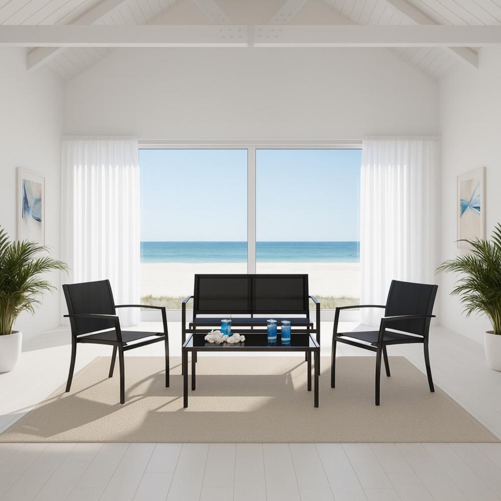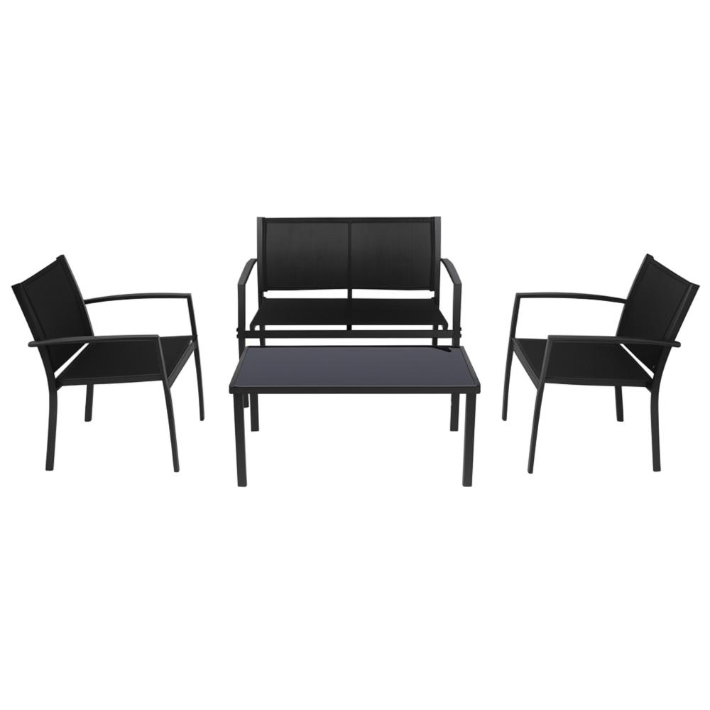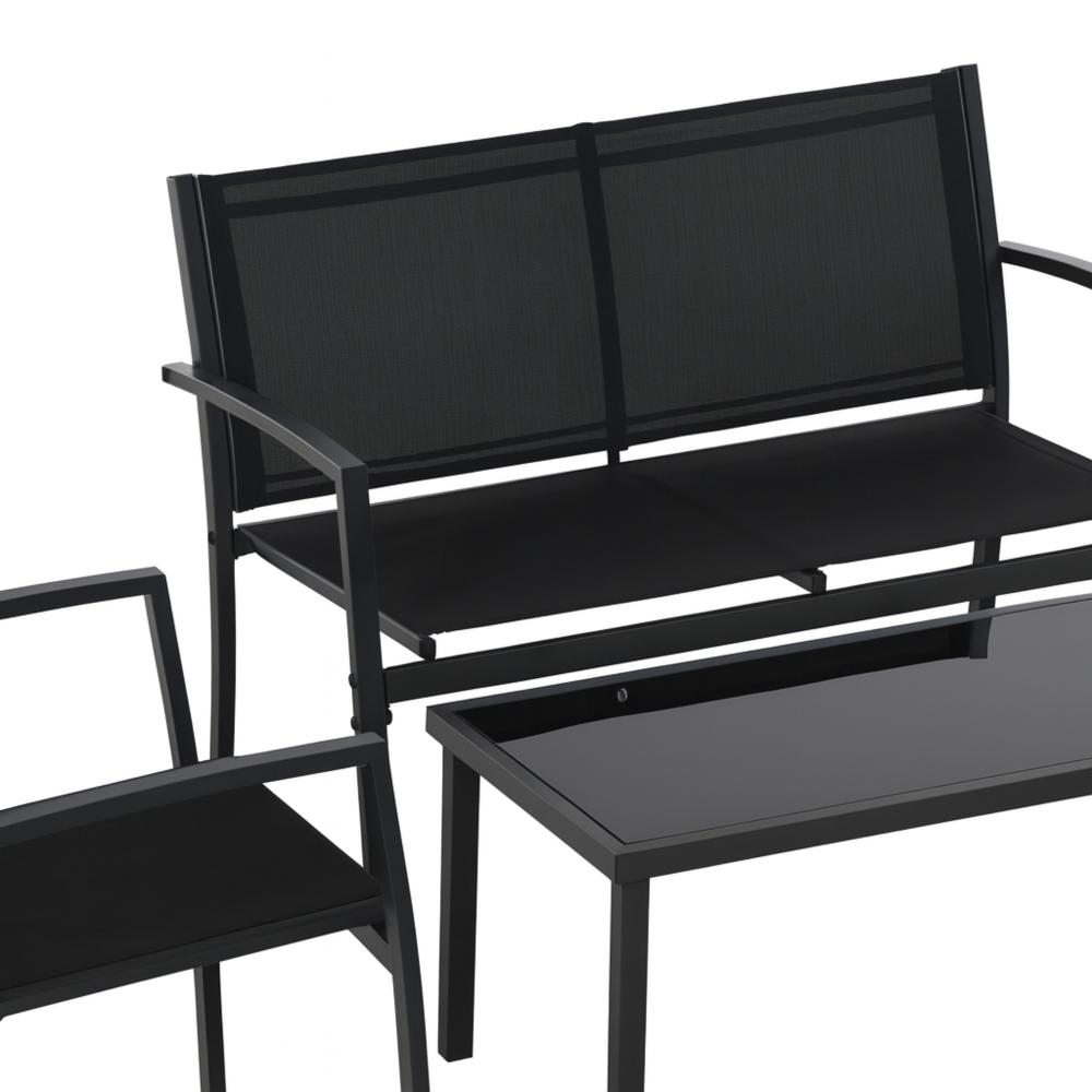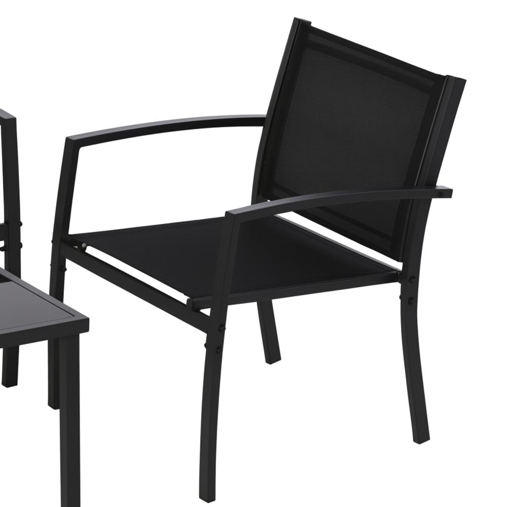 O Conjunto Terraço Relax Área Externa 4 peças Preto combina design moderno, conforto e praticidade para transformar a área externa da sua casa em um verdadeiro refúgio. Ideal para relaxar e aproveitar momentos ao ar livre com estilo e elegância.Características:- Material de Qualidade: Estrutura em aço com pintura eletrostática, garantindo proteção anticorrosiva contra ferrugem e desgaste ao longo do tempo.- Conforto e Resistência: Assentos e encostos em tela sintética de poliéster com PVC, proporcionando conforto, ventilação e alta resistência ao sol e umidade.- Mesa com Tampo de Vidro Temperado: O tampo de vidro temperado preto é resistente a impactos e fácil de limpar, adicionando um toque de sofisticação ao conjunto.- Durabilidade: Parafusos e ferragens em aço galvanizado com acabamento anticorrosivo, garantindo maior durabilidade e segurança.Cuidados:- Recomenda-se não utilizar produtos abrasivos para limpeza, garantindo a manutenção da beleza e qualidade do conjunto.Dimensões:- Cadeira individual: 107 × 62,5 × 78 cm- Cadeiras duplas: 60 × 62,5 × 78 cm- Mesa de centro com tampo de vidro temperado: 90 × 50 × 41 cmO Conjunto Terraço Relax Área Externa 4 peças Preto é a escolha perfeita para quem busca transformar sua área externa em um ambiente acolhedor e elegante. Aproveite momentos de lazer com conforto e estilo! Acompanha 3 cadeiras e 1 mesa, com kit de montagem para facilitar a instalação.Transforme sua área externa em um refúgio com o Conjunto Terraço Relax Área Externa 4 peças Preto. Com estrutura resistente em aço, tela sintética de alta qualidade e mesa com tampo de vidro temperado, oferece conforto, durabilidade e sofisticação. Aproveite momentos ao ar livre com estilo e elegância!