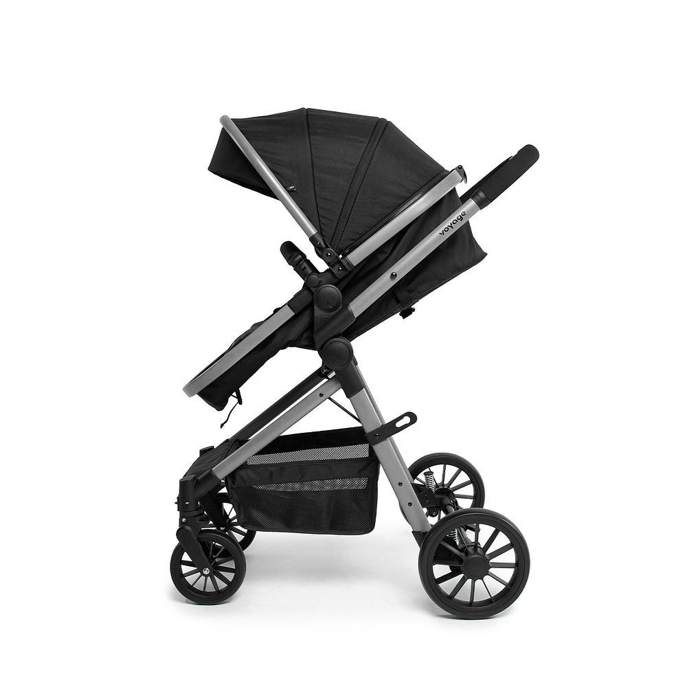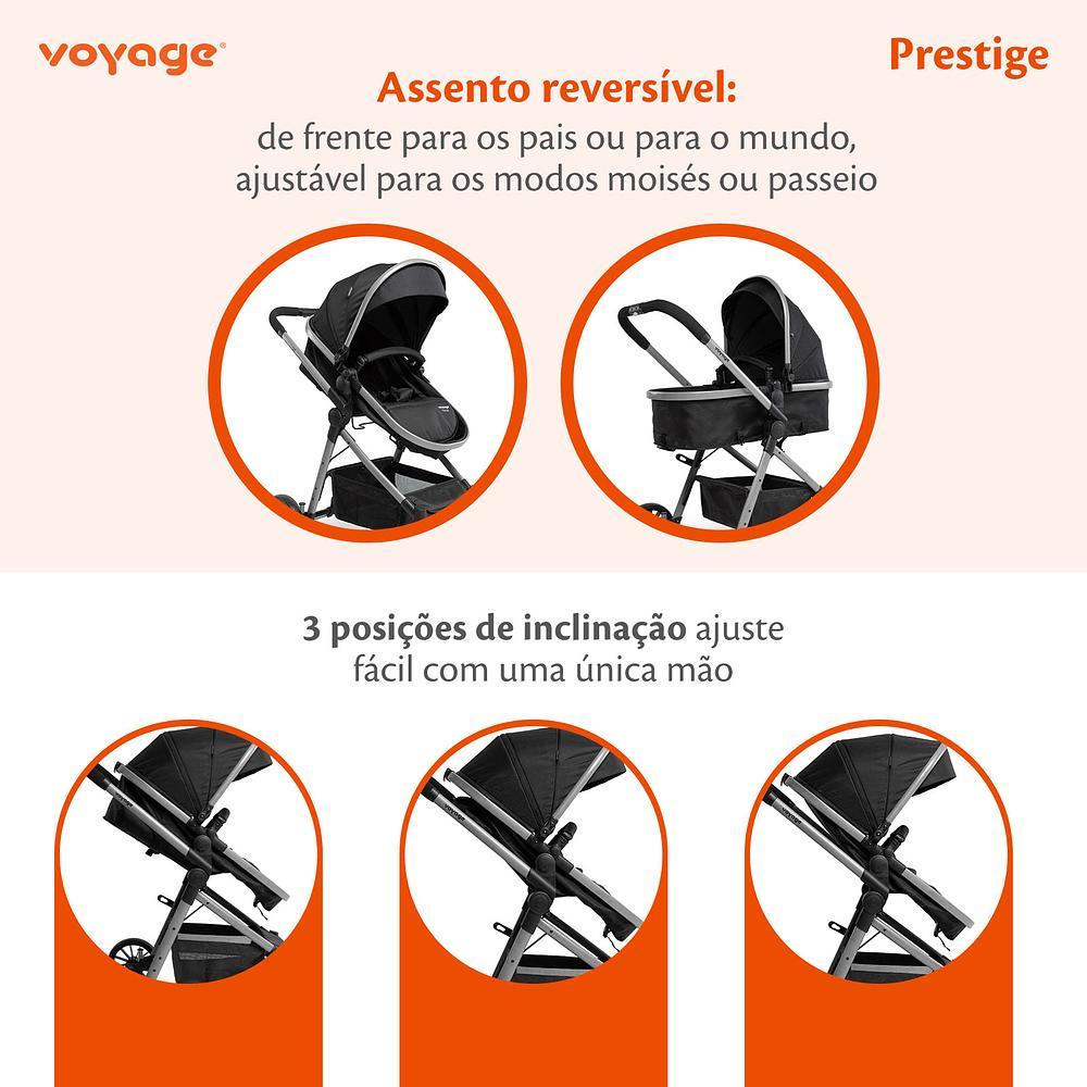 Carrinho de Bebê Prestige - VoyageO Prestige é um item que traz um novo nível de conveniência e conforto para as saídas com o seu bebê. Combinando versatilidade e segurança, ele foi projetado para acompanhar cada etapa do crescimento do seu filho.Características:•Assento Reversível: Posicionado de frente para os pais nos primeiros meses e virado para o mundo quando começa a explorar, o assento promove interação e segurança.•Proteção: Com capota equipada com FPS 50, aba de sol e janela de ventilação, seu filho fica protegido dos raios UV e tem um ambiente arejado.•Rodas Robustas: As 4 rodas, equipadas com amortecedores, transitam suavemente entre diferentes terrenos, garantindo o conforto do pequeno passageiro.•Flexibilidade e Controle: As rodas dianteiras giram 360° e possuem travas, oferecendo liberdade para manobrar ou a estabilidade de um movimento linear.•Capacidade de Armazenamento: O cesto espaçoso suporta até 2,5 kg, tornando-se extremamente prático para levar todos os itens essenciais do bebê.•Conforto Ajustável: 3 inclinações do assento e múltiplos ajustes do encosto permitem encontrar a posição perfeita, inclusive o modo moisés antirrefluxo, com facilidade de alteração mesmo com uma mão.•Praticidade no Uso Diário: A barra frontal tem abertura para facilitar o acesso ao bebê, enquanto o cinto de 5 pontos com protetores acolchoados garante segurança.•Fechamento Compacto: Com assento dobrável, o Prestige fecha de forma compacta, simplificando o armazenamento e o transporte.•Compatibilidade: Acompanha adaptadores para o Bebê Conforto Beta* da Voyage (vendido separadamente).O Carrinho Prestige é a definição de funcionalidade inteligente. Com ajustes simples e proteção adequada para cada fase do crescimento do bebê, este carrinho se destaca no mercado. Oferece aos pais a tranquilidade de um produto seguro e confortável para o bebê, sem abrir mão de um design elegante.*O Bebê Conforto Beta da Voyage é vendido separadamente