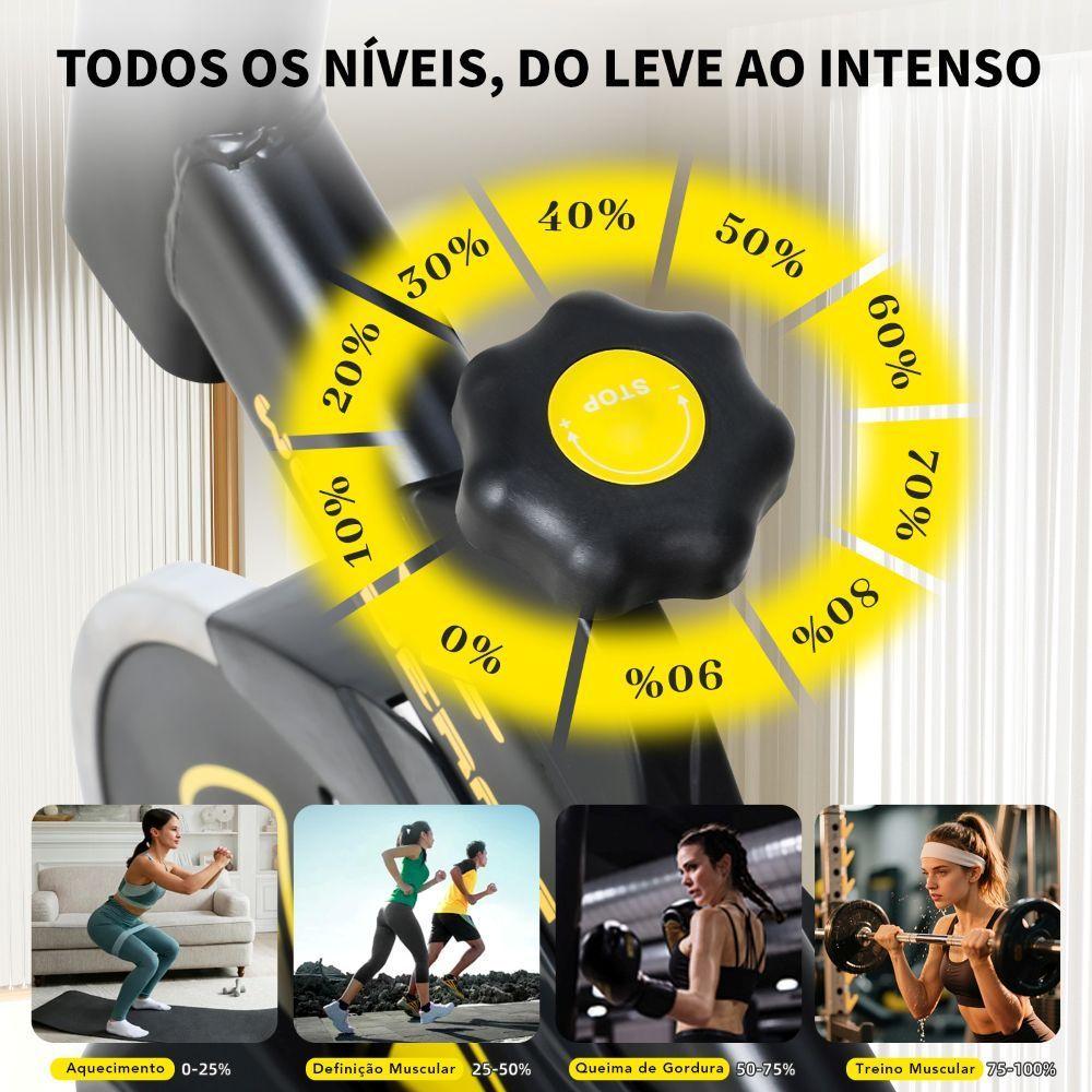 Bicicleta Spinning Mecânica Wonderfit Go Amarela Roda De Inercia 4kg (WSB04HBTA-AM)Garanta mais saúde, energia e qualidade de vida com a Bicicleta Ergométrica Spinning Mecânica Wonderfit. Com sistema de resistência mecânico, o modelo é ideal para treinos iniciais e residenciais, oferecendo conforto e desempenho para quem quer praticar exercícios aeróbicos sem sair de casa. Ela conta com roda de inércia de 4 kg, selim e apoios de braço ajustáveis e monitor com leitura de dados essenciais para o acompanhamento do treino. Seu funcionamento por correia proporciona pedaladas suaves Com design moderno, é uma ótima opção para quem busca praticidade e motivação para treinar todos os dias.Características do Produto:Design compacto e eficiente: Com estrutura em tubo de aço e acabamento moderno, é perfeita para quem quer montar um espaço fitness em casa com conforto e segurança.Roda de inércia de 4 kg: Ideal para treinos leves e moderados, com pedaladas mais estáveis que contribuem para o desenvolvimento do condicionamento físico.Sistema de resistência mecânico: O ajuste é feito manualmente por meio de botões “+” e “–”, o que permite adaptar a intensidade do treino conforme o seu objetivo.Transmissão por correia: Além de suave, a correia exige menos manutenção do que sistemas de corrente, oferecendo maior durabilidade ao equipamento.Display com funções essenciais: O painel digital exibe informações como tempo, velocidade, distância, calorias, modo SCAN e odômetro (ODO), auxiliando no monitoramento da performance durante os treinos.Ajustes ergonômicos: Tanto o assento quanto os apoios de braço podem ser regulados para se adequar à altura do usuário, proporcionando maior conforto e segurança.Freio de segurança: O equipamento conta com sistema de parada rápida para garantir a segurança em caso de necessidade durante o exercício.Rodas para transporte integradas: Facilita o deslocamento da bike dentro de casa, tornando o equipamento mais prático e funcional no dia a dia.Com suporte para celular: A base permite que você posicione seu celular com segurança durante o treino, ideal para quem gosta de acompanhar vídeos, ouvir música ou usar apps de treino.Dúvidas Frequentes:A bicicleta é mecânica ou magnética?Este modelo é mecânico, com ajuste manual de resistência por botões “+” e “–”.Tem suporte para celular?Sim. O equipamento conta com suporte acoplado para posicionar o celular com segurança durante o treino.É indicada para qualquer altura?Ela é recomendada para usuários com altura entre 1,50 m e 1,80 m e com peso de até 120 kg.Qual a cor da bike?Essa bike é amarela com preto, mas ela também está disponível na cor vermelha com preto.Ela possui sensores para monitorar batimentos cardíacos?Não. Este modelo não possui sensores de frequência cardíaca (hand grip).Funciona com energia elétrica?Não. O display digital funciona com 2 pilhas AA, tornando o uso mais prático e econômico.O equipamento serve para treinos profissionais?Não. O equipamento é de entrada, ideal para iniciantes e treinos residenciais.A bike possui suporte para garrafa?Não, esse modelo não acompanha suporte para garrafas.Especificações Técnicas:Marca: WonderfitModelo: WSB04HBTA-AMClassificação de Uso: ResidencialCor: Amarelo com PretoMaterial: Tubo de aço, espuma, plástico, borrachaFunções do Display: SCAN, Tempo, Velocidade, Distância, Calorias, ODOMonitoramento de Frequência Cardíaca: Não possuiFonte de Alimentação do Display: 2 pilhas AAProgramas de Treinamento: Não possui programas pré-definidosNíveis de Resistência: Ajuste por botões “+/-”, sem indicação numéricaSistema de Resistência: MecânicoSistema de Transmissão: CorreiaPeso da Roda de Inércia: 4 kgAjustes Ergonômicos: Apoio de braços e assento ajustáveisSelim: AjustávelRevestimento do Guidão: EspumaFreio de Segurança: SimDobrável: NãoBluetooth: Não possuiRodas para Transporte: SimSuporte para Celular: SimSuporte para Garrafa: NãoAltura Min e Max Indicada: 1,50 m / 1,80 mPeso Máximo do Usuário: 120 kgDimensões do Produto (CxLxA): 92 x 45 x 110 cmDimensões da Embalagem (CxLxA): 84 x 19 x 70 cmPeso Líquido: 15,5 kgPeso Bruto: 18 kgGarantia: 6 meses