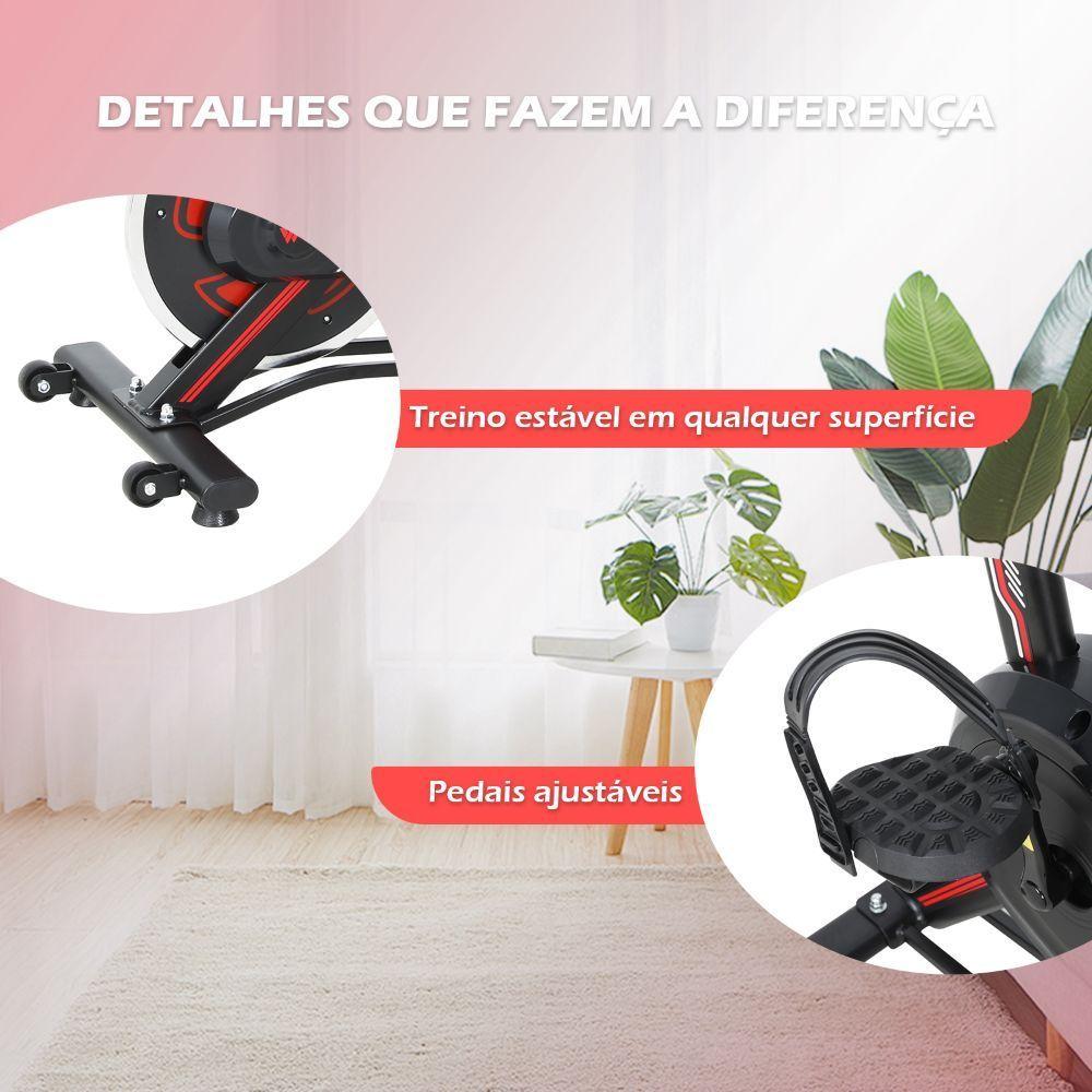BICICLETA ERGOMÉTRICA SPINNING MECÂNICA WONDERFIT GO 4KG WSB04HBTA-VMGaranta mais saúde, energia e qualidade de vida com a Bicicleta Ergométrica Spinning Mecânica Wonderfit. Com sistema de resistência mecânica, o modelo é ideal para treinos iniciais e residenciais, oferecendo conforto e desempenho para quem quer praticar exercícios aeróbicos sem sair de casa. Ela conta com roda de inércia de 4 kg, selim e apoios de braço ajustáveis e monitor com leitura de dados essenciais para o acompanhamento do treino. Seu funcionamento por correia proporciona pedaladas suaves Com design moderno, é uma ótima opção para quem busca praticidade e motivação para treinar todos os dias.Características do Produto:Design compacto e eficiente: Com estrutura em tubo de aço e acabamento moderno, é perfeita para quem quer montar um espaço fitness em casa com conforto e segurança.Roda de inércia de 4 kg: Ideal para treinos leves e moderados, com pedaladas mais estáveis que contribuem para o desenvolvimento do condicionamento físico.Sistema de resistência mecânico: O ajuste é feito manualmente por meio de botões “+” e “–”, o que permite adaptar a intensidade do treino conforme o seu objetivo.Transmissão por correia: Além de suave, a correia exige menos manutenção do que sistemas de corrente, oferecendo maior durabilidade ao equipamento.Display com funções essenciais: O painel digital exibe informações como tempo, velocidade, distância, calorias, modo SCAN e odômetro (ODO), auxiliando no monitoramento da performance durante os treinos.Ajustes ergonômicos: Tanto o assento quanto os apoios de braço podem ser regulados para se adequar à altura do usuário, proporcionando maior conforto e segurança.Freio de segurança: O equipamento conta com sistema de parada rápida para garantir a segurança em caso de necessidade durante o exercício.Rodas para transporte integradas: Facilita o deslocamento da bike dentro de casa, tornando o equipamento mais prático e funcional no dia a dia.Com suporte para celular: A base permite que você posicione seu celular com segurança durante o treino, ideal para quem gosta de acompanhar vídeos, ouvir música ou usar apps de treino. Dúvidas Frequentes:A bicicleta é mecânica ou magnética?Este modelo é mecânico, com ajuste manual de resistência por botões “+” e “–”.Tem suporte para celular?Sim. O equipamento conta com suporte acoplado para posicionar o celular com segurança durante o treino.É indicada para qualquer altura?Ela é recomendada para usuários com altura entre 1,50 m e 1,80 m e com peso de até 120 kg.Qual a cor da bike?Essa bike é vermelha com preto, mas ela também está disponível na cor amarela com preto.Ela possui sensores para monitorar batimentos cardíacos?Não. Este modelo não possui sensores de frequência cardíaca (hand grip).Funciona com energia elétrica?Não. O display digital funciona com 2 pilhas AA, tornando o uso mais prático e econômico.O equipamento serve para treinos profissionais?Não. O equipamento é de entrada, ideal para iniciantes e treinos residenciais.A bike possui suporte para garrafa?Não, esse modelo não acompanha suporte para garrafas.Especificações Técnicas:Marca: WonderfitModelo: WSB04HBTA-VMClassificação de Uso: ResidencialCor: Vermelho com PretoAltura Min e Max Indicada: 1,50 m / 1,80 mPeso Máximo do Usuário: 120 kgPeso da Roda de Inércia: 4 kgMaterial: Tubo de aço, espuma, plástico, borrachaFunções do Display: SCAN, Tempo, Velocidade, Distância, Calorias, ODOMonitoramento de Frequência Cardíaca: Não possuiFonte de Alimentação do Display: 2 pilhas AAProgramas de Treinamento: Não possui programas pré-definidosNíveis de Resistência: Ajuste por botões “+/-”, sem indicação numéricaRodas para Transporte: SimSuporte para Celular: SimSuporte para Garrafa: NãoSistema de Resistência: MecânicoSistema de Transmissão: CorreiaAjustes Ergonômicos: Apoio de braços e assento ajustáveisSelim: AjustávelRevestimento do Guidão: EspumaFreio de Segurança: SimDobrável: NãoBluetooth: Não possuiDimensões do Produto (CxLxA): 92 x 45 x 110 cmDimensões da Embalagem (CxLxA): 84 x 19 x 70 cmPeso Líquido: 15,5 kgPeso Bruto: 18 kgGarantia: 6 meses