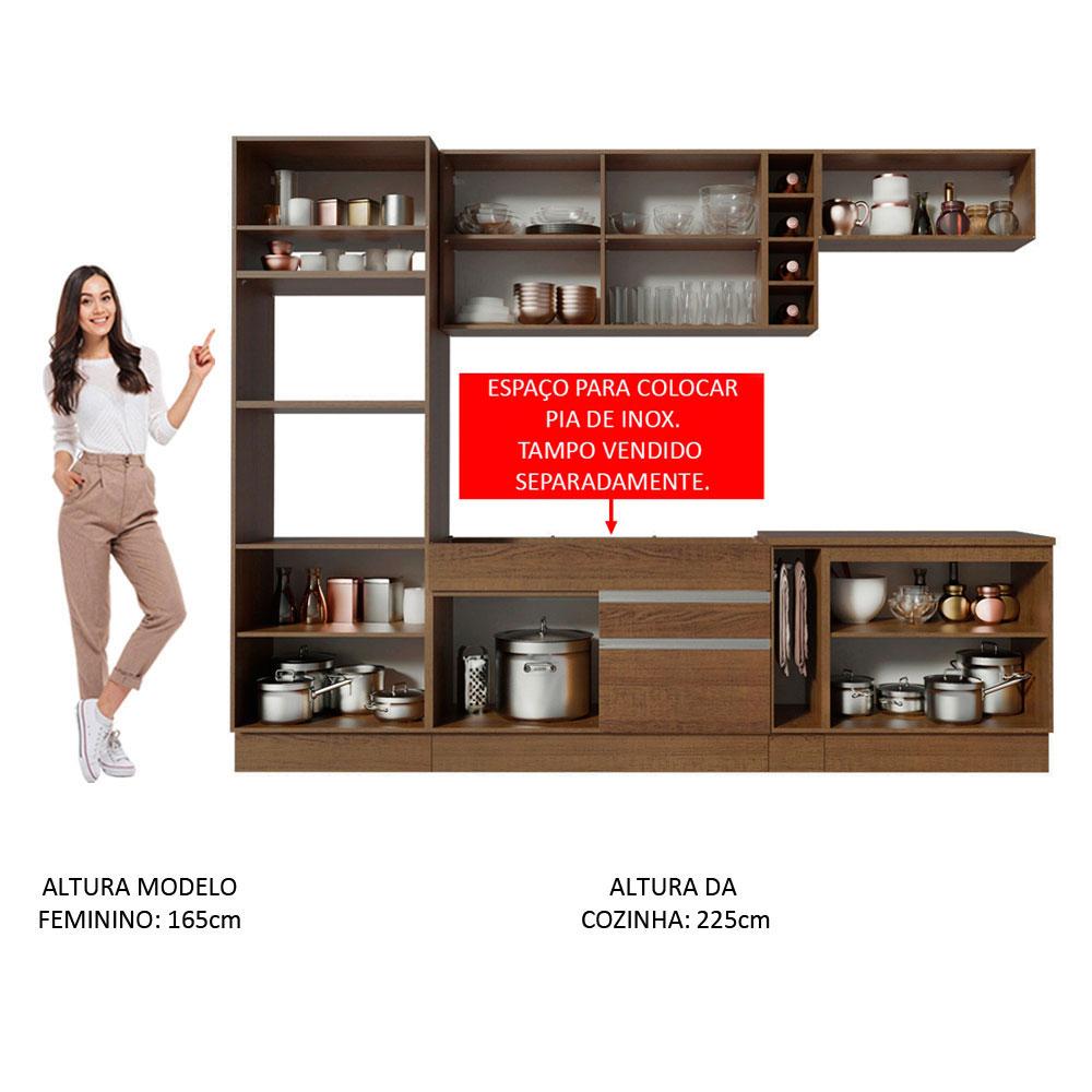 A Cozinha Vicenza Glamy é a campeã de vendas da Madesa. Uma cozinha completa com design moderno e um ótimo acabamento. Se destaca por parecer uma cozinha planejada com ótimo aproveitamento dos espaços internos.As gavetas possuem corrediças telescópicas e todas as portas possuem amortecedor para o fechamento suave. Esses itens de qualidade superior conferem durabilidade e maior vida útil do móvel.Outro grande diferencial desta cozinha é a profundidade maior, como uma cozinha planejada: 52 cm no balcão inferior e 31 cm nos aéreos. As medidas totais são: 290 cm de largura e 225 cm de altura.O balcão de pia comporta pias de 120 cm x 52 cm. Já o balcão para cooktop segue com tampo de 80 cm x 52 cm que pode ser recortado para a colocação do cooktop. Possui também pés reguláveis e rodapé removível. Para completar, com opção de aéreos na cor crema com detalhe em vidro reflex conferindo elegância ao ambiente.Esta cozinha pode ser complementada pelos módulos avulsos da linha Glamy da Madesa.(Imagens meramente ilustrativas: os eletros, o tampo da pia, a torneira e a decoração não acompanham o produto.)Itens inclusos:- Um (1) porta fornos com dois (2) nichos para forno e micro-ondas e três (3) portas sendo uma (1) basculante- Um (1) balcão de pia com duas (2) gavetas e uma (1) porta (não acompanha tampo)- Um (1) porta panos- Um (1) balcão com duas (2) portas e tampo- Um (1) aéreo com duas (2) portas com detalhe em vidro reflex- Um (1) aéreo com uma (1) porta basculante- Uma (1) adegaCódigo do produto:G20150075BSTObs.: A Madesa não disponibiliza serviço de montagem. O produto segue com manual de instalação e todas as ferragens necessárias para sua montagem.1-O produto é novo ou usado?R.: Todos os produtos da Madesa são novos, enviados da nossa fábrica diretamente para as casas de nossos clientes.2-O produto vem montado? Se não, vocês realizam a montagem?R.: A Madesa não disponibiliza serviço de montagem. Todos os produtos seguem com manual de instalação e as ferragens necessárias. Alguns produtos possuem vídeo explicando o passo a passo da montagem.3-Vocês possuem loja física? Posso retirar meu produto em mãos?R.: Não possuímos loja física, apenas loja virtual. Confira as opções de envio ao colocar o seu CEP.4-Qual é o valor do envio? Posso pagar separadamente?R.: O valor do envio é calculado com base no peso e volume do produto, e no CEP de destino. Você pode calcular o valor e prazo de entrega no simulador.5-A Madesa entrega em todo Brasil? Como é feita a entrega?R.: Sim, entregamos no Brasil inteiro através de transportadoras parceiras.6-O produto acompanha Nota Fiscal?R.: Sim, todos os produtos são entregues com suas respectivas notas fiscais.7-Os produtos possuem garantia?R.: Sim. A Madesa oferece 3 meses de garantia para defeitos de fabricação.A Madesa se dedica à sustentabilidade com várias iniciativas: temos uma usina própria para gerar energia que abastece uma de nossas fábricas. Selecionamos nossos fornecedores, priorizando aqueles que possuem um compromisso com a sustentabilidade e proteção do meio ambiente. Todo o plástico utilizado no setor produtivo é proveniente de reciclagem e as suas sobras são encaminhadas ao fornecedor que os recicla. Também investimos no desenvolvimento contínuo de nossos colaboradores e em ações educacionais que beneficiem a comunidade.