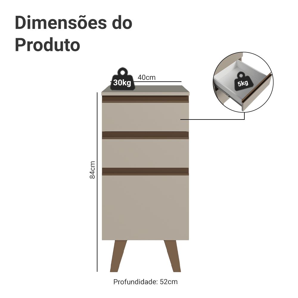 O Balcão Gaveteiro com três gavetas espaçosas oferece ótimo espaço para manter tudo sempre à mão. O destaque fica por conta da última gaveta, que possui maior profundidade, ideal para acomodar itens mais volumosos. As corrediças com abertura total garantem fácil acesso e deslizamento suave em todas as gavetas, proporcionando mais funcionalidade no dia a dia.A linha Nice chega em uma nova versão no tom crema, uma tonalidade suave que transmite aconchego e leveza. Outro diferencial está nos puxadores em bronze metalizado e pés em bronze sólido, que acrescentam um toque contemporâneo. Produzido com materiais de qualidade, o balcão conta com puxadores em perfil de alumínio, discretos e resistentes e o acabamento de alta resistência mantém a beleza do móvel por muito mais tempo.Medidas totais:- 84 cm de altura- 40 cm de largura- 52 cm de profundidadeO que você recebe: - Um (1) Balcão com três (3) gavetas e tampoCódigo do produto: G244017PNCCTÉ importante saber:- Material: MDP- Imagens meramente ilustrativas, a decoração não acompanha o produto.- A Madesa não oferece serviço de montagem.- O produto segue com manual e todas as ferragens necessárias para a instalação.A Madesa se dedica à sustentabilidade com várias iniciativas: temos uma usina própria que gera energia para uma das fábricas. Priorizamos fornecedores responsáveis com o meio ambiente. Todo o plástico utilizado na produção é reciclado, e as sobras também são reaproveitadas. Investimos no desenvolvimento de nossos colaboradores e em ações que beneficiem a comunidade.