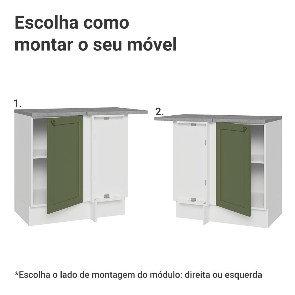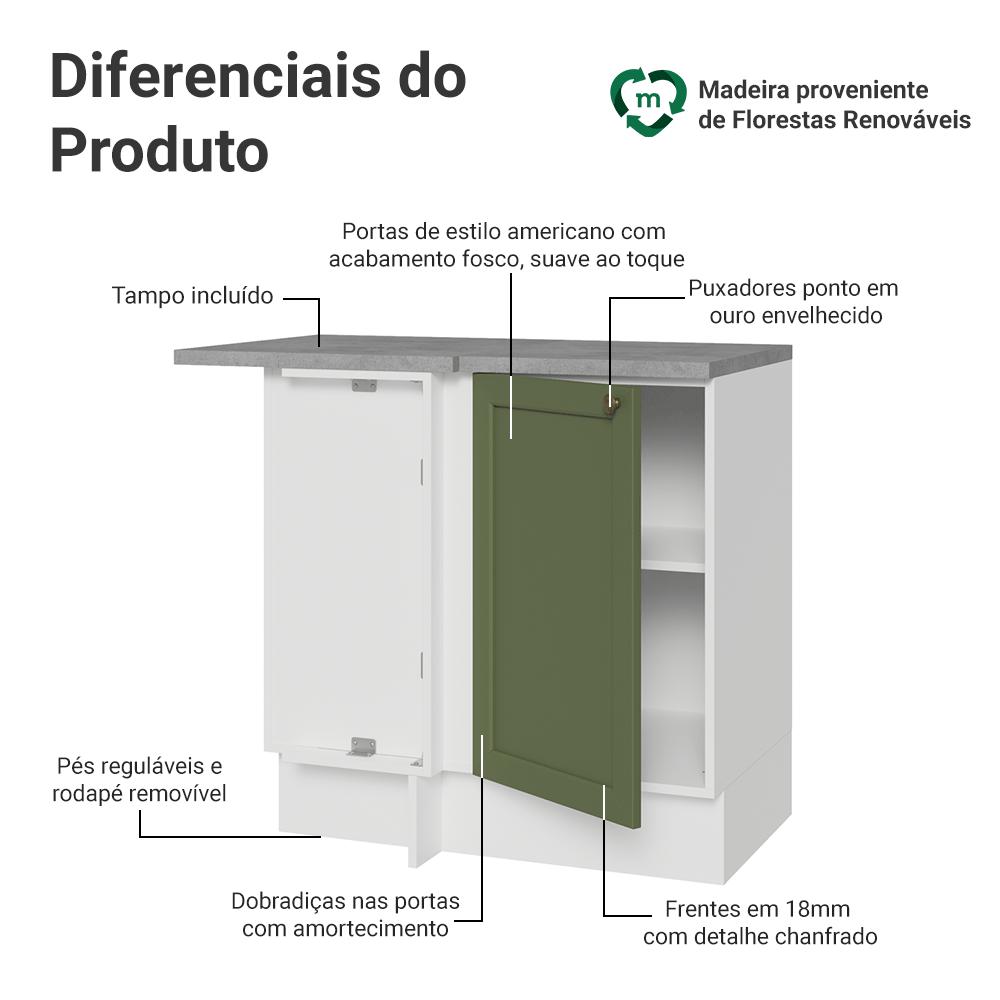 O Balcão de Canto da Linha Vik da Madesa foi pensado para otimizar o espaço da sua cozinha, transformando-a em um ambiente funcional e bem aproveitado.Com 52 cm de profundidade, ele se encaixa perfeitamente nos módulos inferiores da cozinha Vik. Este balcão conta com uma porta que garante mais armazenamento, facilitando a organização.O acabamento de alta resistência da estrutura é em Branco e das portas em Verde. Possui uma textura suave ao toque, trazendo leveza e sofisticação ao ambiente. O destaque vai para os puxadores ponto em ouro envelhecido, feitos com metal resistente, que adicionam personalidade e um charme único. Outro diferencial está no detalhe chanfrado das frentes, que forma molduras elegantes e dá profundidade ao design, refletindo o estilo americano com um toque moderno.Além de trazer elegância, a linha Vik é funcional em cada detalhe. As portas possuem dobradiças com amortecimento, garantindo um fechamento suave e silencioso.Cade detalhe foi pensado para tornar sua casa mais prática, bonita e aconchegante. Medidas:- 84 cm de altura- 94 cm de largura- 55 cm de profundidadeItens inclusos:- Um (1) Balcão com uma (1) porta (Acompanha o tampo)Código do produto: G24750L9VKObs.:- A sua profundidade conta já com a compensação por ser de canto- Imagens meramente ilustrativas, a decoração não acompanha o produto- A Madesa não disponibiliza serviço de montagem- O produto segue com manual de instalação e todas as ferragens necessárias para sua montagemA Madesa se dedica à sustentabilidade com várias iniciativas: temos uma usina própria que gera energia para uma das fábricas. Priorizamos fornecedores responsáveis com o meio ambiente. Todo o plástico utilizado na produção é reciclado, e as sobras também são reaproveitadas. Investimos no desenvolvimento de nossos colaboradores e em ações que beneficiem a comunidade.