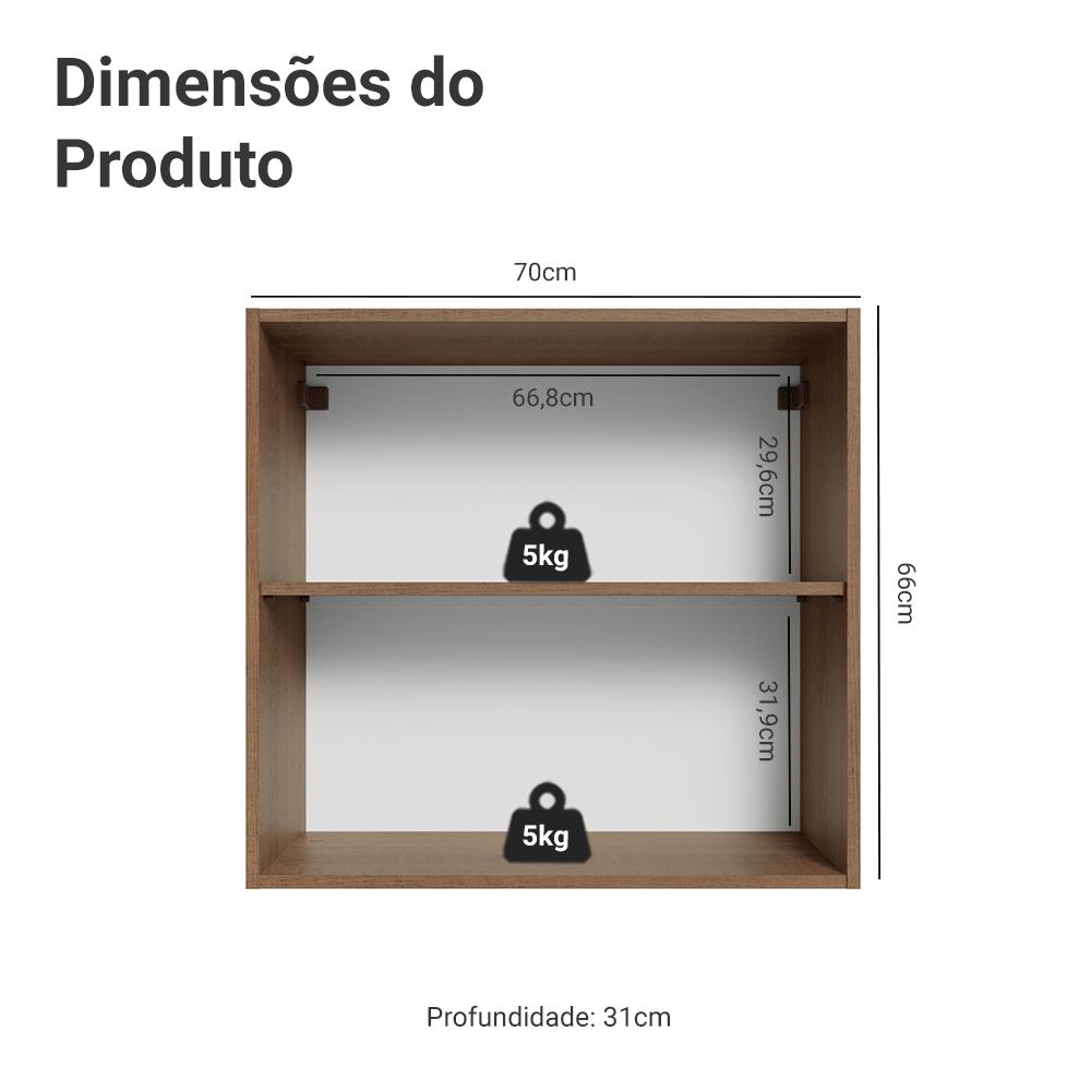 Com o Armário Aéreo de 70 cm com 2 Portas da Linha Vik da Madesa, você aproveita todo o espaço da sua cozinha. Seus dois compartimentos internos oferecem organização prática para utensílios, louças ou mantimentos, proporcionando total aproveitamento do espaço.O acabamento de alta resistência da estrutura é em tom amadeirado Rustic e das portas em Azul. Possui uma textura suave ao toque, trazendo leveza e sofisticação ao ambiente. O destaque vai para os puxadores ponto em ouro envelhecido, feitos com metal resistente, que adicionam personalidade e um charme único. Outro diferencial está no detalhe chanfrado das frentes, que forma molduras elegantes e dá profundidade ao design, refletindo o estilo americano com um toque moderno. Além de trazer elegância, a linha Vik é funcional em cada detalhe. As portas possuem dobradiças com amortecimento, garantindo um fechamento suave e silencioso, para você organizar tudo que precisa com muito mais facilidade.Ideal para quem busca elegância, qualidade e funcionalidade para o dia a dia.>Medidas totais:- 66 cm de altura- 70 cm de largura- 31 cm de profundidadeO que você recebe:- Um (1) Armário aéreo com duas (2) portasCódigo do produto: G25700M1VKÉ importante saber:- Imagens meramente ilustrativas, a decoração não acompanha o produto- A Madesa não disponibiliza serviço de montagem- O produto segue com manual de instalação e todas as ferragens necessárias para sua montagemA Madesa se dedica à sustentabilidade com várias iniciativas: temos uma usina própria que gera energia para uma das fábricas. Priorizamos fornecedores responsáveis com o meio ambiente. Todo o plástico utilizado na produção é reciclado, e as sobras também são reaproveitadas. Investimos no desenvolvimento de nossos colaboradores e em ações que beneficiem a comunidade.