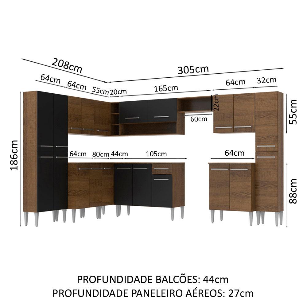 A Cozinha Completa Emilly de Canto Reto é perfeita para o seu dia-a-dia. Tem puxadores com alumínio e corrediças e dobradiças metálicas resistentes. Conta com 21 portas, 1 gaveta e 5 nichos com total aproveitamento dos espaços. Acompanha tampo de madeira de todos os balcões. Os pés são em PVC para facilitar a limpeza e reguláveis para nivelar pequenas imperfeições no piso.O acabamento interno e externo é nas cores amadeirado Rustic e preto, em Pintura Poliéster com 7 camadas de proteção que oferece resistência contra os efeitos da água e do calor. Ela é dividida em dez módulos independentes: paneleiro duplo, balcão com 2 portas, armário aéreo com 2 portas, balcão de canto reto, armário aéreo de canto reto com duas portas e adega, balcão de pia, armário aéreo com duas portas e dois nichos, balcão com 2 portas, armário aéreo com 2 portas e o paneleiro simples.Os armários aéreos precisam ser fixados na parede. Os módulos de canto devem ser instalados conforme mostram as imagens, não sendo possível fazer a inversão do lado da montagem.Medidas totais: 186 cm de altura, 208 cm de largura do lado esquerdo e 305 cm de largura do lado direito, contabilizando o espaço necessário para o canto. São 44 cm profundidade nos balcões inferiores e 27 cm no paneleiro e nos aéreos.Imagem meramente ilustrativa: a decoração e os eletros não acompanham o produto.Itens inclusos:- Um (1) paneleiro duplo com 4 portas- Dois (2) balcões com 2 portas e tampo- Dois (2) armários aéreos com 2 portas- Um (1) balcão de canto reto com 1 porta e tampo- Um (1) armário aéreo de canto reto com 1 porta e adega acoplada- Um (1) balcão de pia com 3 portas, 1 gaveta e tampo- Um (1) armário aéreo com 2 portas e 2 nichos grandes- Um (1) paneleiro simples com 2 portasCódigo do produto: GCEM5130027KObs.: A Madesa não disponibiliza serviço de montagem. O produto segue com manual de instalação e todas as ferragens necessárias para sua montagem.1-O produto é novo ou usado?R.: Todos os produtos da Madesa são novos, enviados da nossa fábrica diretamente para as casas de nossos clientes.2-O produto vem montado? Se não, vocês realizam a montagem?R.: A Madesa não disponibiliza serviço de montagem. Todos os produtos seguem com manual de instalação e as ferragens necessárias. Alguns produtos possuem vídeo explicando o passo a passo da montagem.3-Vocês possuem loja física? Posso retirar meu produto em mãos?R.: Não possuímos loja física, apenas loja virtual. Confira as opções de envio ao colocar o seu CEP.4-Qual é o valor do envio? Posso pagar separadamente?R.: O valor do envio é calculado com base no peso e volume do produto, e no CEP de destino. Você pode calcular o valor e prazo de entrega no simulador.5-A Madesa entrega em todo Brasil? Como é feita a entrega?R.: Sim, entregamos no Brasil inteiro através de transportadoras parceiras.6-O produto acompanha Nota Fiscal?R.: Sim, todos os produtos são entregues com suas respectivas notas fiscais.7-Os produtos possuem garantia?R.: Sim. A Madesa oferece 3 meses de garantia para defeitos de fabricação.A Madesa se dedica à sustentabilidade com várias iniciativas: temos uma usina própria para gerar energia que abastece uma de nossas fábricas. Selecionamos nossos fornecedores, priorizando aqueles que possuem um compromisso com a sustentabilidade e proteção do meio ambiente. Todo o plástico utilizado no setor produtivo é proveniente de reciclagem e as suas sobras são encaminhadas ao fornecedor que os recicla. Também investimos no desenvolvimento contínuo de nossos colaboradores e em ações educacionais que beneficiem a comunidade.
