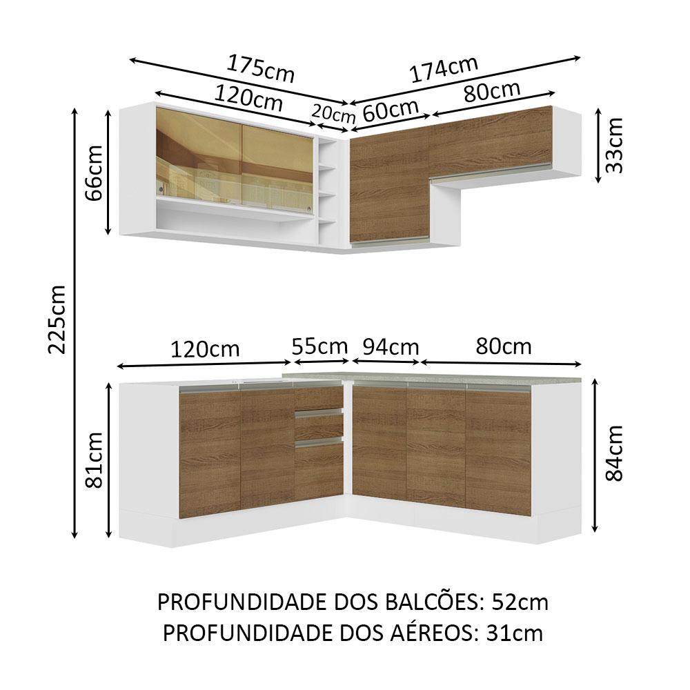 Esta Cozinha Completa de Canto da linha Glamy vai trazer conforto e modernidade para sua casa, além da qualidade de fabricação dos produtos da Madesa.Perfeita para ambientes grandes, esta cozinha tem como diferencial o ótimo espaço disponível. Tem lugar para organizar todos os utensílios, louças e mantimentos.Por ser totalmente modulada, você pode organizar os armários e balcões conforme preferir no seu ambiente. Além disso, o canto pode ser montado tanto para o lado esquerdo quanto para o direito.Fabricada com itens de padrão superior, a cozinha possui puxadores em alumínio, gavetas com corrediças telescópicas e portas com amortecedores para o fechamento suave, além de pistão a gás para manter a porta basculante aberta.O balcão maior possibilita a colocação de pias de inox ou pedra, no tamanho de 120 cm x 52 cm.Para completar, a cozinha conta com pés reguláveis em PVC e rodapé removível em MDP de fácil encaixe, para retirar na hora de realizar a limpeza.O acabamento da estrutura é branco e as portas e frentes são em amadeirado Rustic. Feito em Pintura Poliéster ecológica, com aplicação de 7 camadas de proteção resistentes a álcool, água e calor.Medidas totais:- 225 cm de altura- 349 cm de largura- 52 cm nos balcões e 31 cm nos aéreosItens inclusos:- Um (1) Aéreo de 120 cm com duas (2) portas de correr de vidro reflex e um (1) nicho- Um (1) Balcão de 120 cm com duas (2) portas e três (3) gavetas (Não acompanha tampo para este balcão.)- Uma (1) Adega com quatro (4) nichos- Um (1) Aéreo de Canto com uma (1) porta- Um (1) Balcão de Canto com uma (1) porta- Um (1) Aéreo de 80 cm com uma (1) porta basculante- Um (1) Balcão de 80 cm com duas (2) portasCódigo do produto: GCGL3490029BObs.:- Imagens meramente ilustrativas, os eletros, o tampo da pia, a torneira e a decoração não acompanham o produto- Os módulos de canto podem ser montados para o lado direito ou esquerdo- A Madesa não disponibiliza serviço de montagem- O produto segue com manual e todas as ferragens necessárias para a instalação1 – O produto é novo ou usado?R.: Todos os produtos da Madesa são novos, enviados da nossa fábrica diretamente para as casas de nossos clientes.2 – O produto vem montado? Se não, vocês realizam a montagem?R.: A Madesa não disponibiliza serviço de montagem. Todos os produtos seguem com manual de instalação e as ferragens necessárias. Alguns produtos possuem vídeo explicando o passo a passo da montagem.3 – Vocês possuem loja física? Posso retirar meu produto em mãos?R.: Não possuímos loja física, apenas loja virtual. Confira as opções de envio ao colocar o seu CEP.4 – Qual é o valor do envio? Posso pagar separadamente?R.: O valor do envio é calculado com base no peso e volume do produto, e no CEP de destino. Você pode calcular o valor e prazo de entrega no simulador.5 – A Madesa entrega em todo Brasil? Como é feita a entrega?R.: Sim, entregamos no Brasil inteiro através de transportadoras parceiras.A Madesa se dedica à sustentabilidade com várias iniciativas: temos uma usina própria para gerar energia que abastece uma de nossas fábricas. Selecionamos nossos fornecedores, priorizando aqueles que possuem um compromisso com a sustentabilidade e proteção do meio ambiente. Todo o plástico utilizado no setor produtivo é proveniente de reciclagem e as suas sobras são encaminhadas ao fornecedor que os recicla. Também investimos no desenvolvimento contínuo de nossos colaboradores e em ações educacionais que beneficiem a comunidade.