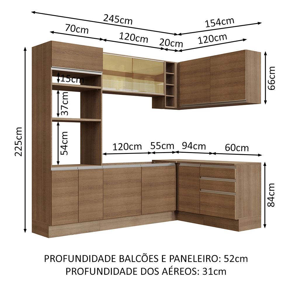 Confira esta Cozinha de Canto da linha Glamy da Madesa, a escolha perfeita para renovar sua casa com muito conforto, espaço e sofisticação.A cozinha conta com gavetas com corrediças telescópicas e portas com amortecedores para o fechamento suave, além de pistão a gás para manter a porta basculante aberta. Esses itens de qualidade superior prolongam a vida útil do móvel.Como a cozinha é totalmente modulada, você pode organizar os módulos conforme a necessidade do seu ambiente. Além disso, o canto pode ser montado tanto para o lado esquerdo quanto para o direito.Outro destaque desta versão é a torre quente, que oferece espaço para a colocação de forno e micro-ondas, além de um nicho menor para objetos. Além disso, o balcão maior permite a colocação de pias de inox ou pedra no tamanho de 120 cm x 52 cm.Para completar, a cozinha conta com pés reguláveis em PVC e rodapé removível em MDP de fácil encaixe, para retirar na hora de realizar a limpeza.O acabamento da cozinha é no padrão amadeirado Rustic, com exceção das partes internas das gavetas e das costas, que são brancas. O processo é feito em Pintura Poliéster com 7 camadas que protegem o móvel dos efeitos do álcool da água e do calor.Medidas totais:- 225 cm de altura- 399 cm de largura- 52 cm nos módulos inferiores e 31 cm nos aéreosItens inclusos:- Uma (1) Torre Quente com três (3) portas, dois (2) nichos para fornos e um (1) nicho menor- Um (1) Aéreo de 120 cm com duas (2) portas de correr em vidro reflex- Um (1) Balcão de 120 cm com duas (2) portas (Não acompanha tampo para este balcão.)- Uma (1) Adega com quatro (4) nichos- Um (1) Aéreo de Canto com uma (1) porta- Um (1) Balcão de Canto com uma (1) porta- Um (1) Aéreo de 60 cm com uma (1) porta- Um (1) Balcão de 60 cm com três (3) gavetas- Um (1) Organizador de talheres para gavetaCódigo do produto: GCGL3990025ZObs.:- Imagens meramente ilustrativas, os eletros, o tampo da pia, a torneira e a decoração não acompanham o produto- Os módulos de canto podem ser montados para o lado direito ou esquerdo- É obrigatório fixar a torre na parede- A Madesa não disponibiliza serviço de montagem- O produto segue com manual e todas as ferragens necessárias para a instalação1 – O produto é novo ou usado?R.: Todos os produtos da Madesa são novos, enviados da nossa fábrica diretamente para as casas de nossos clientes.2 – O produto vem montado? Se não, vocês realizam a montagem?R.: A Madesa não disponibiliza serviço de montagem. Todos os produtos seguem com manual de instalação e as ferragens necessárias. Alguns produtos possuem vídeo explicando o passo a passo da montagem.3 – Vocês possuem loja física? Posso retirar meu produto em mãos?R.: Não possuímos loja física, apenas loja virtual. Confira as opções de envio ao colocar o seu CEP.4 – A Madesa entrega em todo Brasil? Como é feita a entrega?R.: Sim, entregamos no Brasil inteiro através de transportadoras parceiras.A Madesa se dedica à sustentabilidade com várias iniciativas: temos uma usina própria para gerar energia que abastece uma de nossas fábricas. Selecionamos nossos fornecedores, priorizando aqueles que possuem um compromisso com a sustentabilidade e proteção do meio ambiente. Todo o plástico utilizado no setor produtivo é proveniente de reciclagem e as suas sobras são encaminhadas ao fornecedor que os recicla. Também investimos no desenvolvimento contínuo de nossos colaboradores e em ações educacionais que beneficiem a comunidade.