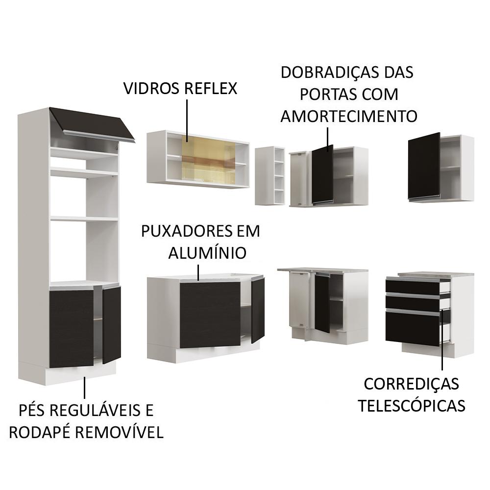 Cozinha Completa de Canto Madesa Glamy 399002 com Armário e Balcão (Sem Tampo e Pia) - Branco/Preto