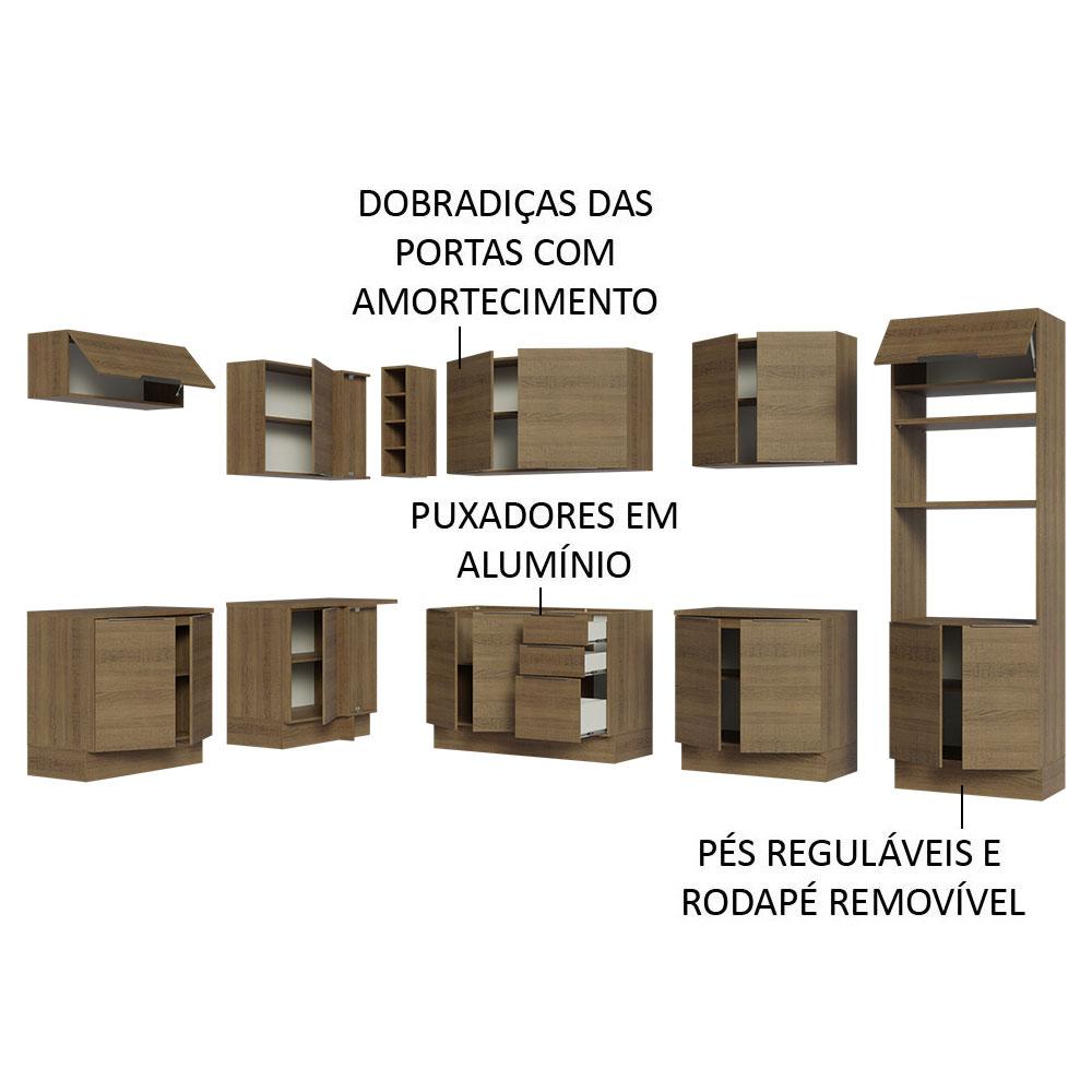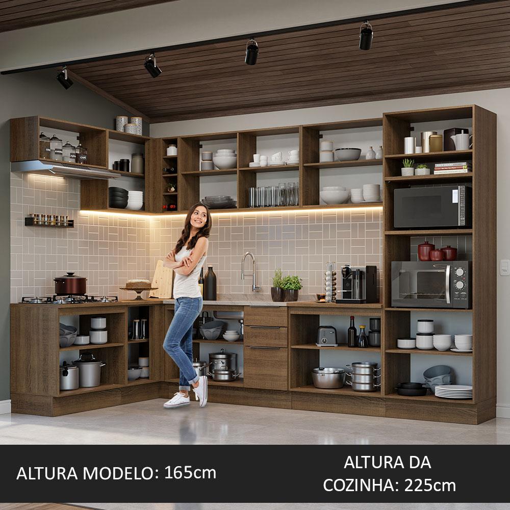 O Armário de Cozinha Completa de Canto Stella , da Madesa, é a opção espaçosa e moderna que você estava procurando!Ele conta puxadores em alumínio, gavetas com corrediças telescópicas e portas com amortecimento . Além disso, os pés reguláveis em PVC e o rodapé removível em MDP permitem a regulagem da altura e a fácil limpeza do piso.Esta cozinha é planejada , pois é formada por módulos avulsos e que se adaptam ao espaço disponível na sua casa. Além disso, conta com local para todos os utensílios e eletros, deixando tudo mais organizado.Para completar, o acabamento em amadeirado Rustic é feito em Pintura Poliéster ecológica , que não agride o meio ambiente e protege o móvel dos efeitos da água e do calor.Medidas totais: - 225 cm de altura- 449 cm de largura- 52 cm de profundidade nos balcões e na torre e 31 cm nos aéreos Itens inclusos: - Um (1) Aéreo de 80 cm com uma (1) porta basculante- Dois (2) Balcões de 80 cm com duas (2) portas e tampo- Um (1) Balcão de Canto com uma (1) porta e tampo- Um (1) Aéreo de Canto com uma (1) porta- Uma (1) Adega com quatro (4) nichos- Um (1) Balcão de Pia de 120 cm com duas (2) portas, três (3) gavetas e um (1) porta-talheres- Um (1) Aéreo de 120 cm com duas (2) portas- Um (1) Aéreo de 80 cm com duas (2) portas- Uma (1) Torre de 70 cm com dois (2) nichos para forno e micro-ondas, um (1) nicho menor e três (3) portasCódigo do produto: GCTE4990015ZObs.: - O canto pode ser montado tanto para a esquerda quanto para a direita- As imagens são meramente ilustrativas, os eletros e a decoração não acompanham o produto- A Madesa não disponibiliza serviço de montagem- O produto segue com manual e todas as ferragens necessárias para a instalação- Por segurança, é necessário fixar a torre na paredeA Madesa se dedica à sustentabilidade com várias iniciativas: temos uma usina própria para gerar energia que abastece uma de nossas fábricas. Selecionamos nossos fornecedores, priorizando aqueles que possuem um compromisso com a sustentabilidade e proteção do meio ambiente. Todo o plástico utilizado no setor produtivo é proveniente de reciclagem e as suas sobras são encaminhadas ao fornecedor que os recicla. Também investimos no desenvolvimento contínuo de nossos colaboradores e em ações educacionais que beneficiem a comunidade.