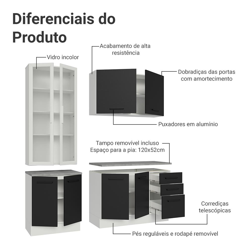 Este Armário de Cozinha Compacta da linha Agata da Madesa é moderno e funcional.O móvel conta com puxadores com alça em alumínio, gavetas com corrediças telescópicas de abertura total, portas com amortecimento para fechamento suave e pés reguláveis em PVC.O grande diferencial deste modelo é a cristaleira. Super sofisticada, possui duas portas de vidro e muito espaço disponível para organizar louças, copos e demais objetos.A cozinha ainda conta com diversas gavetas, prateleiras e nichos. Assim, fica mais fácil fazer a organização de todos os utensílios. Além disso, o balcão acompanha tampo, que pode ser removido para instalação de pia de inox ou pedra, nas medidas de 120 x 52 cm.Esta cozinha é planejada, composta por módulos avulsos que podem ser organizados conforme o espaço do seu ambiente. Também pode ser posteriormente complementada pelos módulos da linha Agata da Madesa.E para completar, o acabamento da estrutura é branco e o das portas e frentes é preto.Medidas totais:- 225 cm de altura- 190 cm de largura- 52 cm de profundidade nos balcões e 31 cm no aéreo e na cristaleiraItens inclusos:- Uma (1) Cristaleira de 70 cm com duas (2) portas- Um (1) Balcão de 70 cm com duas (2) portas e tampo- Um (1) Aéreo de 120 cm com duas (2) portas- Um (1) Balcão de 120 cm com duas (2) portas, três (3) gavetas e tampoCódigo do produto: GRAG19000173Obs.:- A cristaleira não acompanha pés nem kit para suspender na parede. Deve ser instalada sobre o balcão e fixada na parede.- As imagens são meramente ilustrativas, os eletros e a decoração não acompanham o produto