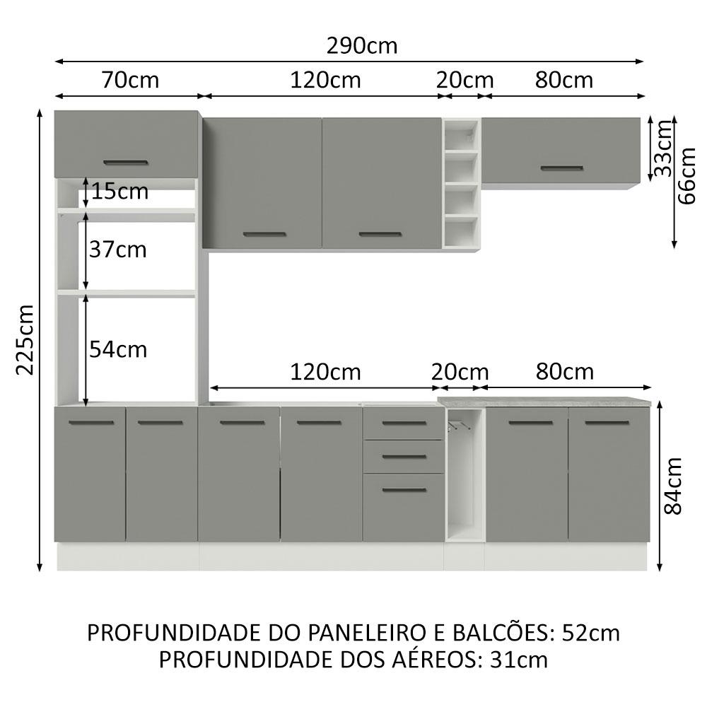 Confira esta Cozinha Completa da linha Agata da Madesa, uma opção com a qualidade e a sofisticação que a sua casa merece.Com ótimo espaço disponível, conta com diversas gavetas, prateleiras e nichos, perfeitos para organizar os utensílios e louças. Possui lugar também para forno e micro-ondas e permite a instalação de forno embutido.Por se tratar de uma cozinha planejada, você pode organizar as peças conforme a necessidade do seu espaço.Os materiais utilizados na fabricação são de alta qualidade, como os puxadores com alça em alumínio, as gavetas com corrediças telescópicas de abertura total e as portas com amortecimento para fechamento suave.O balcão maior permite a instalação de pia de inox ou pedra, no tamanho 120 x 52 cm. Já o balcão de 80 cm acompanha tampo, que pode ser recortado para a instalação de cooktop.Para completar, os pés são reguláveis em PVC com rodapé removível em MDP de encaixe fácil, para facilitar na hora da limpeza.O acabamento da estrutura é branco e o das portas e frentes é cinza. É feito em Pintura Poliéster ecológica, com 7 camadas de proteção resistentes a álcool, água e calor.Esta cozinha pode ser complementada pelos módulos avulsos da linha Agata da Madesa.Medidas totais:- 225 cm de altura- 290 cm de largura- 52 cm de profundidade nos módulos inferiores e 31 cm nos aéreosItens inclusos:- Uma (1) Torre Quente de 70 cm com três (3) portas e dois (2) nichos- Um (1) Aéreo de 120 cm com duas (2) portas- Um (1) Balcão de Pia com duas (2) portas e três (3) gavetas- Uma (1) Adega de 20 cm com quatro (4) nichos- Um (1) Balcão Porta-Panos de 20 cm com duas (2) hastes e tampo- Um (1) Aéreo de 80 cm com uma (1) porta basculante- Um (1) Balcão de 80 cm com duas (2) portas e tampoCódigo do produto: GRAG290005F8Obs.:- As imagens são meramente ilustrativas, os eletros e a decoração não acompanham o produto- A Madesa não disponibiliza serviço de montagem- O produto segue com manual e todas as ferragens necessárias para a instalação- Por segurança, é obrigatória a fixação da torre na paredeA Madesa se dedica à sustentabilidade com várias iniciativas: temos uma usina própria para gerar energia que abastece uma de nossas fábricas. Selecionamos nossos fornecedores, priorizando aqueles que possuem um compromisso com a sustentabilidade e proteção do meio ambiente. Todo o plástico utilizado no setor produtivo é proveniente de reciclagem e as suas sobras são encaminhadas ao fornecedor que os recicla. Também investimos no desenvolvimento contínuo de nossos colaboradores e em ações educacionais que beneficiem a comunidade.