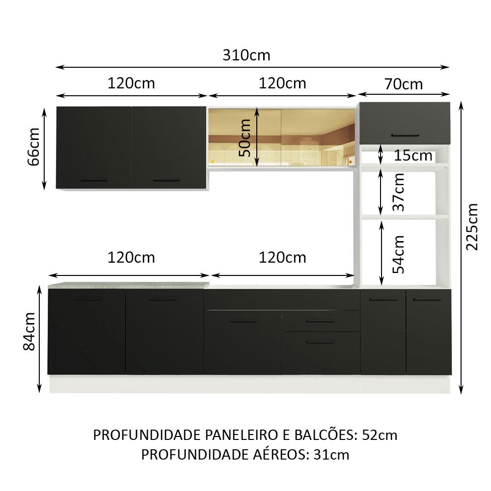 As cozinhas da linha Agata da Madesa se destacam pela modernidade e pela qualidade na construção. Neste modelo, possui espaço de sobra para organizar todos os utensílios da cozinha.As portas possuem puxador com alça de alumínio e dobradiças que amortecem o fechamento. As gavetas contemplam corrediças telescópicas e o detalhe dos vidros do aéreo no estilo reflex traz ainda mais elegância à cozinha.Na parte inferior, os módulos possuem pés reguláveis em PVC e rodapés removíveis em MDP, que facilitam a limpeza. Um dos balcões acompanha tampo, que pode ser recortado para colocação de cooktop. O outro balcão não acompanha tampo e comporta pias de inox ou pedra, no espaço de 120 x 52 cm.Para completar, a torre quente possui prateleira regulável e espaço para forno e micro-ondas.O acabamento interno e da estrutura é branco e as portas e frentes são pretas. É feito em Pintura Poliéster, com 7 camadas de proteção resistentes a álcool, água e calor.Medidas totais da cozinha: 225 cm de altura, 310 cm de largura e profundidade de 52 cm nos balcões e na torre e 31 cm nos aéreos.Esta cozinha pode ser complementada pelos módulos avulsos da linha Agata da Madesa.(Imagens meramente ilustrativas: os eletros, o tampo da pia, a torneira e a decoração não acompanham o produto).Itens inclusos:- Um (1) Aéreo de 120 cm com duas (2) portas- Um (1) Balcão de pia de 120 cm de largura com duas (2) portas e tampo- Um (1) Aéreo de 120 cm com duas (2) portas de correr de vidro reflex- Um (1) Balcão de pia de 120 cm de largura com uma (1) porta e duas (2) gavetas, sendo uma maior (não acompanha tampo)- Uma (1) Torre de 70 cm de largura com três (3) portasCódigo do produto: GRAG31000173Obs.: A Madesa não disponibiliza serviço de montagem. O produto segue com manual e todas as ferragens necessárias para a instalação.1 – O produto é novo ou usado?R.: Todos os produtos da Madesa são novos, enviados da nossa fábrica diretamente para as casas de nossos clientes.2 – O produto vem montado? Se não, vocês realizam a montagem?R.: A Madesa não disponibiliza serviço de montagem. Todos os produtos seguem com manual de instalação e as ferragens necessárias. Alguns produtos possuem vídeo explicando o passo a passo da montagem.3 – Vocês possuem loja física? Posso retirar meu produto em mãos?R.: Não possuímos loja física, apenas loja virtual. Confira as opções de envio ao colocar o seu CEP.4 – Qual é o valor do envio? Posso pagar separadamente?R.: O valor do envio é calculado com base no peso e volume do produto, e no CEP de destino. Você pode calcular o valor e prazo de entrega no simulador.5 – A Madesa entrega em todo Brasil? Como é feita a entrega?R.: Sim, entregamos no Brasil inteiro através de transportadoras parceiras.6 – O produto acompanha Nota Fiscal?R.: Sim, todos os produtos são entregues com suas respectivas notas fiscais.7 – Os produtos possuem garantia?R.: Sim. A Madesa oferece 3 meses de garantia para defeitos de fabricação.A Madesa se dedica à sustentabilidade com várias iniciativas: temos uma usina própria para gerar energia que abastece uma de nossas fábricas. Selecionamos nossos fornecedores, priorizando aqueles que possuem um compromisso com a sustentabilidade e proteção do meio ambiente. Todo o plástico utilizado no setor produtivo é proveniente de reciclagem e as suas sobras são encaminhadas ao fornecedor que os recicla. Também investimos no desenvolvimento contínuo de nossos colaboradores e em ações educacionais que beneficiem a comunidade.