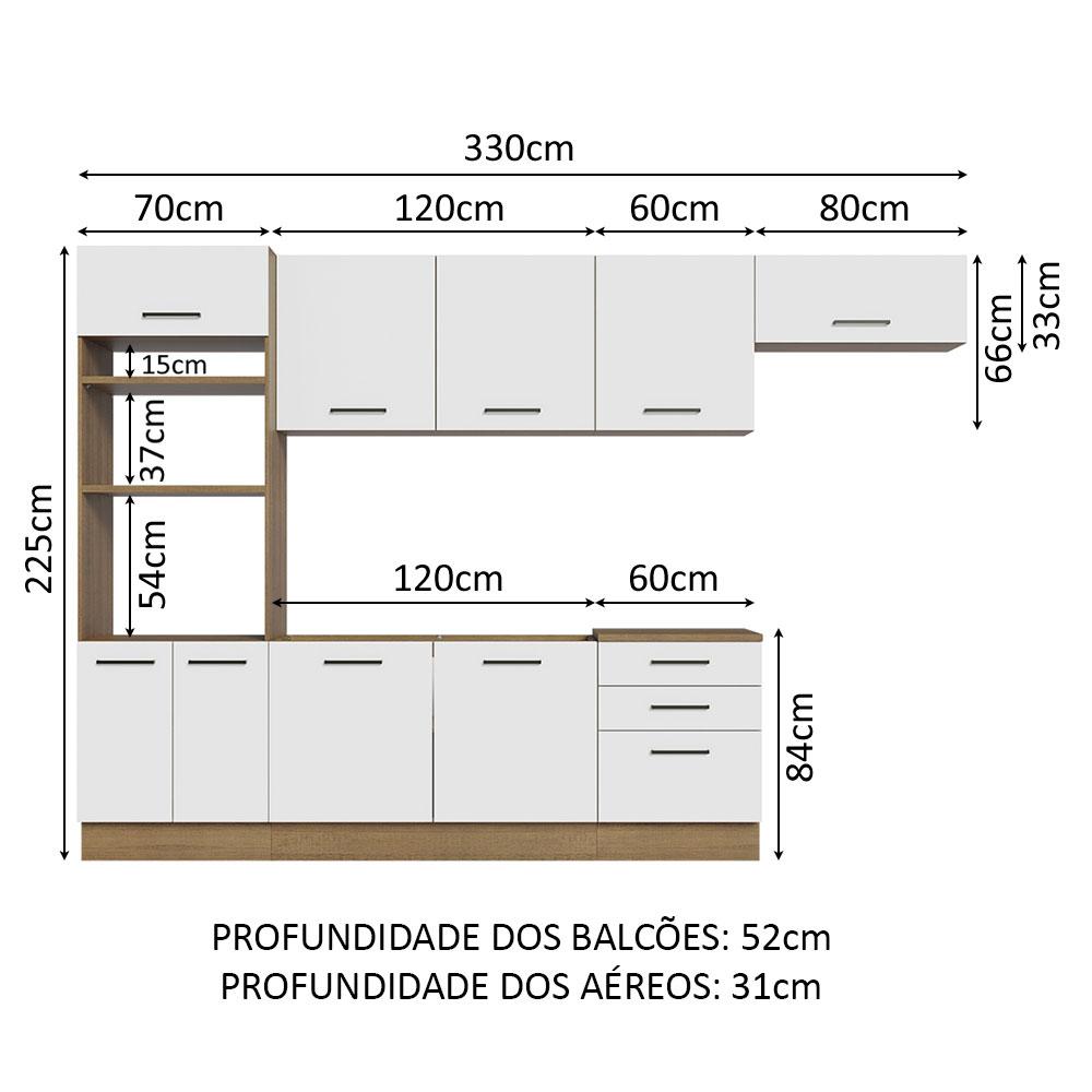 A Cozinha Completa Agata da Madesa é moderna, aconchegante e funcional, pensada com carinho para fazer parte um dos cômodos mais importantes da casa.É um móvel de qualidade superior, sendo composta por puxadores com alça em alumínio, gavetas com corrediças telescópicas de abertura total e portas com amortecimento para fechamento suave.Com muito espaço disponível, conta com diversas gavetas, prateleiras e nichos. Assim, fica mais fácil fazer a organização de todos os utensílios, louças e demais objetos.Ela se encaixa perfeitamente no seu ambiente, pois conta com módulos avulsos, que podem ser organizados conforme o espaço disponível. Assim, se torna uma cozinha planejada.O balcão maior tem espaço para pia de inox ou pedra nas medidas de 120 x 52 cm e não acompanha tampo. O balcão de 60 cm possui tampo que pode ser recortado para instalação de cooktop.Para completar, os pés são reguláveis em PVC e o rodapé é removível em MDP, com encaixe fácil para retirar na hora da limpeza.O acabamento da estrutura é em amadeirado Rustic e o das portas e frentes é branco. É feito em Pintura Poliéster com 7 camadas que protegem o móvel dos efeitos do álcool da água e do calor.Esta cozinha pode ser complementada pelos módulos avulsos da linha Agata da Madesa.Medidas totais:- 225 cm de altura- 330 cm de largura- 52 cm de profundidade nos balcões e na torre e 31 cm nos aéreosItens inclusos:- Uma (1) Torre Quente com três (3) portas, dois (2) nichos para fornos e um (1) nicho menor- Um (1) Aéreo de 120 cm com duas (2) portas- Um (1) Balcão de Pia de 120 cm com duas (2) portas (Não acompanha tampo.)- Um (1) Aéreo de 60 cm com uma (1) porta- Um (1) Balcão de 60 cm com três (3) gavetas e tampo- Um (1) Aéreo de 80 cm com uma (1) porta basculante- Um (1) Organizador de talheres para gavetaCódigo do produto: GRAG3300016EObs.:- As imagens são meramente ilustrativas, os eletros e a decoração não acompanham o produto- A Madesa não disponibiliza serviço de montagem- O produto segue com manual e todas as ferragens necessárias para a instalação- Por segurança, é obrigatório fixar a torre na parede1 – O produto é novo ou usado?R.: Todos os produtos da Madesa são novos, enviados da nossa fábrica diretamente para as casas de nossos clientes.2 – O produto vem montado? Se não, vocês realizam a montagem?R.: A Madesa não disponibiliza serviço de montagem. Todos os produtos seguem com manual de instalação e as ferragens necessárias. Alguns produtos possuem vídeo explicando o passo a passo da montagem.3 – Vocês possuem loja física? Posso retirar meu produto em mãos?R.: Não possuímos loja física, apenas loja virtual. Confira as opções de envio ao colocar o seu CEP.4 – Qual é o valor do envio? Posso pagar separadamente?R.: O valor do envio é calculado com base no peso e volume do produto, e no CEP de destino. Você pode calcular o valor e prazo de entrega no simulador.5 – A Madesa entrega em todo Brasil? Como é feita a entrega?R.: Sim, entregamos no Brasil inteiro através de transportadoras parceiras.A Madesa se dedica à sustentabilidade com várias iniciativas: temos uma usina própria para gerar energia que abastece uma de nossas fábricas. Selecionamos nossos fornecedores, priorizando aqueles que possuem um compromisso com a sustentabilidade e proteção do meio ambiente. Todo o plástico utilizado no setor produtivo é proveniente de reciclagem e as suas sobras são encaminhadas ao fornecedor que os recicla. Também investimos no desenvolvimento contínuo de nossos colaboradores e em ações educacionais que beneficiem a comunidade.