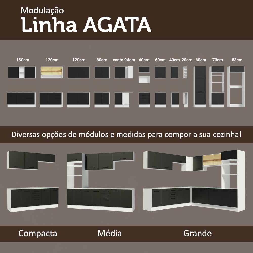 A Cozinha Completa Agata da Madesa possui design moderno e vai deixar sua casa mais aconchegante e funcional.Fabricada com materiais de alta qualidade, possui puxadores com alça em alumínio, gavetas com corrediças telescópicas de abertura total e portas com amortecimento para fechamento suave.A cozinha é totalmente modulada, ou seja, todas as peças podem ser organizadas conforme o espaço disponível no seu ambiente. Assim, se torna uma cozinha planejada.Com muito espaço disponível, conta com gavetas, prateleiras e nichos que facilitam a organização de todos os utensílios, louças e demais objetos.O balcão da cozinha tem espaço para pia de inox ou pedra nas medidas de 120 x 52 cm e não acompanha tampo.Para completar, os pés são reguláveis em PVC e o rodapé é removível em MDP, com encaixe fácil para retirar na hora da limpeza.O acabamento da estrutura é branco e as portas e frentes são pretas. É feito em Pintura Poliéster ecológica com sete camadas, que destaca a tonalidade e protege o móvel.Esta cozinha pode ser complementada pelos módulos avulsos da linha Agata da Madesa.Medidas totais:- 225 cm de altura- 350 cm de largura- 52 cm de profundidade no balcão e na torre e 31 cm nos aéreosItens inclusos:- Um (1) Aéreo de 120 cm com duas (2) portas de correr de vidro reflex- Um (1) Balcão de Pia de 120 cm com duas (2) gavetas e uma (1) porta (Não acompanha tampo.)- Um (1) Aéreo de 80 cm com uma (1) porta basculante- Uma (1) Torre Quente de 70 cm com três (3) portas, dois (2) nichos para fornos e um (1) nicho menorCódigo do produto: GRAG35000173Obs.:- As imagens são meramente ilustrativas, os eletros e a decoração não acompanham o produto- A Madesa não disponibiliza serviço de montagem- O produto segue com manual e todas as ferragens necessárias para a instalação- Por segurança, é obrigatório fixar a torre quente na parede1 – O produto é novo ou usado?R.: Todos os produtos da Madesa são novos, enviados da nossa fábrica diretamente para as casas de nossos clientes.2 – O produto vem montado? Se não, vocês realizam a montagem?R.: A Madesa não disponibiliza serviço de montagem. Todos os produtos seguem com manual de instalação e as ferragens necessárias. Alguns produtos possuem vídeo explicando o passo a passo da montagem.3 – Vocês possuem loja física? Posso retirar meu produto em mãos?R.: Não possuímos loja física, apenas loja virtual. Confira as opções de envio ao colocar o seu CEP.4 – Qual é o valor do envio? Posso pagar separadamente?R.: O valor do envio é calculado com base no peso e volume do produto, e no CEP de destino. Você pode calcular o valor e prazo de entrega no simulador.5 – A Madesa entrega em todo Brasil? Como é feita a entrega?R.: Sim, entregamos no Brasil inteiro através de transportadoras parceiras.6 – O produto acompanha Nota Fiscal?R.: Sim, todos os produtos são entregues com suas respectivas notas fiscais.7 – Os produtos possuem garantia?R.: Sim. A Madesa oferece 3 meses de garantia para defeitos de fabricação.A Madesa se dedica à sustentabilidade com várias iniciativas: temos uma usina própria para gerar energia que abastece uma de nossas fábricas. Selecionamos nossos fornecedores, priorizando aqueles que possuem um compromisso com a sustentabilidade e proteção do meio ambiente. Todo o plástico utilizado no setor produtivo é proveniente de reciclagem e as suas sobras são encaminhadas ao fornecedor que os recicla. Também investimos no desenvolvimento contínuo de nossos colaboradores e em ações educacionais que beneficiem a comunidade.