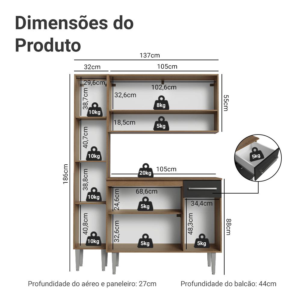 A Cozinha Compacta Emilly da Madesa foi projetada especialmente para otimizar pequenos ambientes, aproveitando cada cantinho de forma eficiente, sem perder a organização. Além disso, oferece um excelente custo-benefício, atendendo às suas necessidades com qualidade.A linha Emilly se destaca pelo acabamento de alta resistência, puxadores em alumínio e a utilização de corrediças e dobradiças metálicas, garantindo durabilidade. Os pés reguláveis proporcionam maior estabilidade e facilitam a limpeza do ambiente, tornando o dia a dia mais prático.Esta composição inclui um paneleiro com duas portas, um balcão com três portas e uma gaveta, um aéreo com duas portas e um nicho aberto, oferecendo amplos espaços para armazenamento e organização. O acabamento em tom amadeirado Rustic e Preto cria um visual moderno para a sua cozinha.Medidas totais:- 186 cm de altura- 137 cm de largura- 44 cm de profundidade nos balcões e 27cm nos aéreos/paneleiroO que você recebe:- Um paneleiro com duas portas- Um balcão de 105cm com três portas e uma gaveta (Acompanha o tampo)- Um aéreo de 105 com duas portas e um nicho abertoCódigo do produto: GREM1370117KÉ importante saber:- Material: MDP- Imagens meramente ilustrativas, a decoração não acompanha o produto- A Madesa não disponibiliza serviço de montagem- Por segurança, é obrigatório fixar o paneleiro e os aéreos na parede- O produto segue com manual de instalação e todas as ferragens necessárias para sua montagemA Madesa se dedica à sustentabilidade com várias iniciativas: temos uma usina própria que gera energia para uma das fábricas. Priorizamos fornecedores responsáveis com o meio ambiente. Todo o plástico utilizado na produção é reciclado, e as sobras também são reaproveitadas. Investimos no desenvolvimento de nossos colaboradores e em ações que beneficiem a comunidade.
