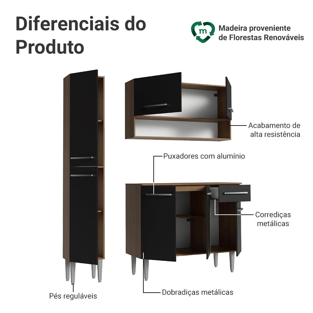 A Cozinha Compacta Emilly da Madesa foi criada para aproveitar cada cantinho da sua cozinha, você tem tudo o que precisa em um único espaço, unindo praticidade e funcionalidade.A linha Emilly se destaca pelo acabamento de alta resistência, puxadores em alumínio e corrediças e dobradiças metálicas, garantindo durabilidade e firmeza no uso diário. Os pés reguláveis oferecem maior estabilidade e facilitam a limpeza do ambiente.Esta composição inclui um paneleiro com duas portas, um balcão com três portas e uma gaveta, um aéreo com duas portas e um nicho aberto, oferecendo amplos espaços para armazenamento e organização. O acabamento em tom amadeirado Rustic e Preto cria um visual moderno para a sua cozinha.Medidas totais:- 186 cm de altura- 137 cm de largura- 44 cm de profundidade nos balcões e 27cm nos aéreos/paneleiroO que você recebe:- Um paneleiro com duas portas- Um balcão de 105cm com três portas e uma gaveta (Acompanha o tampo)- Um aéreo de 105 com duas portas e um nicho abertoCódigo do produto: GREM1370127KÉ importante saber:- Material: MDP- Imagens meramente ilustrativas, a decoração não acompanha o produto- A Madesa não disponibiliza serviço de montagem- Por segurança, é obrigatório fixar o paneleiro e os aéreos na parede- O produto segue com manual de instalação e todas as ferragens necessárias para sua montagemA Madesa se dedica à sustentabilidade com várias iniciativas: temos uma usina própria que gera energia para uma das fábricas. Priorizamos fornecedores responsáveis com o meio ambiente. Todo o plástico utilizado na produção é reciclado, e as sobras também são reaproveitadas. Investimos no desenvolvimento de nossos colaboradores e em ações que beneficiem a comunidade.