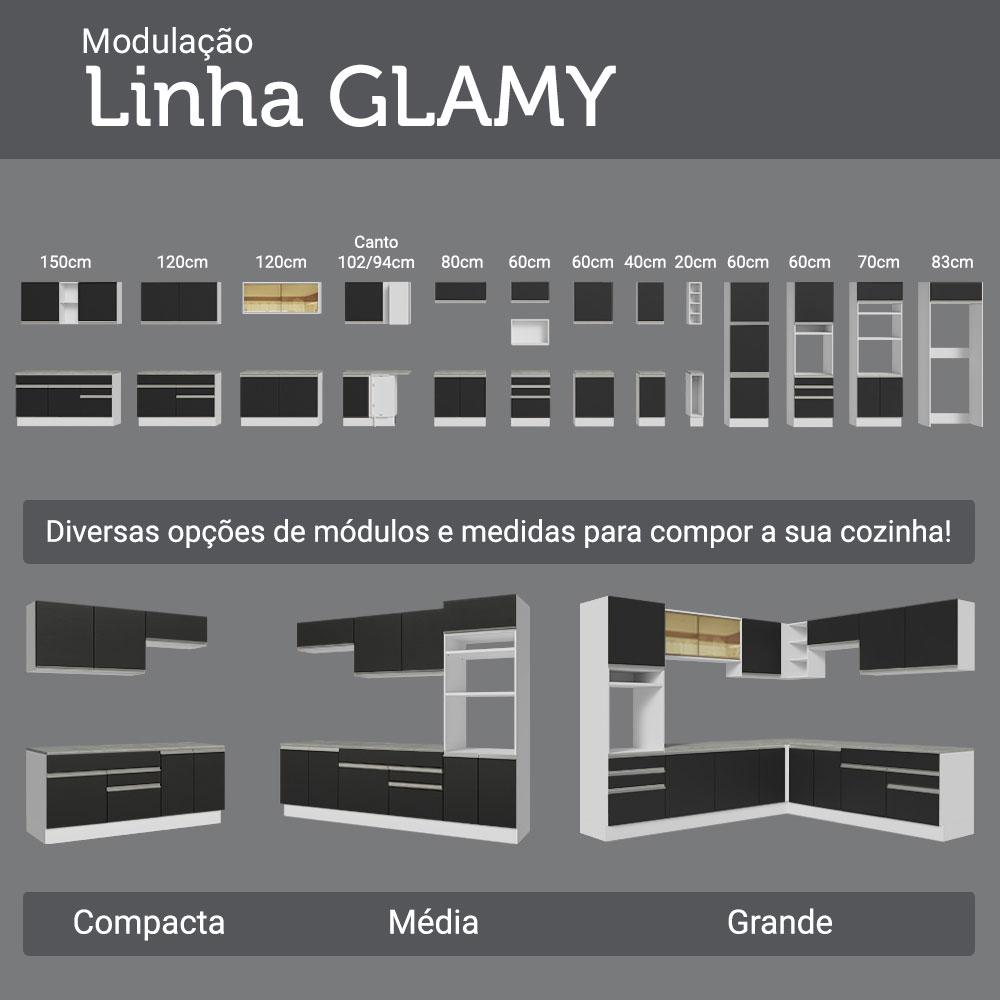 Modernidade e elegância definem bem este Armário de Cozinha Compacta da linha Glamy da Madesa.Composto por itens de muita qualidade, possui puxadores em alumínio, gavetas com corrediças telescópicas de abertura total, portas com amortecimento para fechamento suave e pés reguláveis em PVC.Um dos diferenciais deste modelo é a cristaleira. Muito sofisticada, possui duas portas de vidro e muito espaço disponível para organizar louças, copos e demais objetos.A cozinha ainda conta com diversas gavetas, prateleiras e nichos. Assim, fica mais fácil fazer a organização de todos os utensílios. Além disso, o balcão acompanha tampo, que pode ser removido para instalação de pia de inox ou pedra, nas medidas de 120 x 52 cm.Esta cozinha é planejada, composta por módulos avulsos que podem ser organizados conforme o espaço do seu ambiente. Também pode ser posteriormente complementada pelos módulos da linha Glamy da Madesa.E para completar, o acabamento do móvel combina os tons branco e preto.Medidas totais:- 225 cm de altura- 190 cm de largura- 52 cm de profundidade nos balcões e 31 cm no aéreo e na cristaleiraItens inclusos:- Uma (1) Cristaleira de 70 cm com duas (2) portas- Um (1) Balcão de 70 cm com duas (2) portas e tampo- Um (1) Aéreo de 120 cm com duas (2) portas- Um (1) Balcão de 120 cm com duas (2) portas, três (3) gavetas e tampoCódigo do produto: GRGL19000573Obs.:- A cristaleira não acompanha pés nem kit para suspender na parede. Deve ser instalada sobre o balcão e fixada na parede.- As imagens são meramente ilustrativas, os eletros e a decoração não acompanham o produto