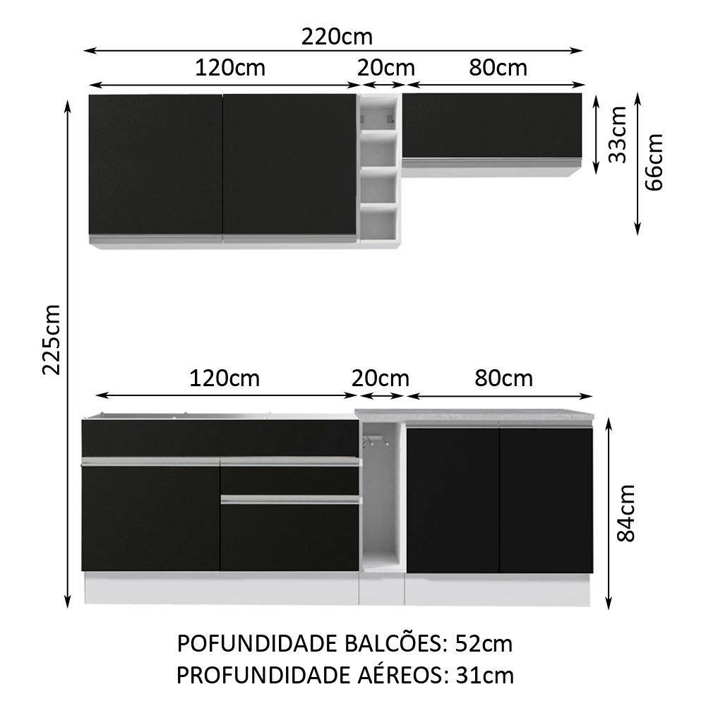 A Cozinha Parma é o novo lançamento da linha Glamy da Madesa. Entre os principais diferenciais estão o design moderno, o ótimo acabamento e os materiais de alta qualidade.Internamente o espaço é ótimo, com diversas divisórias e prateleiras. Destaque para as duas gavetas com corrediças telescópicas e para as portas, que possuem amortecedor para o fechamento suave.A profundidade é de cozinha planejada: 52 cm nos balcões e 31 cm nos aéreos. As medidas totais são: 220 cm de largura e 225 cm de altura.O balcão de pia comporta pias de 120 cm x 52 cm. Já o balcão de duas portas segue com tampo de 80 cm x 52 cm, em MDP com pintura Mood, que pode ser recortado para a colocação de cooktop.Para completar, todos os módulos inferiores contam com pés reguláveis em PVC e rodapé removível.O acabamento da estrutura interna e externa é branco. As portas e as frentes das gavetas são pretas. Os processos são feitos em Poliéster Protetor ecológico de alta resistência, que protege o móvel dos efeitos da água, do álcool e do calor.Esta cozinha pode ser complementada pelos módulos avulsos da linha Glamy da Madesa.(Imagens meramente ilustrativas: a decoração e os eletros não acompanha o produto.)Itens inclusos:- Um (1) Balcão de Pia com duas (2) gavetas e uma (1) porta (Não acompanha tampo deste balcão)- Um (1) Porta-Panos com tampo em MDP- Um (1) Balcão com duas (2) portas e tampo em MDP- Um (1) Armário Aéreo com duas (2) portas com detalhe- Um (1) Armário Aéreo com uma (1) porta basculante- Uma (1) AdegaCódigo do produto: GRGL22000373Obs.: A Madesa não disponibiliza serviço de montagem. O produto segue com manual de instalação e todas as ferragens necessárias para sua montagem.1-O produto é novo ou usado?R.: Todos os produtos da Madesa são novos, enviados da nossa fábrica diretamente para as casas de nossos clientes.2-O produto vem montado? Se não, vocês realizam a montagem?R.: A Madesa não disponibiliza serviço de montagem. Todos os produtos seguem com manual de instalação e as ferragens necessárias. Alguns produtos possuem vídeo explicando o passo a passo da montagem.3-Vocês possuem loja física? Posso retirar meu produto em mãos?R.: Não possuímos loja física, apenas loja virtual. Confira as opções de envio ao colocar o seu CEP.4-Qual é o valor do envio? Posso pagar separadamente?R.: O valor do envio é calculado com base no peso e volume do produto, e no CEP de destino. Você pode calcular o valor e prazo de entrega no simulador.5-A Madesa entrega em todo Brasil? Como é feita a entrega?R.: Sim, entregamos no Brasil inteiro através de transportadoras parceiras.6-O produto acompanha Nota Fiscal?R.: Sim, todos os produtos são entregues com suas respectivas notas fiscais.7-Os produtos possuem garantia?R.: Sim. A Madesa oferece 3 meses de garantia para defeitos de fabricação.A Madesa se dedica à sustentabilidade com várias iniciativas: temos uma usina própria para gerar energia que abastece uma de nossas fábricas. Selecionamos nossos fornecedores, priorizando aqueles que possuem um compromisso com a sustentabilidade e proteção do meio ambiente. Todo o plástico utilizado no setor produtivo é proveniente de reciclagem e as suas sobras são encaminhadas ao fornecedor que os recicla. Também investimos no desenvolvimento contínuo de nossos colaboradores e em ações educacionais que beneficiem a comunidade.