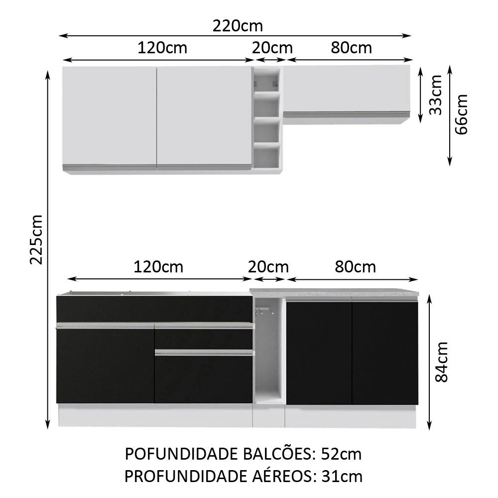 A Cozinha Parma é o novo lançamento da linha Glamy da Madesa. Entre os principais diferenciais estão o design moderno, o ótimo acabamento e os materiais de alta qualidade.Internamente o espaço é ótimo, com diversas divisórias e prateleiras. Destaque para as duas gavetas com corrediças telescópicas e para as portas, que possuem amortecedor para o fechamento suave.A profundidade é de cozinha planejada: 52 cm nos balcões e 31 cm nos aéreos. As medidas totais são: 220 cm de largura e 225 cm de altura.O balcão de pia comporta pias de 120 cm x 52 cm. Já o balcão de duas portas segue com tampo de 80 cm x 52 cm, em MDP com pintura Mood, que pode ser recortado para a colocação de cooktop.Para completar, todos os módulos inferiores contam com pés reguláveis em PVC e rodapé removível.O acabamento da cozinha é branco, com exceção das portas e frentes das gavetas dos balcões, que são pretas. O processo é feito em Poliéster Protetor ecológico de alta resistência, que protege o móvel dos efeitos da água, do álcool e do calor.Esta cozinha pode ser complementada pelos módulos avulsos da linha Glamy da Madesa.(Imagens meramente ilustrativas: a decoração e os eletros não acompanha o produto.)Itens inclusos:- Um (1) Balcão de Pia com duas (2) gavetas e uma (1) porta (Não acompanha tampo deste balcão)- Um (1) Porta-Panos com tampo em MDP- Um (1) Balcão com duas (2) portas e tampo em MDP- Um (1) Armário Aéreo com duas (2) portas- Um (1) Armário Aéreo com uma (1) porta basculante- Uma (1) AdegaCódigo do produto: GRGL220003C7Obs.: A Madesa não disponibiliza serviço de montagem. O produto segue com manual de instalação e todas as ferragens necessárias para sua montagem.1-O produto é novo ou usado?R.: Todos os produtos da Madesa são novos, enviados da nossa fábrica diretamente para as casas de nossos clientes.2-O produto vem montado? Se não, vocês realizam a montagem?R.: A Madesa não disponibiliza serviço de montagem. Todos os produtos seguem com manual de instalação e as ferragens necessárias. Alguns produtos possuem vídeo explicando o passo a passo da montagem.3-Vocês possuem loja física? Posso retirar meu produto em mãos?R.: Não possuímos loja física, apenas loja virtual. Confira as opções de envio ao colocar o seu CEP.4-Qual é o valor do envio? Posso pagar separadamente?R.: O valor do envio é calculado com base no peso e volume do produto, e no CEP de destino. Você pode calcular o valor e prazo de entrega no simulador.5-A Madesa entrega em todo Brasil? Como é feita a entrega?R.: Sim, entregamos no Brasil inteiro através de transportadoras parceiras.6-O produto acompanha Nota Fiscal?R.: Sim, todos os produtos são entregues com suas respectivas notas fiscais.7-Os produtos possuem garantia?R.: Sim. A Madesa oferece 3 meses de garantia para defeitos de fabricação.A Madesa se dedica à sustentabilidade com várias iniciativas: temos uma usina própria para gerar energia que abastece uma de nossas fábricas. Selecionamos nossos fornecedores, priorizando aqueles que possuem um compromisso com a sustentabilidade e proteção do meio ambiente. Todo o plástico utilizado no setor produtivo é proveniente de reciclagem e as suas sobras são encaminhadas ao fornecedor que os recicla. Também investimos no desenvolvimento contínuo de nossos colaboradores e em ações educacionais que beneficiem a comunidade.