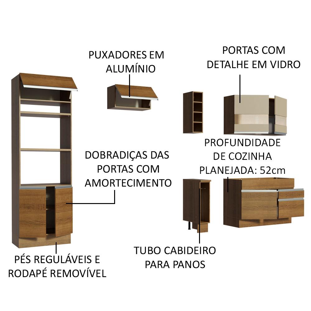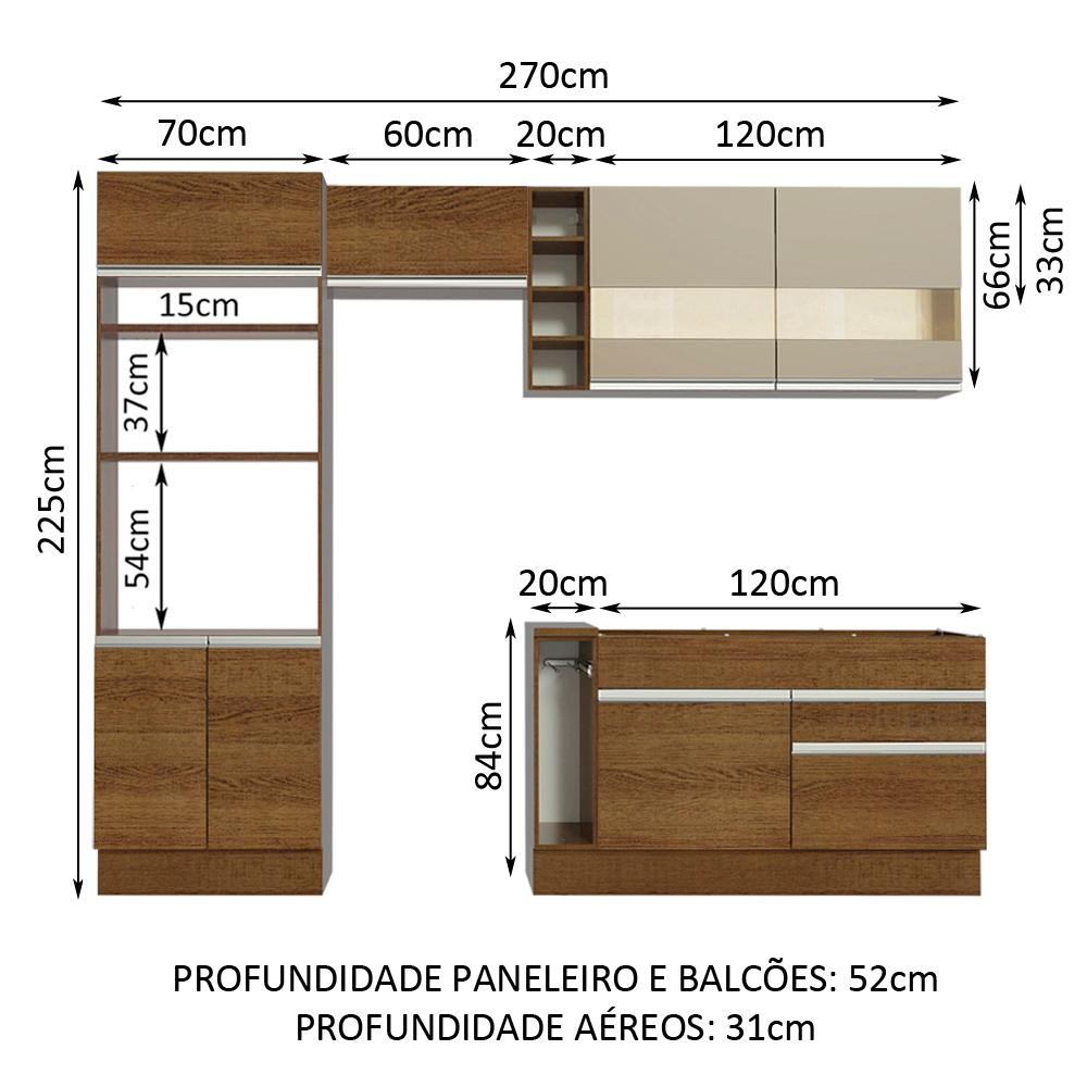 Design moderno, materiais de qualidade superior, muito espaço e funcionalidade no dia a dia! Esses são os grandes diferenciais da Cozinha Jade da Madesa.Assim como toda a linha de cozinhas Glamy, a Jade possui gavetas com corrediças telescópicas e todas as portas contam com amortecedores para o fechamento suave. Além disso, os puxadores são em alumínio, mais resistentes ao uso diário.Para completar, a profundidade da cozinha é ótima, com 52 cm na torre e nos balcões inferiores e 31 cm nos aéreos. As medidas totais da Cozinha Jade são: 270 cm de largura e 225 cm de altura.O balcão comporta pias de 120 cm x 52 cm. Não acompanha tampo para esse balcão. Além disso, todos os módulos inferiores possuem pés reguláveis em PVC e rodapé removível. A torre possui espaço para forno e micro-ondas e permite a instalação de forno embutido.O acabamento interno, externo e todas as portas e frentes das gavetas são no padrão amadeirado Rustic, com exceção das portas do aéreo de 120 cm, que são em pintura Crema. As costas e a parte interna das gavetas são brancas. O processo é feito em Pintura Poliéster ecológica, que consiste na aplicação de 7 camadas de proteção resistentes a álcool, água e calor.Esta cozinha pode ser complementada pelos módulos avulsos da linha Glamy da Madesa.As imagens são meramente ilustrativas. Os eletros, o tampo da pia, a torneira e a decoração não acompanham o produto.Itens inclusos:- Uma (1) Torre-Quente com dois (2) nichos para forno e micro-ondas, um (1) nicho menor e três (3) portas, sendo uma basculante- Um (1) Armário Aéreo com uma (1) porta basculante- Uma (1) Adega- Um (1) Armário Aéreo com duas (2) portas com detalhe em vidro Reflex- Um (1) Balcão Porta-Panos com tampo de MDP em pintura amadeirado Rustic- Um (1) Balcão de Pia com duas (2) gavetas e uma (1) porta (Não acompanha tampo.)Código do produto: GRGL2700089YObs.: A Madesa não disponibiliza serviço de montagem. O produto segue com manual de instalação e todas as ferragens necessárias para sua montagem.1-O produto é novo ou usado?R.: Todos os produtos da Madesa são novos, enviados da nossa fábrica diretamente para as casas de nossos clientes.2-O produto vem montado? Se não, vocês realizam a montagem?R.: A Madesa não disponibiliza serviço de montagem. Todos os produtos seguem com manual de instalação e as ferragens necessárias. Alguns produtos possuem vídeo explicando o passo a passo da montagem.3-Vocês possuem loja física? Posso retirar meu produto em mãos?R.: Não possuímos loja física, apenas loja virtual. Confira as opções de envio ao colocar o seu CEP.4-Qual é o valor do envio? Posso pagar separadamente?R.: O valor do envio é calculado com base no peso e volume do produto, e no CEP de destino. Você pode calcular o valor e prazo de entrega no simulador.5-A Madesa entrega em todo Brasil? Como é feita a entrega?R.: Sim, entregamos no Brasil inteiro através de transportadoras parceiras.6-Os produtos possuem garantia?R.: Sim. A Madesa oferece 3 meses de garantia para defeitos de fabricação.A Madesa se dedica à sustentabilidade com várias iniciativas: temos uma usina própria para gerar energia que abastece uma de nossas fábricas. Selecionamos nossos fornecedores, priorizando aqueles que possuem um compromisso com a sustentabilidade e proteção do meio ambiente. Todo o plástico utilizado no setor produtivo é proveniente de reciclagem e as suas sobras são encaminhadas ao fornecedor que os recicla. Também investimos no desenvolvimento contínuo de nossos colaboradores e em ações educacionais que beneficiem a comunidade.