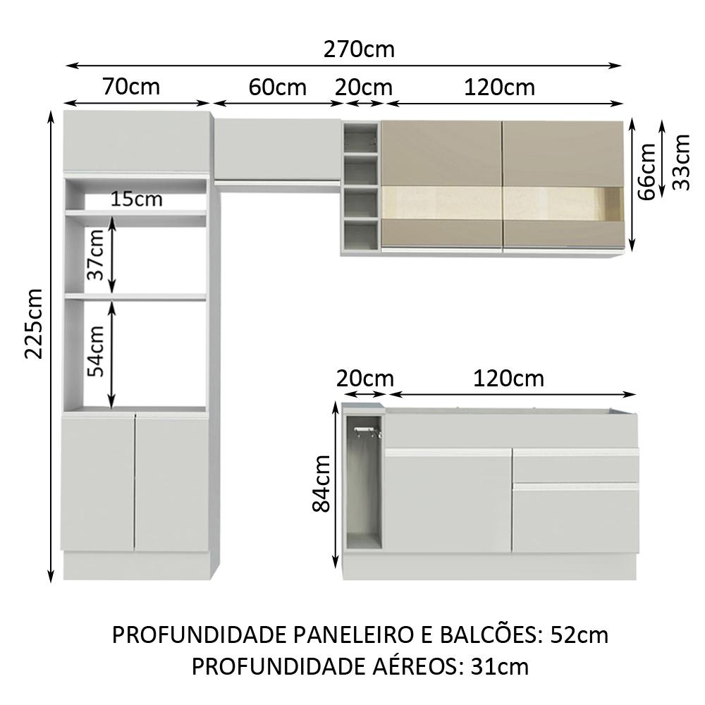Design moderno, materiais de qualidade superior, muito espaço e funcionalidade no dia a dia! Esses são os grandes diferenciais da Cozinha Jade da Madesa.Assim como toda a linha de cozinhas Glamy, a Jade possui gavetas com corrediças telescópicas e todas as portas contam com amortecedores para o fechamento suave. Além disso, os puxadores são em alumínio, mais resistentes ao uso diário.Para completar, a profundidade da cozinha é ótima, com 52 cm na torre e nos balcões inferiores e 31 cm nos aéreos. As medidas totais da Cozinha Jade são: 270 cm de largura e 225 cm de altura.O balcão comporta pias de 120 cm x 52 cm. Não acompanha tampo para esse balcão. Além disso, todos os módulos inferiores possuem pés reguláveis em PVC e rodapé removível.O acabamento interno e externo é branco, com exceção das portas do aéreo de 120 cm, que são em pintura Crema. O processo é feito em Pintura Poliéster ecológica, que consiste na aplicação de 7 camadas de proteção resistentes a álcool, água e calor.Esta cozinha pode ser complementada pelos módulos avulsos da linha Glamy da Madesa.As imagens são meramente ilustrativas. Os eletros, o tampo da pia, a torneira e a decoração não acompanham o produto.Itens inclusos:- Uma (1) Torre-Quente com dois (2) nichos para forno e micro-ondas, um (1) nicho menor e três (3) portas, sendo uma basculante- Um (1) Armário Aéreo com uma (1) porta basculante- Uma (1) Adega- Um (1) Armário Aéreo com duas (2) portas com detalhe em vidro Reflex- Um (1) Balcão Porta-Panos com tampo de MDP em pintura Mood- Um (1) Balcão de Pia com duas (2) gavetas e uma (1) porta (Não acompanha tampo.)Código do produto: GRGL270008A5Obs.: A Madesa não disponibiliza serviço de montagem. O produto segue com manual de instalação e todas as ferragens necessárias para sua montagem.1-O produto é novo ou usado?R.: Todos os produtos da Madesa são novos, enviados da nossa fábrica diretamente para as casas de nossos clientes.2-O produto vem montado? Se não, vocês realizam a montagem?R.: A Madesa não disponibiliza serviço de montagem. Todos os produtos seguem com manual de instalação e as ferragens necessárias. Alguns produtos possuem vídeo explicando o passo a passo da montagem.3-Vocês possuem loja física? Posso retirar meu produto em mãos?R.: Não possuímos loja física, apenas loja virtual. Confira as opções de envio ao colocar o seu CEP.4-Qual é o valor do envio? Posso pagar separadamente?R.: O valor do envio é calculado com base no peso e volume do produto, e no CEP de destino. Você pode calcular o valor e prazo de entrega no simulador.5-A Madesa entrega em todo Brasil? Como é feita a entrega?R.: Sim, entregamos no Brasil inteiro através de transportadoras parceiras.6-O produto acompanha Nota Fiscal?R.: Sim, todos os produtos são entregues com suas respectivas notas fiscais.7-Os produtos possuem garantia?R.: Sim. A Madesa oferece 3 meses de garantia para defeitos de fabricação.A Madesa se dedica à sustentabilidade com várias iniciativas: temos uma usina própria para gerar energia que abastece uma de nossas fábricas. Selecionamos nossos fornecedores, priorizando aqueles que possuem um compromisso com a sustentabilidade e proteção do meio ambiente. Todo o plástico utilizado no setor produtivo é proveniente de reciclagem e as suas sobras são encaminhadas ao fornecedor que os recicla. Também investimos no desenvolvimento contínuo de nossos colaboradores e em ações educacionais que beneficiem a comunidade.