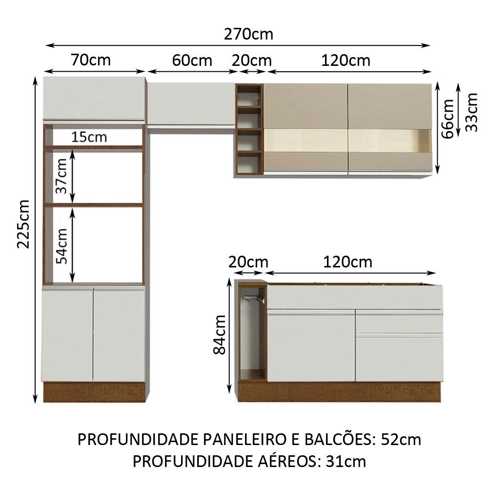 Design moderno, materiais de qualidade superior, muito espaço e funcionalidade no dia a dia! Esses são os grandes diferenciais da Cozinha Jade da Madesa.Assim como toda a linha de cozinhas Glamy, a Jade possui gavetas com corrediças telescópicas e todas as portas contam com amortecedores para o fechamento suave. Além disso, os puxadores são em alumínio, mais resistentes ao uso diário.Para completar, a profundidade da cozinha é ótima, com 52 cm na torre e nos balcões inferiores e 31 cm nos aéreos. As medidas totais da Cozinha Jade são: 270 cm de largura e 225 cm de altura.O balcão comporta pias de 120 cm x 52 cm. Não acompanha tampo para esse balcão. Além disso, todos os módulos inferiores possuem pés reguláveis em PVC e rodapé removível. A torre possui espaço para forno e micro-ondas e permite a instalação de forno embutido.O acabamento interno e externo é no padrão amadeirado Rustic e todas as portas e frentes das gavetas são brancas, com exceção das portas do aéreo de 120 cm, que são em pintura Crema. As partes internas das gavetas e das costas são brancas. O processo é feito em Pintura Poliéster ecológica, que consiste na aplicação de 7 camadas de proteção resistentes a álcool, água e calor.Esta cozinha pode ser complementada pelos módulos avulsos da linha Glamy da Madesa.As imagens são meramente ilustrativas. Os eletros, o tampo da pia, a torneira e a decoração não acompanham o produto.Itens inclusos:- Uma (1) Torre-Quente com dois (2) nichos para forno e micro-ondas, um (1) nicho menor e três (3) portas, sendo uma basculante- Um (1) Armário Aéreo com uma (1) porta basculante- Uma (1) Adega- Um (1) Armário Aéreo com duas (2) portas com detalhe em vidro Reflex- Um (1) Balcão Porta-Panos com tampo de MDP em pintura amadeirado Rustic- Um (1) Balcão de Pia com duas (2) gavetas e uma (1) porta (Não acompanha tampo.)Código do produto: GRGL270008A7Obs.: A Madesa não disponibiliza serviço de montagem. O produto segue com manual de instalação e todas as ferragens necessárias para sua montagem.1-O produto é novo ou usado?R.: Todos os produtos da Madesa são novos, enviados da nossa fábrica diretamente para as casas de nossos clientes.2-O produto vem montado? Se não, vocês realizam a montagem?R.: A Madesa não disponibiliza serviço de montagem. Todos os produtos seguem com manual de instalação e as ferragens necessárias. Alguns produtos possuem vídeo explicando o passo a passo da montagem.3-Vocês possuem loja física? Posso retirar meu produto em mãos?R.: Não possuímos loja física, apenas loja virtual. Confira as opções de envio ao colocar o seu CEP.4-Qual é o valor do envio? Posso pagar separadamente?R.: O valor do envio é calculado com base no peso e volume do produto, e no CEP de destino. Você pode calcular o valor e prazo de entrega no simulador.5-A Madesa entrega em todo Brasil? Como é feita a entrega?R.: Sim, entregamos no Brasil inteiro através de transportadoras parceiras.6-Os produtos possuem garantia?R.: Sim. A Madesa oferece 3 meses de garantia para defeitos de fabricação.A Madesa se dedica à sustentabilidade com várias iniciativas: temos uma usina própria para gerar energia que abastece uma de nossas fábricas. Selecionamos nossos fornecedores, priorizando aqueles que possuem um compromisso com a sustentabilidade e proteção do meio ambiente. Todo o plástico utilizado no setor produtivo é proveniente de reciclagem e as suas sobras são encaminhadas ao fornecedor que os recicla. Também investimos no desenvolvimento contínuo de nossos colaboradores e em ações educacionais que beneficiem a comunidade.