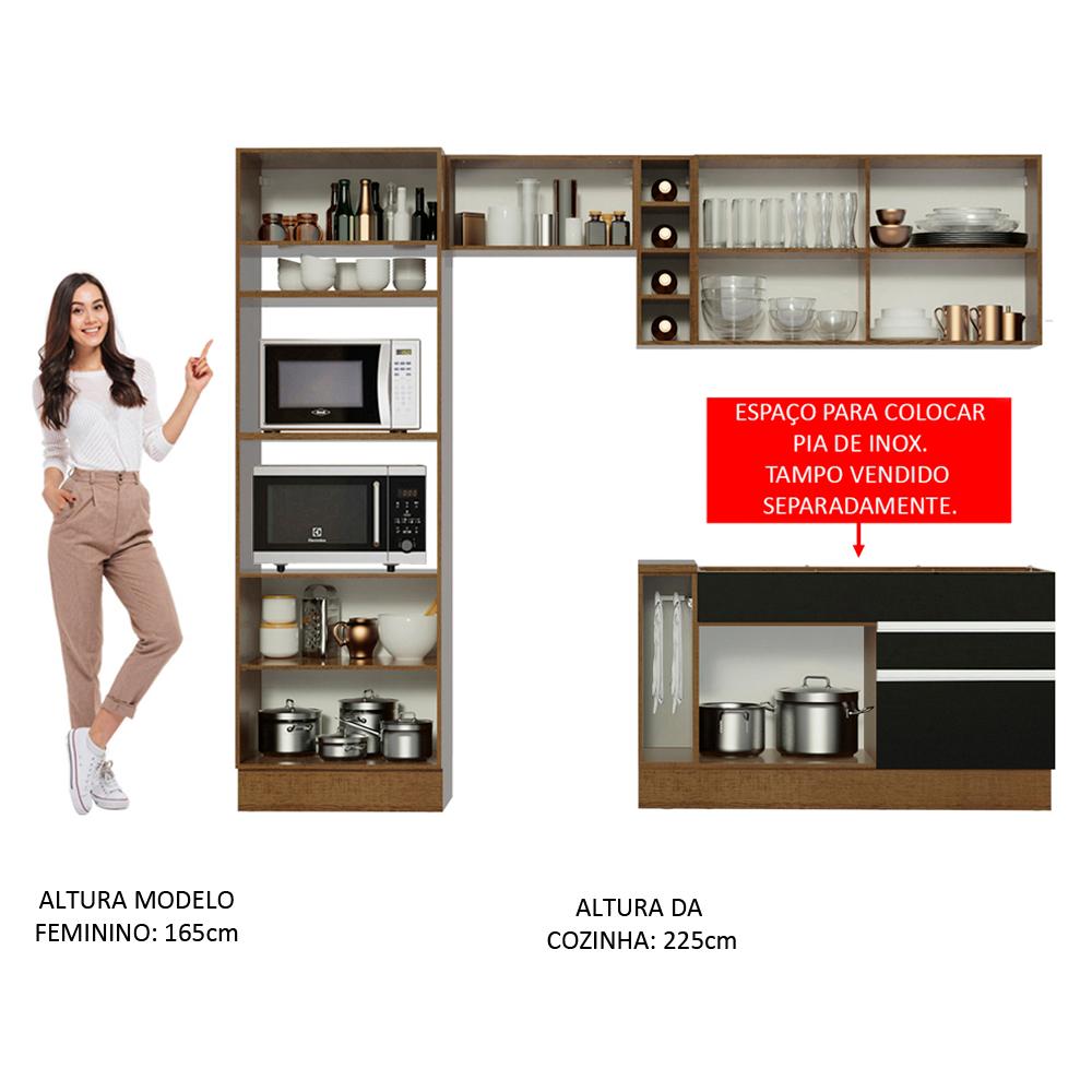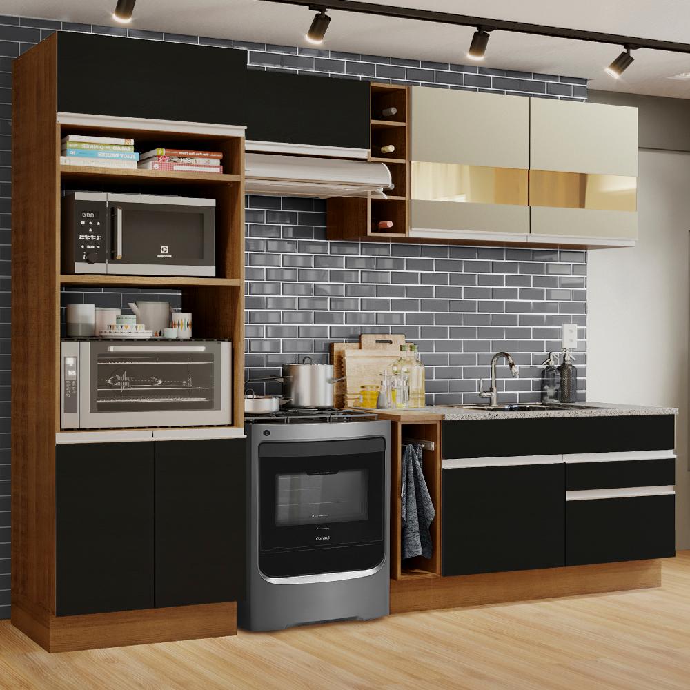 Design moderno, materiais de qualidade superior, muito espaço e funcionalidade no dia a dia! Esses são os grandes diferenciais da Cozinha Jade da Madesa.Assim como toda a linha de cozinhas Glamy, a Jade possui gavetas com corrediças telescópicas e todas as portas contam com amortecedores para o fechamento suave. Além disso, os puxadores são em alumínio, mais resistentes ao uso diário.Para completar, a profundidade da cozinha é ótima, com 52 cm na torre e nos balcões inferiores e 31 cm nos aéreos. As medidas totais da Cozinha Jade são: 270 cm de largura e 225 cm de altura.O balcão comporta pias de 120 cm x 52 cm. Não acompanha tampo para esse balcão. Além disso, todos os módulos inferiores possuem pés reguláveis em PVC e rodapé removível.A torre possui espaço para forno e micro-ondas e permite a instalação de forno embutido.O acabamento interno e externo é no padrão amadeirado Rustic e todas as portas e frentes das gavetas são pretas, com exceção das portas do aéreo de 120 cm, que são em pintura Crema. As partes internas das gavetas e das costas são brancas. O processo é feito em Pintura Poliéster ecológica, que consiste na aplicação de 7 camadas de proteção resistentes a álcool, água e calor.Esta cozinha pode ser complementada pelos módulos avulsos da linha Glamy da Madesa.As imagens são meramente ilustrativas. Os eletros, o tampo da pia, a torneira e a decoração não acompanham o produto.Itens inclusos:- Uma (1) Torre-Quente com dois (2) nichos para forno e micro-ondas, um (1) nicho menor e três (3) portas, sendo uma basculante- Um (1) Armário Aéreo com uma (1) porta basculante- Uma (1) Adega- Um (1) Armário Aéreo com duas (2) portas com detalhe em vidro Reflex- Um (1) Balcão Porta-Panos com tampo de MDP em pintura amadeirado Rustic- Um (1) Balcão de Pia com duas (2) gavetas e uma (1) porta (Não acompanha tampo.)Código do produto: GRGL270008C3Obs.: A Madesa não disponibiliza serviço de montagem. O produto segue com manual de instalação e todas as ferragens necessárias para sua montagem.1-O produto é novo ou usado?R.: Todos os produtos da Madesa são novos, enviados da nossa fábrica diretamente para as casas de nossos clientes.2-O produto vem montado? Se não, vocês realizam a montagem?R.: A Madesa não disponibiliza serviço de montagem. Todos os produtos seguem com manual de instalação e as ferragens necessárias. Alguns produtos possuem vídeo explicando o passo a passo da montagem.3-Vocês possuem loja física? Posso retirar meu produto em mãos?R.: Não possuímos loja física, apenas loja virtual. Confira as opções de envio ao colocar o seu CEP.4-Qual é o valor do envio? Posso pagar separadamente?R.: O valor do envio é calculado com base no peso e volume do produto, e no CEP de destino. Você pode calcular o valor e prazo de entrega no simulador.5-A Madesa entrega em todo Brasil? Como é feita a entrega?R.: Sim, entregamos no Brasil inteiro através de transportadoras parceiras.6-Os produtos possuem garantia?R.: Sim. A Madesa oferece 3 meses de garantia para defeitos de fabricação.A Madesa se dedica à sustentabilidade com várias iniciativas: temos uma usina própria para gerar energia que abastece uma de nossas fábricas. Selecionamos nossos fornecedores, priorizando aqueles que possuem um compromisso com a sustentabilidade e proteção do meio ambiente. Todo o plástico utilizado no setor produtivo é proveniente de reciclagem e as suas sobras são encaminhadas ao fornecedor que os recicla. Também investimos no desenvolvimento contínuo de nossos colaboradores e em ações educacionais que beneficiem a comunidade.