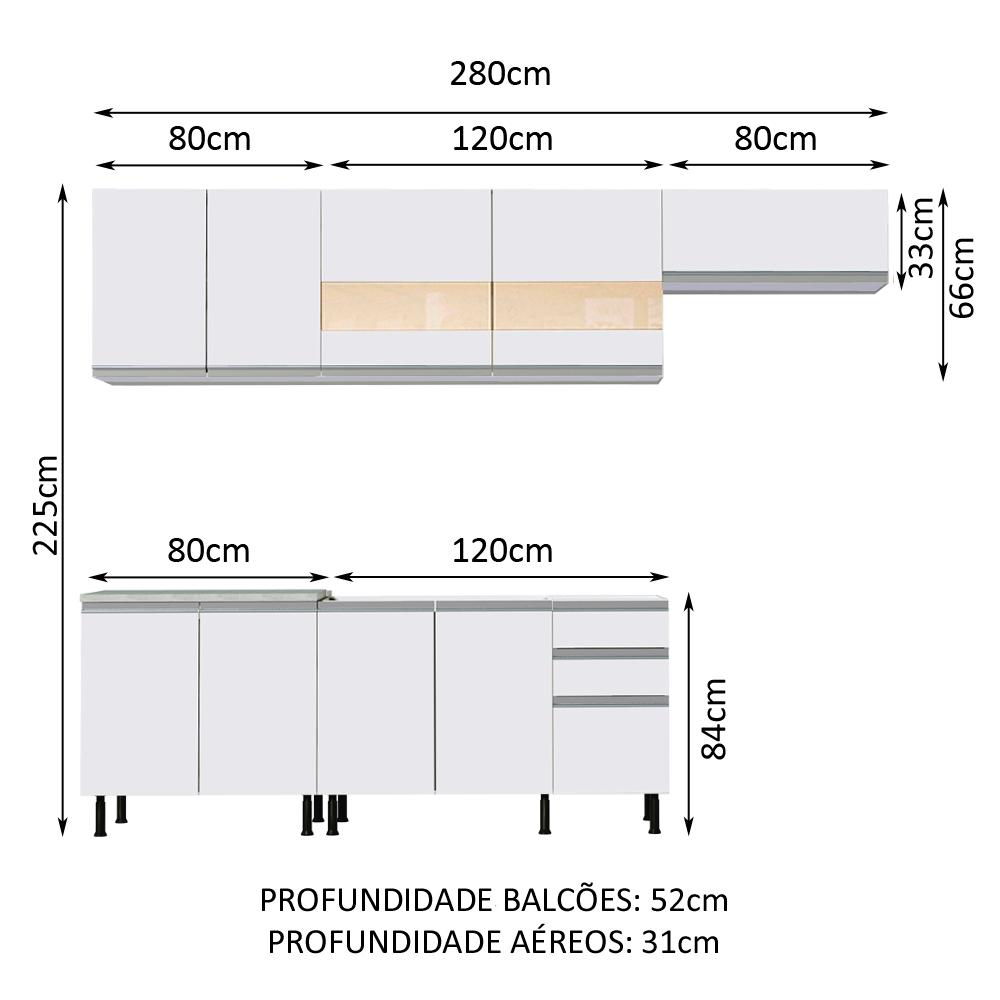 A Cozinha Completa Marcela da linha Glamy da Madesa é a cozinha que você sempre sonhou. Sua distribuição é pensada de forma inteligente proporcionando um ótimo aproveitamento dos espaços e possibilitando o encaixe perfeito da geladeira.As gavetas possuem corrediça telescópica e todas as portas possuem amortecedor para o fechamento suave. Esses itens de qualidade superior conferem durabilidade e maior vida útil do móvel.Outro grande diferencial desta cozinha é a profundidade maior, como uma cozinha planejada: 52 cm nos balcões inferiores e 31 cm nos aéreos. As medidas totais da Cozinha Madesa Marcela são: 280 cm de largura e 225 cm de altura.O aéreo com portas em vidro reflex traz modernidade ao ambiente e o balcão de 80 cm possui tampo que pode ser recortado para instalação de cooktop.O acabamento interno e externo é branco, em pintura em Poliéster Protetor que consiste na aplicação de 7 camadas de proteção resistentes a álcool, água e calor. Além disso, o processo é ecológico, isento de vapores que prejudicam a atmosfera.Esta cozinha pode ser complementada pelos módulos avulsos da linha Glamy da Madesa.(Imagem ilustrativa: os eletros, o tampo da pia, a torneira e a decoração não acompanham o produto).Itens inclusos:- Um (1) balcão de 80 cm com duas (2) portas e tampo- Um (1) aéreo de 80 cm com duas (2) portas- Um (1) balcão de pia de 120 cm de largura com duas (2) portas e três (3) gavetas, sendo uma maior (não acompanha o tampo deste balcão)- Um (1) aéreo de 120 cm com duas (2) portas com detalhe em vidro reflex- Um (1) aéreo de 80 cm com uma (1) porta basculante.Código do produto: GRGL28000309SRObs.: A Madesa não disponibiliza serviço de montagem. O produto segue com manual de instalação e todas as ferragens necessárias para sua montagem.1-O produto é novo ou usado?R.: Todos os produtos da Madesa são novos, enviados da nossa fábrica diretamente para as casas de nossos clientes.2-O produto vem montado? Se não, vocês realizam a montagem?R.: A Madesa não disponibiliza serviço de montagem. Todos os produtos seguem com manual de instalação e as ferragens necessárias. Alguns produtos possuem vídeo explicando o passo a passo da montagem.3-Vocês possuem loja física? Posso retirar meu produto em mãos?R.: Não possuímos loja física, apenas loja virtual. Confira as opções de envio ao colocar o seu CEP.4-Qual é o valor do envio? Posso pagar separadamente?R.: O valor do envio é calculado com base no peso e volume do produto, e no CEP de destino. Você pode calcular o valor e prazo de entrega no simulador.5-A Madesa entrega em todo Brasil? Como é feita a entrega?R.: Sim, entregamos no Brasil inteiro através de transportadoras parceiras.6-O produto acompanha Nota Fiscal?R.: Sim, todos os produtos são entregues com suas respectivas notas fiscais.7-Os produtos possuem garantia?R.: Sim. A Madesa oferece 3 meses de garantia para defeitos de fabricação.A Madesa se dedica à sustentabilidade com várias iniciativas: temos uma usina própria para gerar energia que abastece uma de nossas fábricas. Selecionamos nossos fornecedores, priorizando aqueles que possuem um compromisso com a sustentabilidade e proteção do meio ambiente. Todo o plástico utilizado no setor produtivo é proveniente de reciclagem e as suas sobras são encaminhadas ao fornecedor que os recicla. Também investimos no desenvolvimento contínuo de nossos colaboradores e em ações educacionais que beneficiem a comunidade.