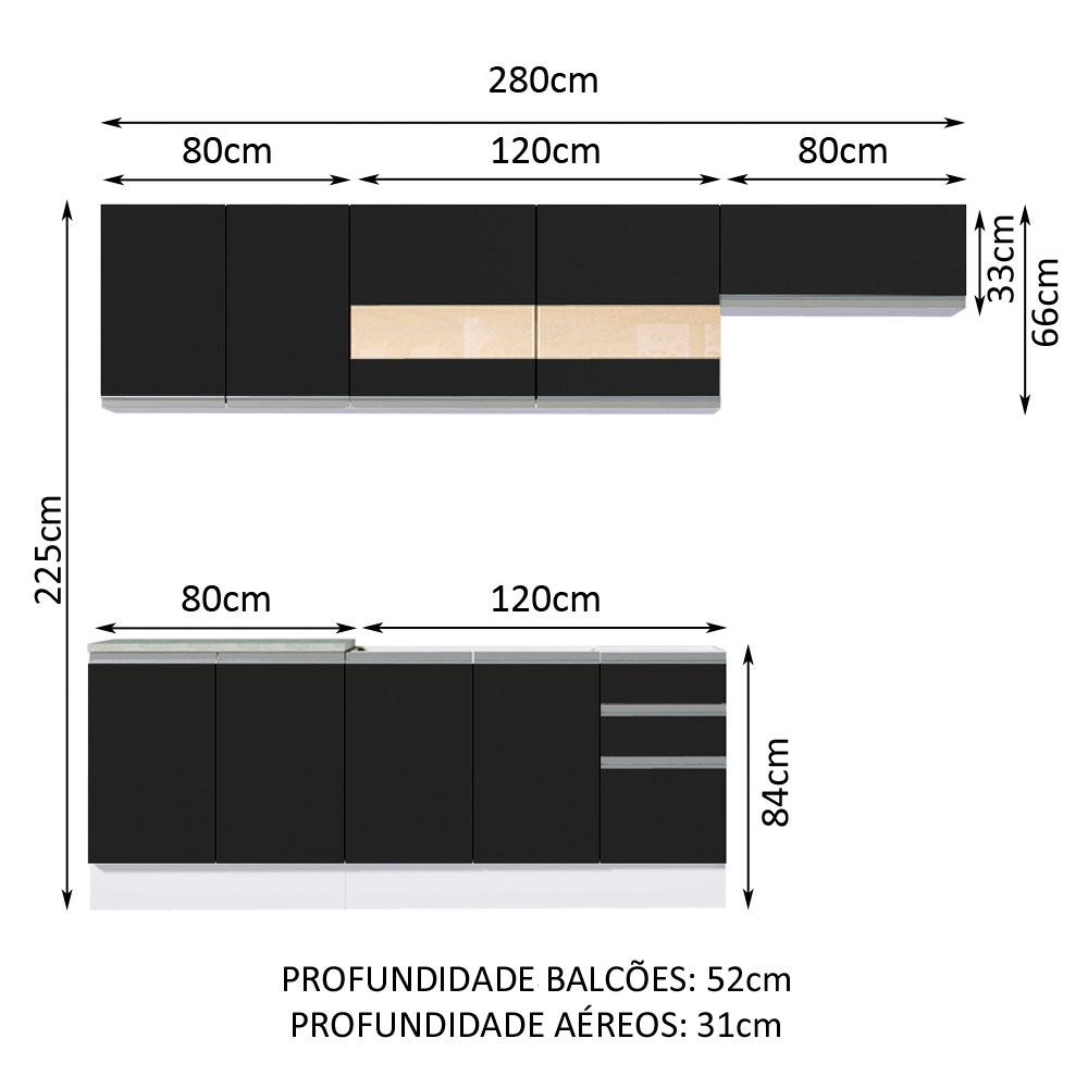A Cozinha Completa Marcela da linha Glamy da Madesa é a cozinha que você sempre sonhou. Sua distribuição é pensada de forma inteligente proporcionando um ótimo aproveitamento dos espaços e possibilitando o encaixe perfeito da geladeira.As gavetas possuem corrediça telescópica e todas as portas possuem amortecedor para o fechamento suave. Esses itens de qualidade superior conferem durabilidade e maior vida útil do móvel.Outro grande diferencial desta cozinha é a profundidade maior, como uma cozinha planejada: 52 cm nos balcões inferiores e 31 cm nos aéreos. As medidas totais da Cozinha Madesa Marcela são: 280 cm de largura e 225 cm de altura.O aéreo com portas em vidro reflex traz modernidade ao ambiente e o balcão de 80 cm possui tampo que pode ser recortado para instalação de cooktop.O acabamento da estrutura interna e externa é no padrão amadeirado Rustic. As portas e frentes das gavetas são pretas. A parte interna das gavetas e as costas são brancas. A pintura ecológica em Poliéster Protetor consiste na aplicação de 7 camadas de proteção resistentes a álcool, água e calor.Esta cozinha pode ser complementada pelos módulos avulsos da linha Glamy da Madesa.(Imagem ilustrativa: os eletros, o tampo da pia, a torneira e a decoração não acompanham o produto).Itens inclusos:- Um (1) balcão de 80 cm com duas (2) portas e tampo- Um (1) aéreo de 80 cm com duas (2) portas- Um (1) balcão de pia de 120 cm de largura com duas (2) portas e três (3) gavetas, sendo uma maior (não acompanha o tampo deste balcão)- Um (1) aéreo de 120 cm com duas (2) portas com detalhe em vidro reflex- Um (1) aéreo de 80 cm com uma (1) porta basculanteCódigo do produto: GRGL28000373Obs.: A Madesa não disponibiliza serviço de montagem. O produto segue com manual de instalação e todas as ferragens necessárias para sua montagem.1-O produto é novo ou usado?R.: Todos os produtos da Madesa são novos, enviados da nossa fábrica diretamente para as casas de nossos clientes.2-O produto vem montado? Se não, vocês realizam a montagem?R.: A Madesa não disponibiliza serviço de montagem. Todos os produtos seguem com manual de instalação e as ferragens necessárias. Alguns produtos possuem vídeo explicando o passo a passo da montagem.3-Vocês possuem loja física? Posso retirar meu produto em mãos?R.: Não possuímos loja física, apenas loja virtual. Confira as opções de envio ao colocar o seu CEP.4-Qual é o valor do envio? Posso pagar separadamente?R.: O valor do envio é calculado com base no peso e volume do produto, e no CEP de destino. Você pode calcular o valor e prazo de entrega no simulador.5-A Madesa entrega em todo Brasil? Como é feita a entrega?R.: Sim, entregamos no Brasil inteiro através de transportadoras parceiras.6-O produto acompanha Nota Fiscal?R.: Sim, todos os produtos são entregues com suas respectivas notas fiscais.7-Os produtos possuem garantia?R.: Sim. A Madesa oferece 3 meses de garantia para defeitos de fabricação.A Madesa se dedica à sustentabilidade com várias iniciativas: temos uma usina própria para gerar energia que abastece uma de nossas fábricas. Selecionamos nossos fornecedores, priorizando aqueles que possuem um compromisso com a sustentabilidade e proteção do meio ambiente. Todo o plástico utilizado no setor produtivo é proveniente de reciclagem e as suas sobras são encaminhadas ao fornecedor que os recicla. Também investimos no desenvolvimento contínuo de nossos colaboradores e em ações educacionais que beneficiem a comunidade.