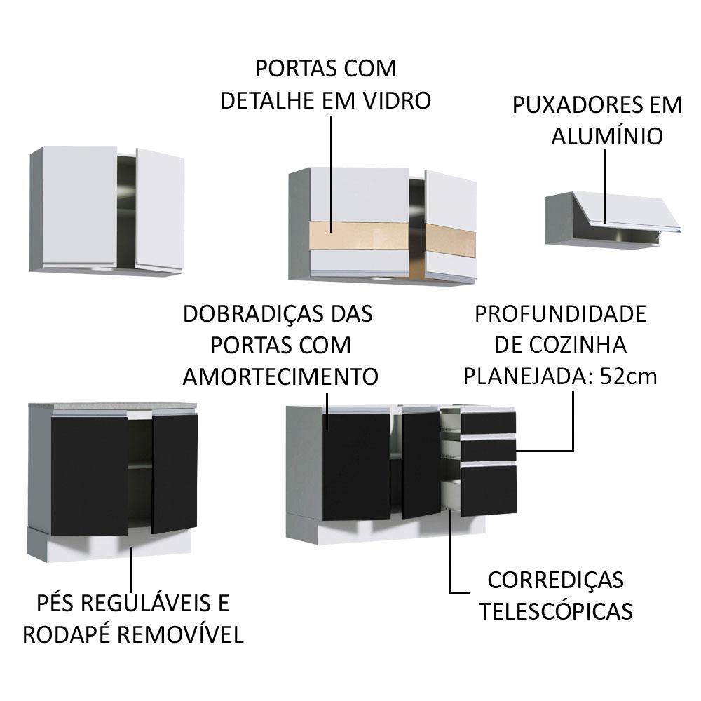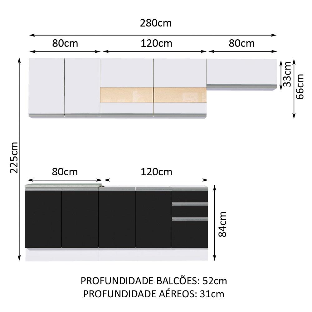 A Cozinha Completa Marcela da linha Glamy da Madesa é a cozinha que você sempre sonhou. Sua distribuição é pensada de forma inteligente proporcionando um ótimo aproveitamento dos espaços e possibilitando o encaixe perfeito da geladeira.As gavetas possuem corrediça telescópica e todas as portas possuem amortecedor para o fechamento suave. Esses itens de qualidade superior conferem durabilidade e maior vida útil do móvel.Outro grande diferencial desta cozinha é a profundidade maior, como uma cozinha planejada: 52 cm nos balcões inferiores e 31 cm nos aéreos. As medidas totais da Cozinha Madesa Marcela são: 280 cm de largura e 225 cm de altura.O aéreo com portas em vidro reflex traz modernidade ao ambiente e o balcão de 80 cm possui tampo que pode ser recortado para instalação de cooktop.O acabamento da estrutura interna, externa e das portas dos aéreos é branco. As portas dos balcões e frentes das gavetas são pretas. A pintura ecológica em Poliéster Protetor consiste na aplicação de 7 camadas de proteção resistentes a álcool, água e calor.Esta cozinha pode ser complementada pelos módulos avulsos da linha Glamy da Madesa.(Imagem ilustrativa: os eletros, o tampo da pia, a torneira e a decoração não acompanham o produto).Itens inclusos:- Um (1) balcão de 80 cm com duas (2) portas e tampo- Um (1) aéreo de 80 cm com duas (2) portas- Um (1) balcão de pia de 120 cm de largura com duas (2) portas e três (3) gavetas, sendo uma maior (não acompanha o tampo deste balcão)- Um (1) aéreo de 120 cm com duas (2) portas com detalhe em vidro reflex- Um (1) aéreo de 80 cm com uma (1) porta basculanteCódigo do produto: GRGL280003C7Obs.: A Madesa não disponibiliza serviço de montagem. O produto segue com manual de instalação e todas as ferragens necessárias para sua montagem.1-O produto é novo ou usado?R.: Todos os produtos da Madesa são novos, enviados da nossa fábrica diretamente para as casas de nossos clientes.2-O produto vem montado? Se não, vocês realizam a montagem?R.: A Madesa não disponibiliza serviço de montagem. Todos os produtos seguem com manual de instalação e as ferragens necessárias. Alguns produtos possuem vídeo explicando o passo a passo da montagem.3-Vocês possuem loja física? Posso retirar meu produto em mãos?R.: Não possuímos loja física, apenas loja virtual. Confira as opções de envio ao colocar o seu CEP.4-Qual é o valor do envio? Posso pagar separadamente?R.: O valor do envio é calculado com base no peso e volume do produto, e no CEP de destino. Você pode calcular o valor e prazo de entrega no simulador.5-A Madesa entrega em todo Brasil? Como é feita a entrega?R.: Sim, entregamos no Brasil inteiro através de transportadoras parceiras.6-O produto acompanha Nota Fiscal?R.: Sim, todos os produtos são entregues com suas respectivas notas fiscais.7-Os produtos possuem garantia?R.: Sim. A Madesa oferece 3 meses de garantia para defeitos de fabricação.A Madesa se dedica à sustentabilidade com várias iniciativas: temos uma usina própria para gerar energia que abastece uma de nossas fábricas. Selecionamos nossos fornecedores, priorizando aqueles que possuem um compromisso com a sustentabilidade e proteção do meio ambiente. Todo o plástico utilizado no setor produtivo é proveniente de reciclagem e as suas sobras são encaminhadas ao fornecedor que os recicla. Também investimos no desenvolvimento contínuo de nossos colaboradores e em ações educacionais que beneficiem a comunidade.