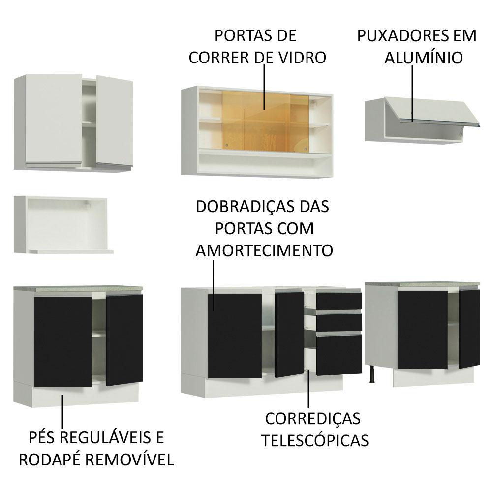 A Cozinha Completa Genova da linha Glamy da Madesa possui um design moderno e se destaca pelo ótimo acabamento. Um grande diferencial são os itens de qualidade superior, como puxadores em perfil total de alumínio, gavetas com corrediças telescópicas e portas com amortecedor para o fechamento suave.O armário aéreo com portas de correr de vidro reflex traz sofisticação ao ambiente, podendo revelar sutilmente o interior do móvel ou refletir o espaço, variando de acordo com a iluminação. Outra característica especial desta cozinha é a profundidade maior, como uma cozinha planejada: 52 cm nos módulos inferiores e 31 cm nos aéreos. Para completar, possui pés reguláveis em PVC e rodapé removível.Medidas totais da cozinha: 280 cm de largura e 225 cm de altura. O balcão de pia comporta pias de 120 cm x 52 cm. Não acompanha tampo.O acabamento interno e externo é branco, com exceção das portas dos balcões e das frentes das gavetas, que são pretas. O processo é feito em Pintura Poliéster com 7 camadas de proteção resistentes a álcool, água e calor. Além disso, é ecológico, isento de vapores que vão para a atmosfera.Esta cozinha pode ser complementada pelos módulos avulsos da linha Glamy da Madesa.(As imagens são meramente ilustrativas. Os eletros, o tampo da pia, a torneira e a decoração não acompanham o produto.)Itens inclusos:- Um (1) armário aéreo de 80 cm com duas (2) portas- Um (1) nicho de 60 cm para forno- Um (1) armário aéreo de 120 cm com duas (2) portas de correr de vidro Reflex e um (1) nicho- Um (1) balcão de 120 cm com duas (2) portas, três (3) gavetas (não acompanha o tampo deste balcão)- Um (1) armário aéreo de 80 cm com uma (1) porta basculante com pistão a gás- Dois (2) balcões de 80 cm, cada um com duas (2) portas e tampo em MDP em pintura MoodCódigo do produto: GRGL280004C7Obs.: A Madesa não disponibiliza serviço de montagem. O produto segue com manual de instalação e todas as ferragens necessárias para sua montagem.1 – O produto é novo ou usado?R.: Todos os produtos da Madesa são novos, enviados da nossa fábrica diretamente para as casas de nossos clientes.2 – O produto vem montado? Se não, vocês realizam a montagem?R.: A Madesa não disponibiliza serviço de montagem. Todos os produtos seguem com manual de instalação e as ferragens necessárias. Alguns produtos possuem vídeo explicando o passo a passo da montagem.3 – Vocês possuem loja física? Posso retirar meu produto em mãos?R.: Não possuímos loja física, apenas loja virtual. Confira as opções de envio ao colocar o seu CEP.4 – Qual é o valor do envio? Posso pagar separadamente?R.: O valor do envio é calculado com base no peso e volume do produto, e no CEP de destino. Você pode calcular o valor e prazo de entrega no simulador.5 – A Madesa entrega em todo Brasil? Como é feita a entrega?R.: Sim, entregamos no Brasil inteiro através de transportadoras parceiras.6 – Os produtos possuem garantia?R.: Sim. A Madesa oferece 3 meses de garantia para defeitos de fabricação.A Madesa se dedica à sustentabilidade com várias iniciativas: temos uma usina própria para gerar energia que abastece uma de nossas fábricas. Selecionamos nossos fornecedores, priorizando aqueles que possuem um compromisso com a sustentabilidade e proteção do meio ambiente. Todo o plástico utilizado no setor produtivo é proveniente de reciclagem e as suas sobras são encaminhadas ao fornecedor que os recicla. Também investimos no desenvolvimento contínuo de nossos colaboradores e em ações educacionais que beneficiem a comunidade.