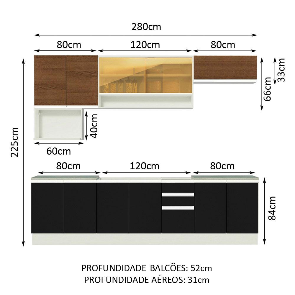 A Cozinha Completa Genova da linha Glamy da Madesa possui um design moderno e se destaca pelo ótimo acabamento. Um grande diferencial são os itens de qualidade superior, como puxadores em perfil total de alumínio, gavetas com corrediças telescópicas e portas com amortecedor para o fechamento suave.O armário aéreo com portas de correr de vidro reflex traz sofisticação ao ambiente, podendo revelar sutilmente o interior do móvel ou refletir o espaço, variando de acordo com a iluminação. Outra característica especial desta cozinha é a profundidade maior, como uma cozinha planejada: 52 cm nos módulos inferiores e 31 cm nos aéreos. Para completar, possui pés reguláveis em PVC e rodapé removível.Medidas totais da cozinha: 280 cm de largura e 225 cm de altura. O balcão de pia comporta pias de 120 cm x 52 cm. Não acompanha tampo.O acabamento da estrutura interna e externa é branco. As portas dos balcões e as frentes das gavetas são pretas. As portas dos aéreos são no padrão amadeirado Rustic. O processo é feito em Pintura Poliéster com 7 camadas de proteção resistentes a álcool, água e calor. Além disso, é ecológico, isento de vapores que vão para a atmosfera.Esta cozinha pode ser complementada pelos módulos avulsos da linha Glamy da Madesa.(As imagens são meramente ilustrativas. Os eletros, o tampo da pia, a torneira e a decoração não acompanham o produto.)Itens inclusos:- Um (1) armário aéreo de 80 cm com duas (2) portas- Um (1) nicho de 60 cm para forno- Um (1) armário aéreo de 120 cm com duas (2) portas de correr de vidro Reflex e um (1) nicho- Um (1) balcão de 120 cm com duas (2) portas, três (3) gavetas (não acompanha o tampo deste balcão)- Um (1) armário aéreo de 80 cm com uma (1) porta basculante com pistão a gás- Dois (2) balcões de 80 cm, cada um com duas (2) portas e tampo em MDP em pintura MoodCódigo do produto: GRGL280004D7Obs.: A Madesa não disponibiliza serviço de montagem. O produto segue com manual de instalação e todas as ferragens necessárias para sua montagem.1 – O produto é novo ou usado?R.: Todos os produtos da Madesa são novos, enviados da nossa fábrica diretamente para as casas de nossos clientes.2 – O produto vem montado? Se não, vocês realizam a montagem?R.: A Madesa não disponibiliza serviço de montagem. Todos os produtos seguem com manual de instalação e as ferragens necessárias. Alguns produtos possuem vídeo explicando o passo a passo da montagem.3 – Vocês possuem loja física? Posso retirar meu produto em mãos?R.: Não possuímos loja física, apenas loja virtual. Confira as opções de envio ao colocar o seu CEP.4 – Qual é o valor do envio? Posso pagar separadamente?R.: O valor do envio é calculado com base no peso e volume do produto, e no CEP de destino. Você pode calcular o valor e prazo de entrega no simulador.5 – A Madesa entrega em todo Brasil? Como é feita a entrega?R.: Sim, entregamos no Brasil inteiro através de transportadoras parceiras.6 – Os produtos possuem garantia?R.: Sim. A Madesa oferece 3 meses de garantia para defeitos de fabricação.A Madesa se dedica à sustentabilidade com várias iniciativas: temos uma usina própria para gerar energia que abastece uma de nossas fábricas. Selecionamos nossos fornecedores, priorizando aqueles que possuem um compromisso com a sustentabilidade e proteção do meio ambiente. Todo o plástico utilizado no setor produtivo é proveniente de reciclagem e as suas sobras são encaminhadas ao fornecedor que os recicla. Também investimos no desenvolvimento contínuo de nossos colaboradores e em ações educacionais que beneficiem a comunidade.