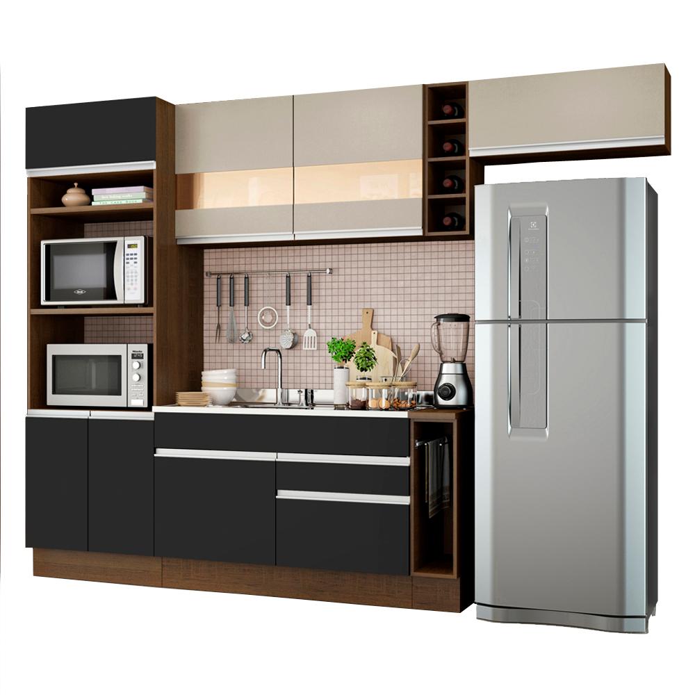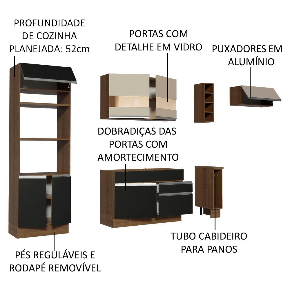A Cozinha Safira da linha Glamy é uma das campeãs de vendas da Madesa. Se destaca por parecer uma cozinha planejada com ótimo aproveitamento dos espaços internos.As gavetas possuem corrediça telescópica e todas as portas contam com dobradiças com amortecimento para o fechamento suave. O armário aéreo maior possui detalhe em vidro reflex nas portas, diferencial que traz beleza e sofisticação ao produto.Outro grande diferencial desta cozinha é a profundidade maior, como uma cozinha planejada: 52 cm no balcão inferior e 31 cm nos aéreos. As medidas totais são: 290 cm de largura e 225 cm de altura.O balcão de pia comporta pias de 120 cm x 52 cm. Todos os módulos inferiores possuem também pés reguláveis e rodapé removível.A torre possui espaço para forno e micro-ondas e permite a instalação de forno embutido.O acabamento da estrutura interna e externa é no padrão amadeirado Rustic. As portas do aéreos são em pintura Crema e as demais portas e frentes das gavetas são pretas. O processo é feito em Pintura Poliéster de alta resistência, processo ecológico e que aumenta a qualidade e durabilidade do produto.Esta cozinha pode ser complementada pelos módulos avulsos da linha Glamy da Madesa.(Imagens meramente ilustrativas: os eletros, o tampo da pia, a torneira e a decoração não acompanham o produto.)Itens inclusos:- Uma (1) torre quente com dois (2) nichos para forno e micro-ondas, um (1) nicho menor e três (3) portas sendo uma (1) basculante- Um (1) balcão de pia com duas (2) gavetas e uma (1) porta (não acompanha tampo)- Um (1) balcão porta panos com tampo Mood- Um (1) armário aéreo com duas (2) portas com detalhe em vidro reflex- Uma (1) mini adega- Um (1) armário aéreo com uma (1) porta basculanteCódigo do produto: GRGL290003C3Obs.: A Madesa não disponibiliza serviço de montagem. O produto segue com manual de instalação e todas as ferragens necessárias para sua montagem.1-O produto é novo ou usado?R.: Todos os produtos da Madesa são novos, enviados da nossa fábrica diretamente para as casas de nossos clientes.2-O produto vem montado? Se não, vocês realizam a montagem?R.: A Madesa não disponibiliza serviço de montagem. Todos os produtos seguem com manual de instalação e as ferragens necessárias. Alguns produtos possuem vídeo explicando o passo a passo da montagem.3-Vocês possuem loja física? Posso retirar meu produto em mãos?R.: Não possuímos loja física, apenas loja virtual. Confira as opções de envio ao colocar o seu CEP.4-Qual é o valor do envio? Posso pagar separadamente?R.: O valor do envio é calculado com base no peso e volume do produto, e no CEP de destino. Você pode calcular o valor e prazo de entrega no simulador.5-A Madesa entrega em todo Brasil? Como é feita a entrega?R.: Sim, entregamos no Brasil inteiro através de transportadoras parceiras.6-O produto acompanha Nota Fiscal?R.: Sim, todos os produtos são entregues com suas respectivas notas fiscais.7-Os produtos possuem garantia?R.: Sim. A Madesa oferece 3 meses de garantia para defeitos de fabricação.A Madesa se dedica à sustentabilidade com várias iniciativas: temos uma usina própria para gerar energia que abastece uma de nossas fábricas. Selecionamos nossos fornecedores, priorizando aqueles que possuem um compromisso com a sustentabilidade e proteção do meio ambiente. Todo o plástico utilizado no setor produtivo é proveniente de reciclagem e as suas sobras são encaminhadas ao fornecedor que os recicla. Também investimos no desenvolvimento contínuo de nossos colaboradores e em ações educacionais que beneficiem a comunidade.