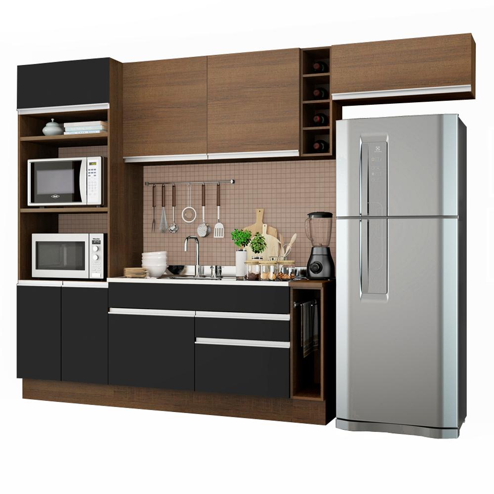 A Cozinha Safira da linha Glamy é uma das campeãs de vendas da Madesa. Se destaca por parecer uma cozinha planejada com ótimo aproveitamento dos espaços internos.As gavetas possuem corrediça telescópica e todas as portas contam com dobradiças com amortecimento para o fechamento suave. Esses itens de qualidade superior conferem durabilidade e maior vida útil ao móvel.Outro grande diferencial desta cozinha é a profundidade maior, como uma cozinha planejada: 52 cm no balcão inferior e 31 cm nos aéreos. As medidas totais são: 290 cm de largura e 225 cm de altura.O balcão de pia comporta pias de 120 cm x 52 cm. Todos os módulos inferiores possuem também pés reguláveis e rodapé removível.A torre possui espaço para forno e micro-ondas e permite a instalação de forno embutido.O acabamento da estrutura interna, externa e das portas do aéreos é no padrão amadeirado Rustic. As demais portas e frentes das gavetas são pretas. O processo é feito em Pintura Poliéster de alta resistência, processo ecológico e que aumenta a qualidade e durabilidade do produto.Esta cozinha pode ser complementada pelos módulos avulsos da linha Glamy da Madesa.(Imagens meramente ilustrativas: os eletros, o tampo da pia, a torneira e a decoração não acompanham o produto.)Itens inclusos:- Uma (1) torre quente com dois (2) nichos para forno e micro-ondas, um (1) nicho menor e três (3) portas sendo uma (1) basculante- Um (1) balcão de pia com duas (2) gavetas e uma (1) porta (não acompanha tampo)- Um (1) balcão porta panos com tampo Rustic- Um (1) armário aéreo com duas (2) portas- Uma (1) mini adega- Um (1) armário aéreo com uma (1) porta basculanteCódigo do produto: GRGL290004C1Obs.: A Madesa não disponibiliza serviço de montagem. O produto segue com manual de instalação e todas as ferragens necessárias para sua montagem.1-O produto é novo ou usado?R.: Todos os produtos da Madesa são novos, enviados da nossa fábrica diretamente para as casas de nossos clientes.2-O produto vem montado? Se não, vocês realizam a montagem?R.: A Madesa não disponibiliza serviço de montagem. Todos os produtos seguem com manual de instalação e as ferragens necessárias. Alguns produtos possuem vídeo explicando o passo a passo da montagem.3-Vocês possuem loja física? Posso retirar meu produto em mãos?R.: Não possuímos loja física, apenas loja virtual. Confira as opções de envio ao colocar o seu CEP.4-Qual é o valor do envio? Posso pagar separadamente?R.: O valor do envio é calculado com base no peso e volume do produto, e no CEP de destino. Você pode calcular o valor e prazo de entrega no simulador.5-A Madesa entrega em todo Brasil? Como é feita a entrega?R.: Sim, entregamos no Brasil inteiro através de transportadoras parceiras.6-O produto acompanha Nota Fiscal?R.: Sim, todos os produtos são entregues com suas respectivas notas fiscais.7-Os produtos possuem garantia?R.: Sim. A Madesa oferece 3 meses de garantia para defeitos de fabricação.A Madesa se dedica à sustentabilidade com várias iniciativas: temos uma usina própria para gerar energia que abastece uma de nossas fábricas. Selecionamos nossos fornecedores, priorizando aqueles que possuem um compromisso com a sustentabilidade e proteção do meio ambiente. Todo o plástico utilizado no setor produtivo é proveniente de reciclagem e as suas sobras são encaminhadas ao fornecedor que os recicla. Também investimos no desenvolvimento contínuo de nossos colaboradores e em ações educacionais que beneficiem a comunidade.