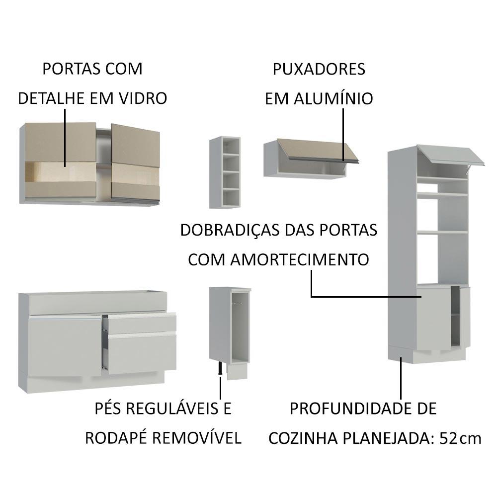 Fabricada com materiais de qualidade superior e com design seguindo tendências modernas, a Cozinha Cristal da linha Glamy da Madesa é uma grande opção para tornar o seu ambiente mais bonito e funcional.As gavetas contam com corrediças telescópicas e todas as portas possuem dobradiças com amortecimento para o fechamento suave. Além disso, todos os módulos são separados, assim você tem a possibilidade de montar a cozinha dos seus sonhos, conforme a necessidade do seu espaço.O balcão comporta pias de 120 cm x 52 cm. Todos os módulos inferiores possuem também pés reguláveis e rodapé removível.As medidas totais da cozinha são: 290 cm de largura x 225 cm de altura. A profundidade é de 52 cm nos balcões e no paneleiro e 31 cm nos aéreos.O acabamento de toda a cozinha é branco, com exceção das portas dos aéreos, que possuem pintura Crema. O processo é feito em Poliéster Protetor ecológico de alta resistência, que protege o móvel dos efeitos da água, do álcool e do calor.Esta cozinha pode ser complementada pelos módulos avulsos da linha Glamy da Madesa.(As imagens são meramente ilustrativas: os eletros, o tampo da pia, a torneira e a decoração não acompanham o produto.)Itens inclusos:- Um (1) balcão de pia com duas (2) gavetas e uma (1) porta (não acompanha tampo)- Um (1) balcão porta panos com tampo de MDP em pintura Mood- Um (1) aéreo com duas (2) portas com detalhe em vidro Reflex- Uma (1) adega- Um (1) aéreo com uma (1) porta basculante- Uma (1) torre quente com dois (2) nichos para forno e micro-ondas, um (1) nicho menor e três (3) portas, sendo uma basculanteCódigo do produto: GRGL290009A5Obs.: A Madesa não disponibiliza serviço de montagem. O produto segue com manual de instalação e todas as ferragens necessárias para sua montagem.1-O produto é novo ou usado?R.: Todos os produtos da Madesa são novos, enviados da nossa fábrica diretamente para as casas de nossos clientes.2-O produto vem montado? Se não, vocês realizam a montagem?R.: A Madesa não disponibiliza serviço de montagem. Todos os produtos seguem com manual de instalação e as ferragens necessárias. Alguns produtos possuem vídeo explicando o passo a passo da montagem.3-Vocês possuem loja física? Posso retirar meu produto em mãos?R.: Não possuímos loja física, apenas loja virtual. Confira as opções de envio ao colocar o seu CEP.4-Qual é o valor do envio? Posso pagar separadamente?R.: O valor do envio é calculado com base no peso e volume do produto, e no CEP de destino. Você pode calcular o valor e prazo de entrega no simulador.5-A Madesa entrega em todo Brasil? Como é feita a entrega?R.: Sim, entregamos no Brasil inteiro através de transportadoras parceiras.6-O produto acompanha Nota Fiscal?R.: Sim, todos os produtos são entregues com suas respectivas notas fiscais.7-Os produtos possuem garantia?R.: Sim. A Madesa oferece 3 meses de garantia para defeitos de fabricação.A Madesa se dedica à sustentabilidade com várias iniciativas: temos uma usina própria para gerar energia que abastece uma de nossas fábricas. Selecionamos nossos fornecedores, priorizando aqueles que possuem um compromisso com a sustentabilidade e proteção do meio ambiente. Todo o plástico utilizado no setor produtivo é proveniente de reciclagem e as suas sobras são encaminhadas ao fornecedor que os recicla. Também investimos no desenvolvimento contínuo de nossos colaboradores e em ações educacionais que beneficiem a comunidade.