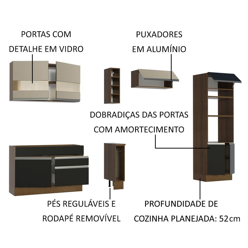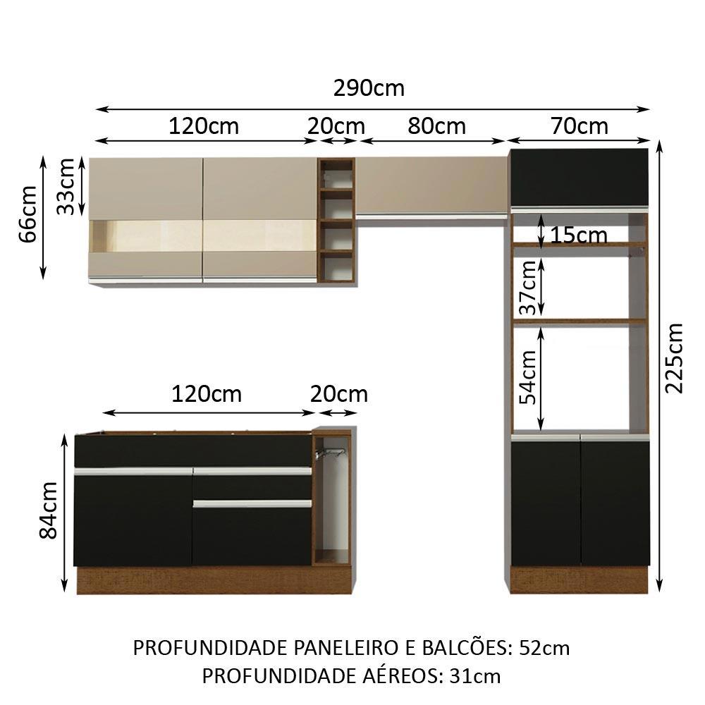 Fabricada com materiais de qualidade superior e com design seguindo tendências modernas, a Cozinha Cristal da linha Glamy da Madesa é uma grande opção para tornar o seu ambiente mais bonito e funcional.As gavetas contam com corrediças telescópicas e todas as portas possuem dobradiças com amortecimento para o fechamento suave. Além disso, todos os módulos são separados, assim você tem a possibilidade de montar a cozinha dos seus sonhos, conforme a necessidade do seu espaço.O balcão comporta pias de 120 cm x 52 cm. Todos os módulos inferiores possuem também pés reguláveis e rodapé removível.As medidas totais da cozinha são: 290 cm de largura x 225 cm de altura. A profundidade é de 52 cm nos balcões e no paneleiro e 31 cm nos aéreos.A torre possui espaço para forno e micro-ondas e permite a instalação de forno embutido.O acabamento da estrutura é no padrão amadeirado Rustic. As portas da torre e do balcão e as frentes das gavetas são pretas. As portas dos aéreos são em pintura Crema e a parte interna das costas e das gavetas é em pintura branca. O processo é feito em Pintura Poliéster ecológica de alta resistência, que aumenta a qualidade e durabilidade do produto.Esta cozinha pode ser complementada pelos módulos avulsos da linha Glamy da Madesa.(As imagens são meramente ilustrativas: os eletros, o tampo da pia, a torneira e a decoração não acompanham o produto.)Itens inclusos:- Um (1) balcão de pia com duas (2) gavetas e uma (1) porta (não acompanha tampo)- Um (1) balcão porta panos com tampo de MDP em pintura amadeirado Rustic- Um (1) aéreo com duas (2) portas com detalhe em vidro Reflex- Uma (1) adega- Um (1) aéreo com uma (1) porta basculante- Uma (1) torre quente com dois (2) nichos para forno e micro-ondas, um (1) nicho menor e três (3) portas, sendo uma basculanteCódigo do produto: GRGL290009C3Obs.: A Madesa não disponibiliza serviço de montagem. O produto segue com manual de instalação e todas as ferragens necessárias para sua montagem.1-O produto é novo ou usado?R.: Todos os produtos da Madesa são novos, enviados da nossa fábrica diretamente para as casas de nossos clientes.2-O produto vem montado? Se não, vocês realizam a montagem?R.: A Madesa não disponibiliza serviço de montagem. Todos os produtos seguem com manual de instalação e as ferragens necessárias. Alguns produtos possuem vídeo explicando o passo a passo da montagem.3-Vocês possuem loja física? Posso retirar meu produto em mãos?R.: Não possuímos loja física, apenas loja virtual. Confira as opções de envio ao colocar o seu CEP.4-Qual é o valor do envio? Posso pagar separadamente?R.: O valor do envio é calculado com base no peso e volume do produto, e no CEP de destino. Você pode calcular o valor e prazo de entrega no simulador.5-A Madesa entrega em todo Brasil? Como é feita a entrega?R.: Sim, entregamos no Brasil inteiro através de transportadoras parceiras.6-O produto acompanha Nota Fiscal?R.: Sim, todos os produtos são entregues com suas respectivas notas fiscais.7-Os produtos possuem garantia?R.: Sim. A Madesa oferece 3 meses de garantia para defeitos de fabricação.A Madesa se dedica à sustentabilidade com várias iniciativas: temos uma usina própria para gerar energia que abastece uma de nossas fábricas. Selecionamos nossos fornecedores, priorizando aqueles que possuem um compromisso com a sustentabilidade e proteção do meio ambiente. Todo o plástico utilizado no setor produtivo é proveniente de reciclagem e as suas sobras são encaminhadas ao fornecedor que os recicla. Também investimos no desenvolvimento contínuo de nossos colaboradores e em ações educacionais que beneficiem a comunidade.