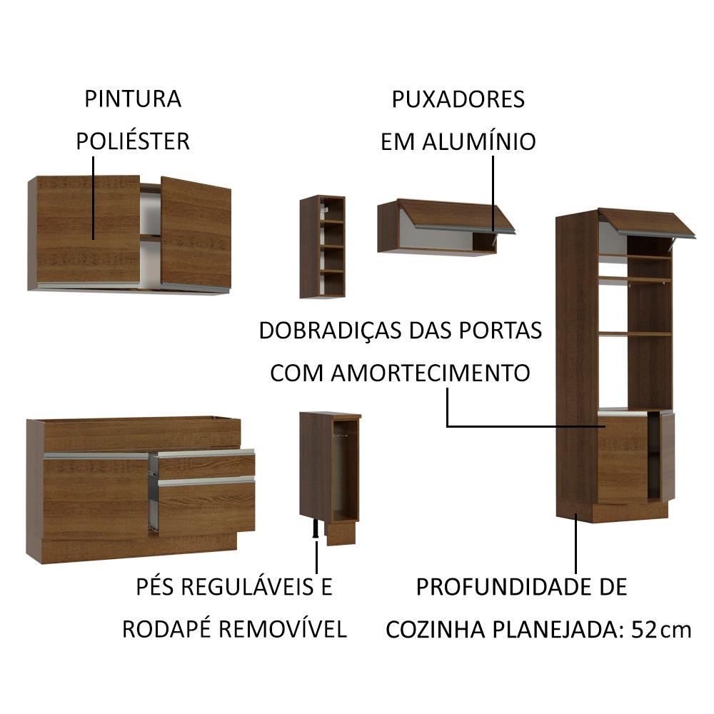 Fabricada com materiais de qualidade superior e com design seguindo tendências modernas, a Cozinha Cristal da linha Glamy da Madesa é uma grande opção para tornar o seu ambiente mais bonito e funcional.As gavetas contam com corrediças telescópicas e todas as portas possuem dobradiças com amortecimento para o fechamento suave. Além disso, todos os módulos são separados, assim você tem a possibilidade de montar a cozinha dos seus sonhos, conforme a necessidade do seu espaço.O balcão comporta pias de 120 cm x 52 cm. Todos os módulos inferiores possuem também pés reguláveis e rodapé removível.As medidas totais da cozinha são: 290 cm de largura x 225 cm de altura. A profundidade é de 52 cm nos balcões e no paneleiro e 31 cm nos aéreos.O acabamento da cozinha é no padrão amadeirado Rustic, com exceção das partes internas das costas e das gavetas, que são em pintura branca. O processo é feito em Pintura Poliéster ecológica de alta resistência, que aumenta a qualidade e durabilidade do produto.Esta cozinha pode ser complementada pelos módulos avulsos da linha Glamy da Madesa.(As imagens são meramente ilustrativas: os eletros, o tampo da pia, a torneira e a decoração não acompanham o produto.)Itens inclusos:- Um (1) balcão de pia com duas (2) gavetas e uma (1) porta (não acompanha tampo)- Um (1) balcão porta panos com tampo de MDP em pintura amadeirado Rustic- Um (1) aéreo com duas (2) portas- Uma (1) adega- Um (1) aéreo com uma (1) porta basculante- Uma (1) torre quente com dois (2) nichos para forno e micro-ondas, um (1) nicho menor e três (3) portas, sendo uma basculanteCódigo do produto: GRGL2900105ZObs.: A Madesa não disponibiliza serviço de montagem. O produto segue com manual de instalação e todas as ferragens necessárias para sua montagem.1-O produto é novo ou usado?R.: Todos os produtos da Madesa são novos, enviados da nossa fábrica diretamente para as casas de nossos clientes.2-O produto vem montado? Se não, vocês realizam a montagem?R.: A Madesa não disponibiliza serviço de montagem. Todos os produtos seguem com manual de instalação e as ferragens necessárias. Alguns produtos possuem vídeo explicando o passo a passo da montagem.3-Vocês possuem loja física? Posso retirar meu produto em mãos?R.: Não possuímos loja física, apenas loja virtual. Confira as opções de envio ao colocar o seu CEP.4-Qual é o valor do envio? Posso pagar separadamente?R.: O valor do envio é calculado com base no peso e volume do produto, e no CEP de destino. Você pode calcular o valor e prazo de entrega no simulador.5-A Madesa entrega em todo Brasil? Como é feita a entrega?R.: Sim, entregamos no Brasil inteiro através de transportadoras parceiras.6-O produto acompanha Nota Fiscal?R.: Sim, todos os produtos são entregues com suas respectivas notas fiscais.7-Os produtos possuem garantia?R.: Sim. A Madesa oferece 3 meses de garantia para defeitos de fabricação.A Madesa se dedica à sustentabilidade com várias iniciativas: temos uma usina própria para gerar energia que abastece uma de nossas fábricas. Selecionamos nossos fornecedores, priorizando aqueles que possuem um compromisso com a sustentabilidade e proteção do meio ambiente. Todo o plástico utilizado no setor produtivo é proveniente de reciclagem e as suas sobras são encaminhadas ao fornecedor que os recicla. Também investimos no desenvolvimento contínuo de nossos colaboradores e em ações educacionais que beneficiem a comunidade.